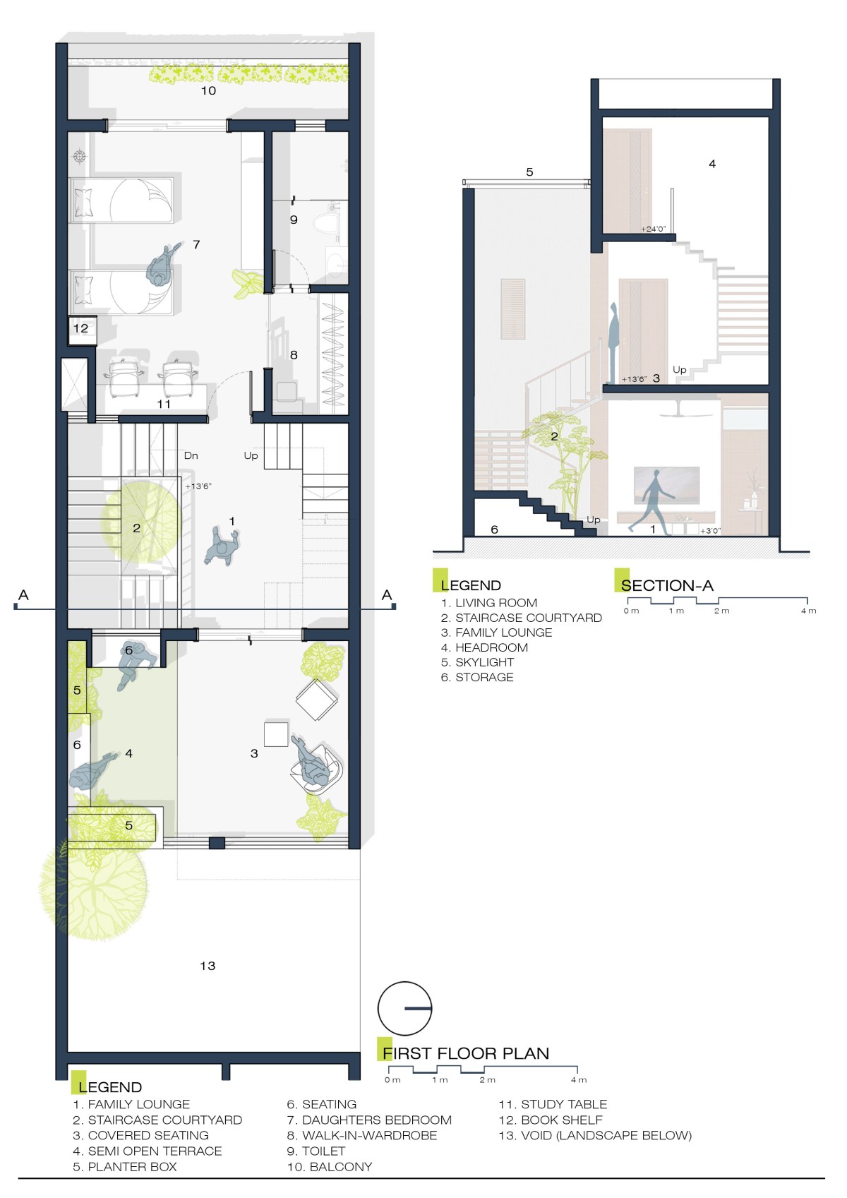 First Floor Plan & Section of The Narrow House by Sense of Space Architecture Studio