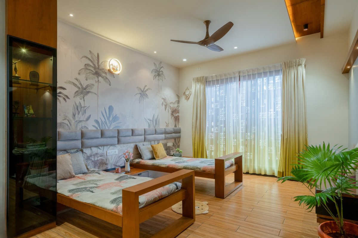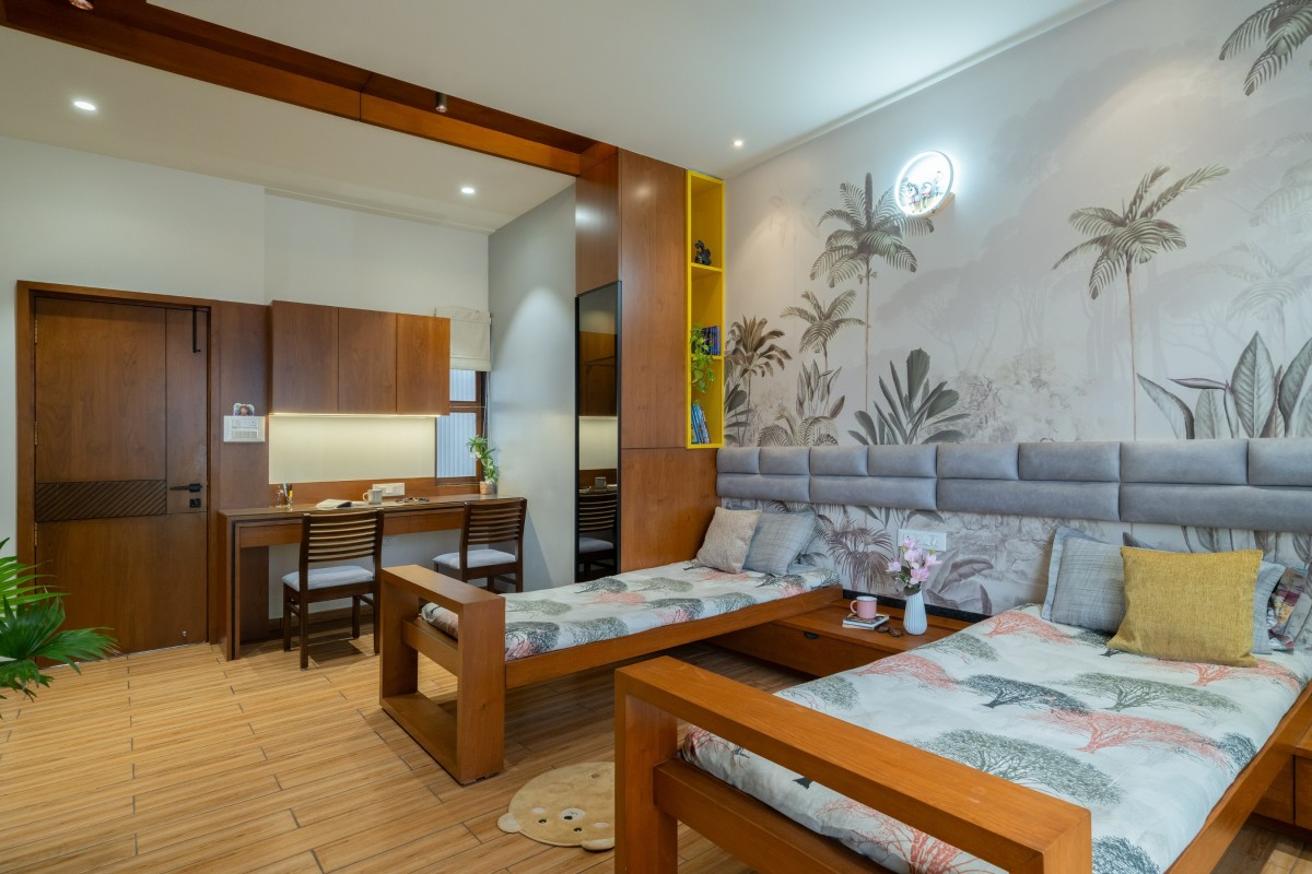 The first floor is a tranquil retreat, featuring a beautifully designed twin bedroom and a lush terrace garden that offers a serene escape. The daughter's bedroom combines soft hues, elegant patterns, and a tropical vibe, creating a peaceful ambiance with twin beds, luxurious comfort, soothing pastel tones, and a stunning botanical accent wall, all perfectly balanced by a bold tropical wallpaper that adds a vibrant touch while plush bedding and subtle textures invite relaxation.