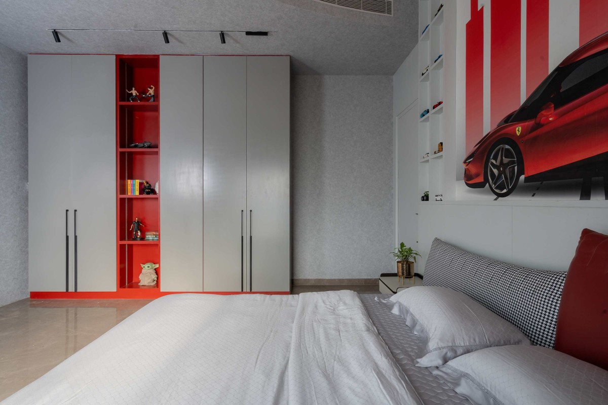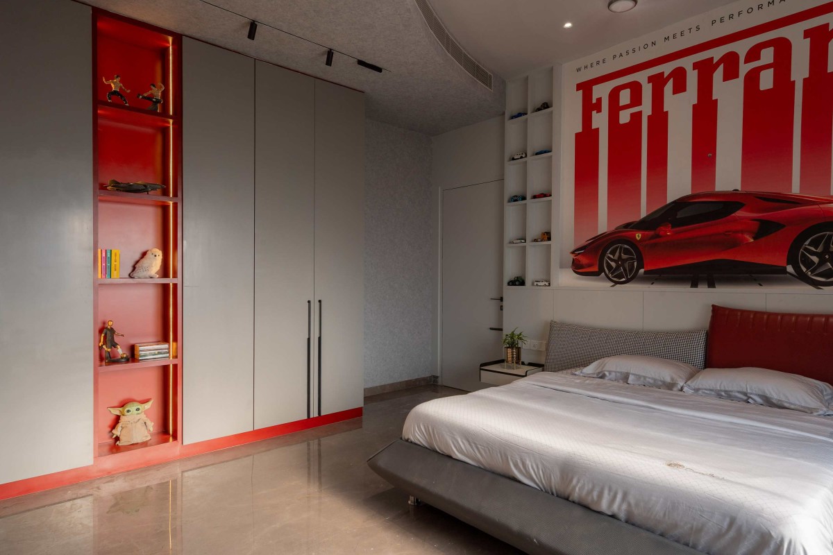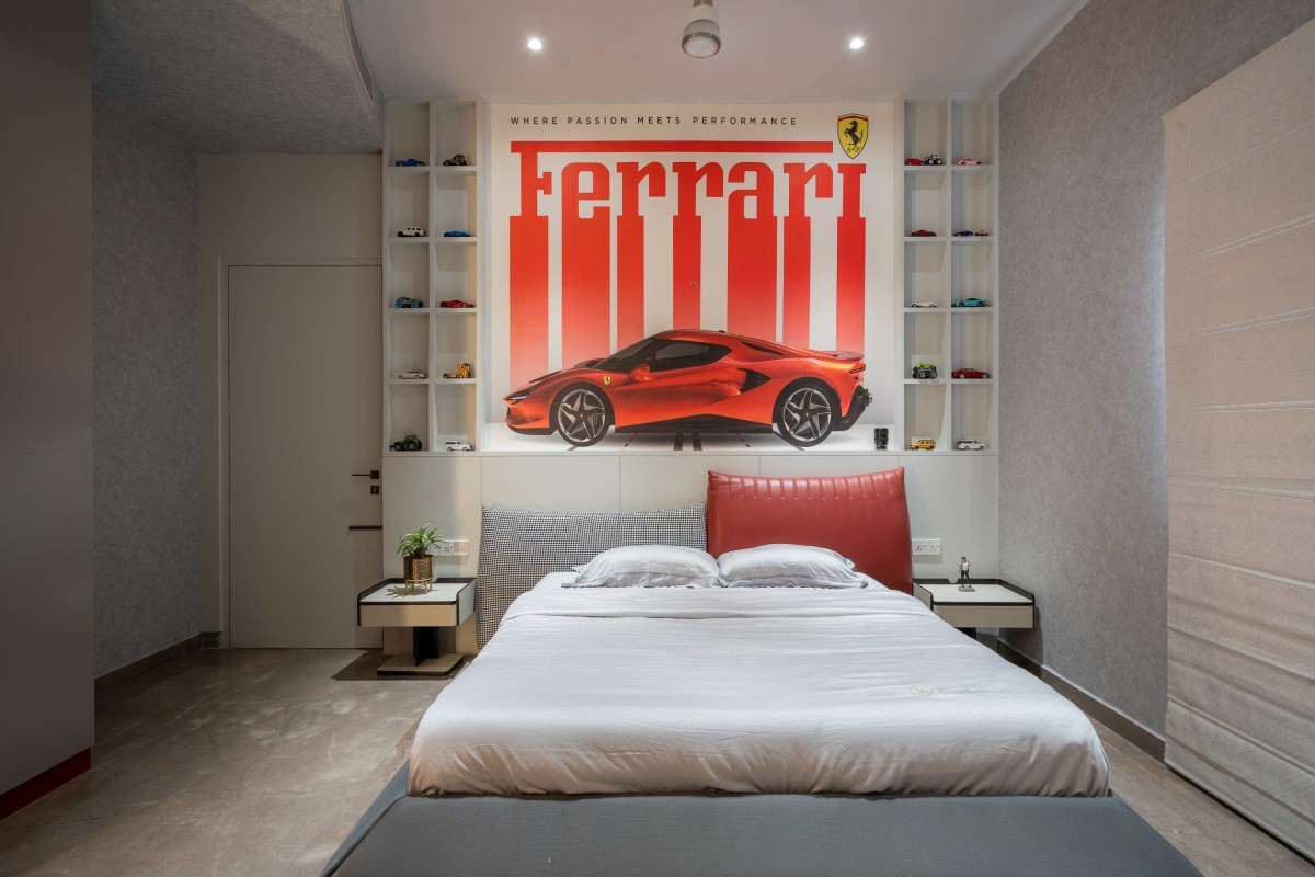 The living room features panelled walls with a concealed door, leading quietly to the parents’ bedroom for added privacy without interrupting the room's geometric flow. They are designed with a warm, inviting look—wood tones, wall mouldings, and tropical wallpapers lend a relaxed yet elegant character. The son’s Ferrari-themed bedroom stands out with its bold wall mural above the bed, shelves lined with model cars, and furniture that’s playful and sporty, placing his interests at the forefront.