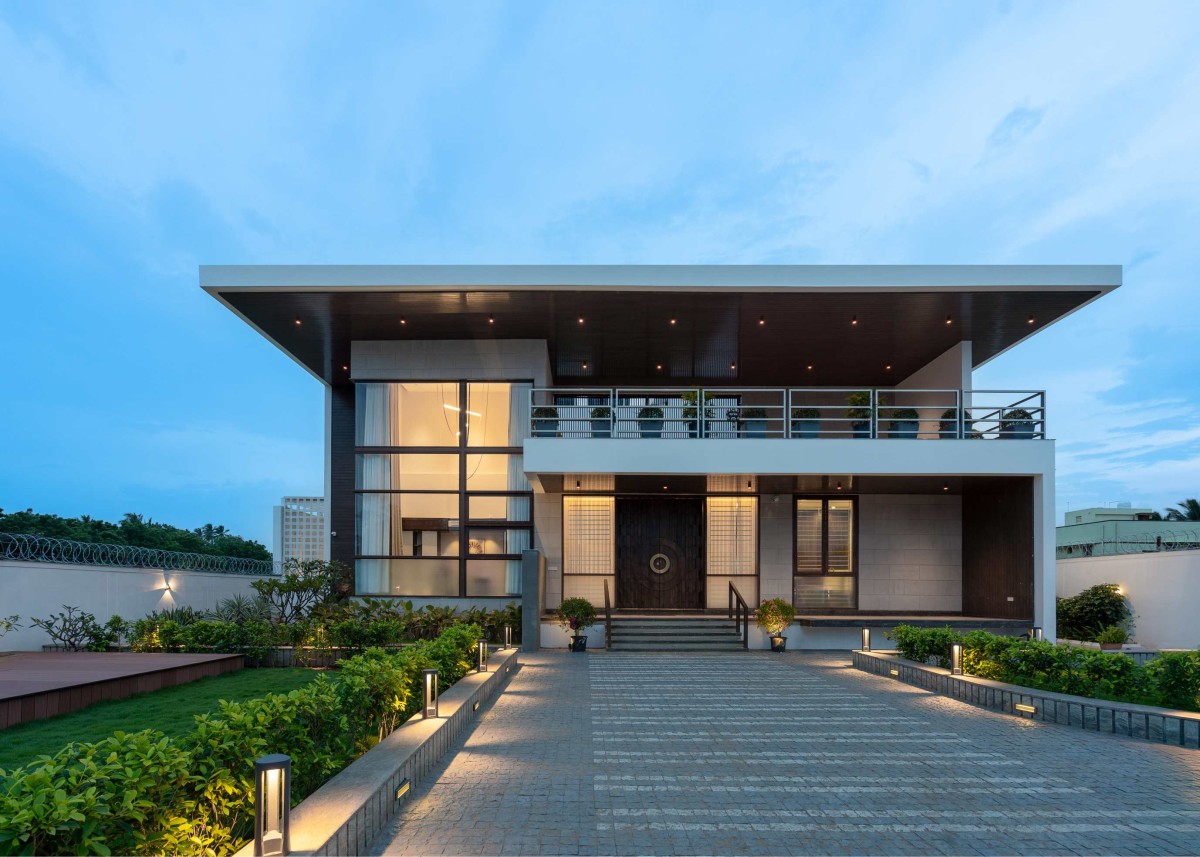 Dusk light exterior view of The Overhang Pavilion by Vyuham Design Studio