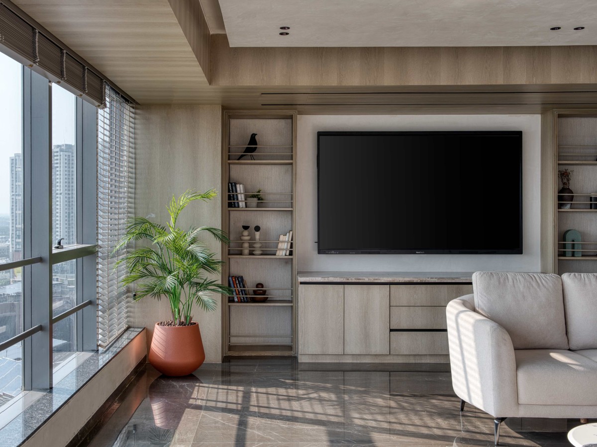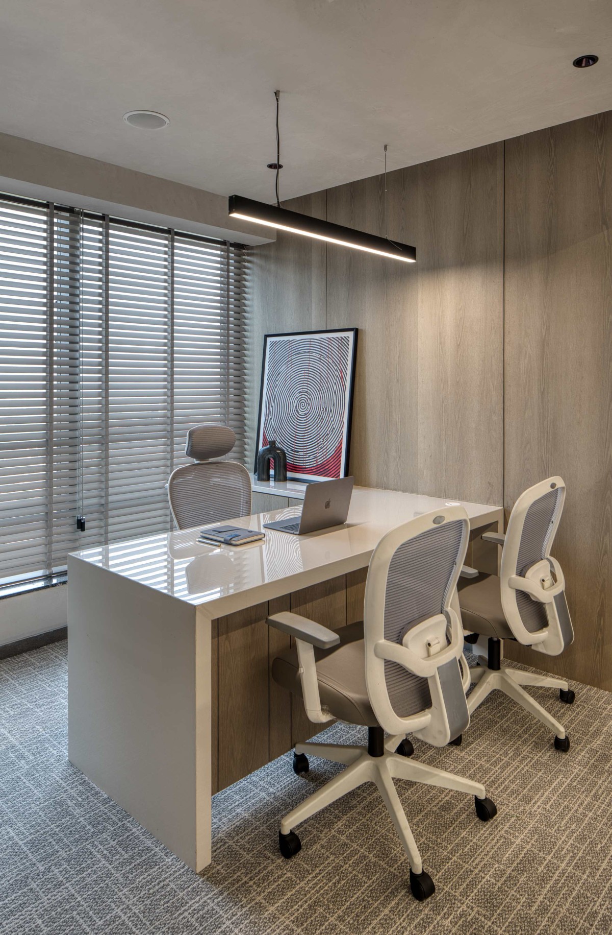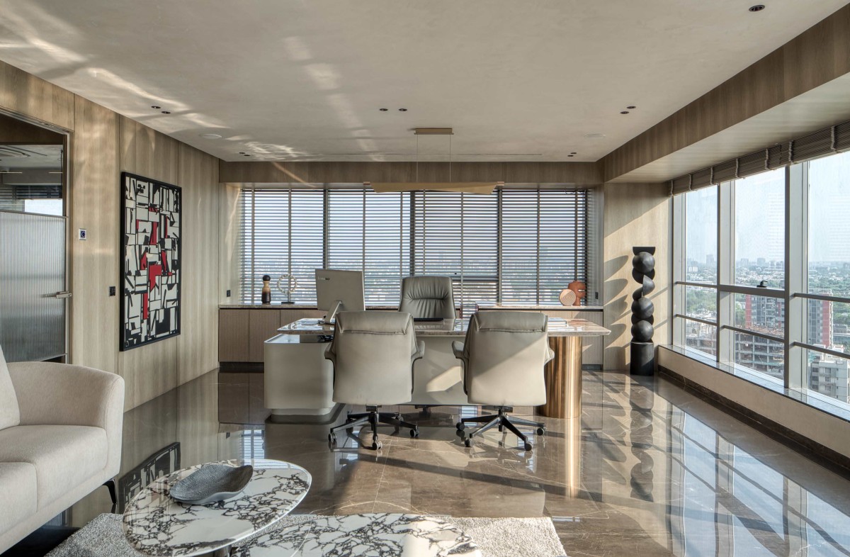The project combines custom-built elements with modular solutions to achieve efficiency without compromising on design intent. Marble flooring provides a refined and durable base, while veneer panels introduce warmth and tactile contrast. Fluted glass adds texture and subtle privacy, and metal elements contribute to a restrained industrial undertone. PU finishes ensure crisp detailing, while carpets define work zones and improve acoustic comfort. Select walls finished in lime wash soften the overall palette, lending depth and understated richness to the interiors.
