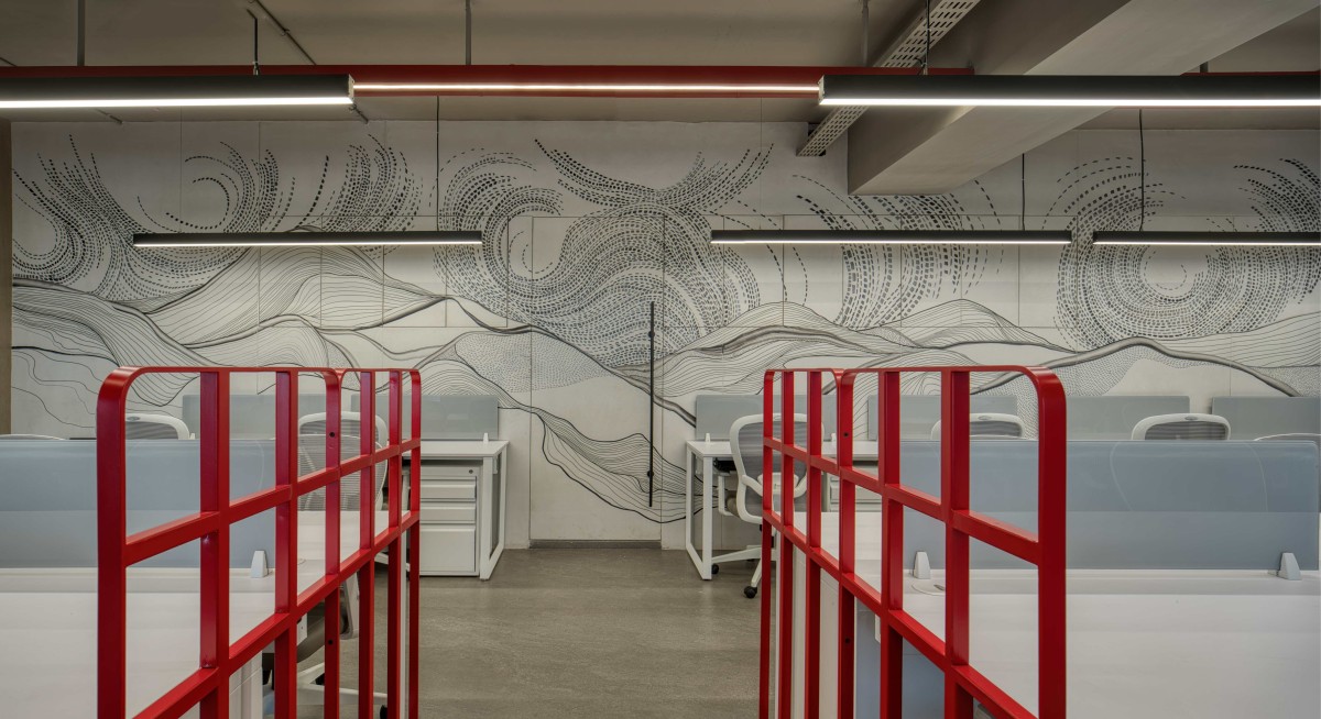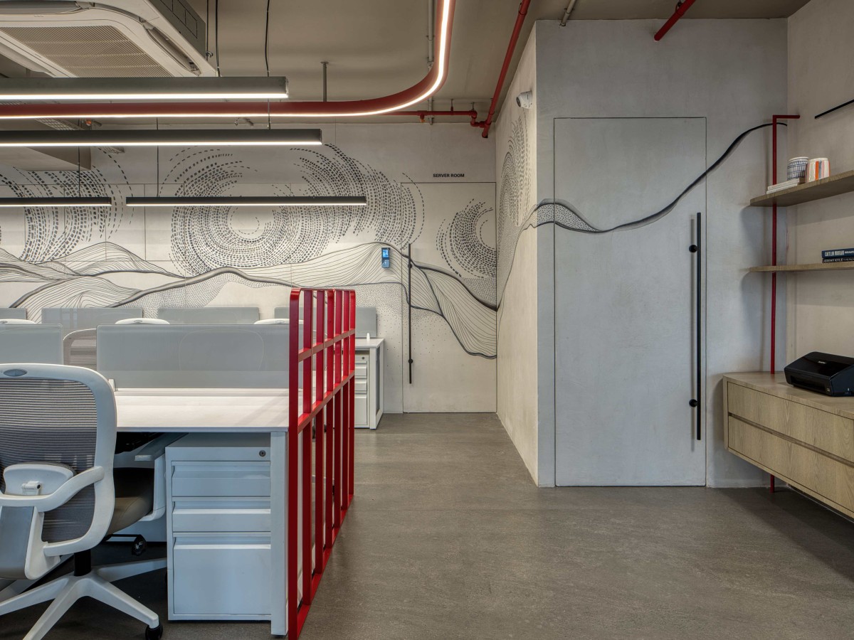 Among the many design features, the red ceiling accents paired with custom suspended lighting stand out as the defining element of the office. This gesture visually anchors the open spaces and reinforces the central concept, creating cohesion across different zones. It captures the essence of the project, confident yet restrained, expressive yet disciplined.