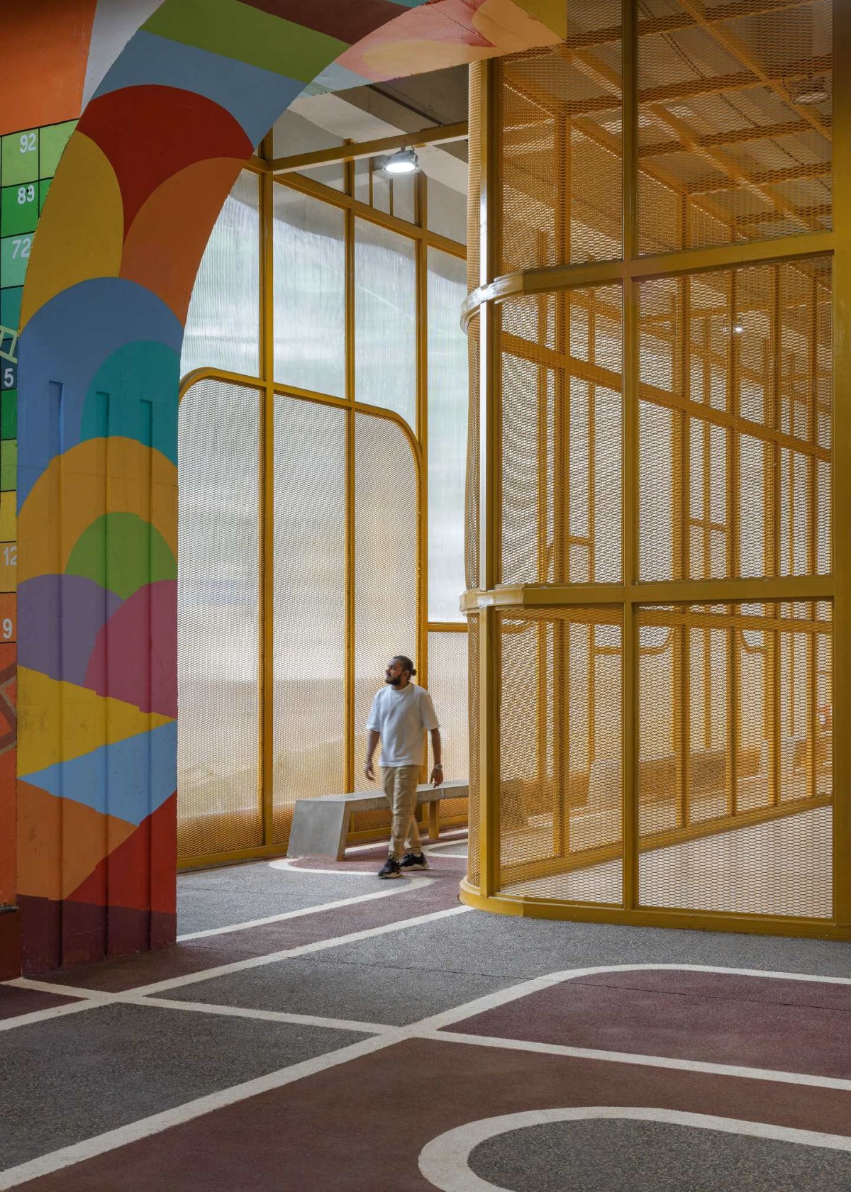 The spatial organisation unfolds through a gently meandering pedestrian spine, finished with textured stone chips that offer direction, grip, and an understated visual rhythm. This spine becomes the primary movement channel along which a series of enclosed micro-cement courts are arranged. These courts—robust, low-maintenance, and engineered for performance—bring together the needs of a wide spectrum of sports and users. A lightweight envelope of aluminium mesh and polycarbonate wraps the courts, creating a semi-permeable skin that ensures safety, mitigates noise from the busy junctions outside, and allows natural light to filter through. It strikes a harmonious balance between enclosure and openness—providing security without sacrificing breathability or visual connectivity.