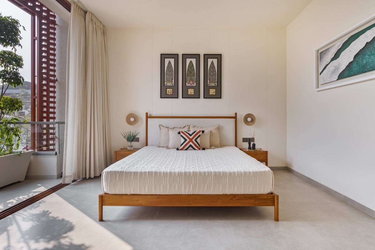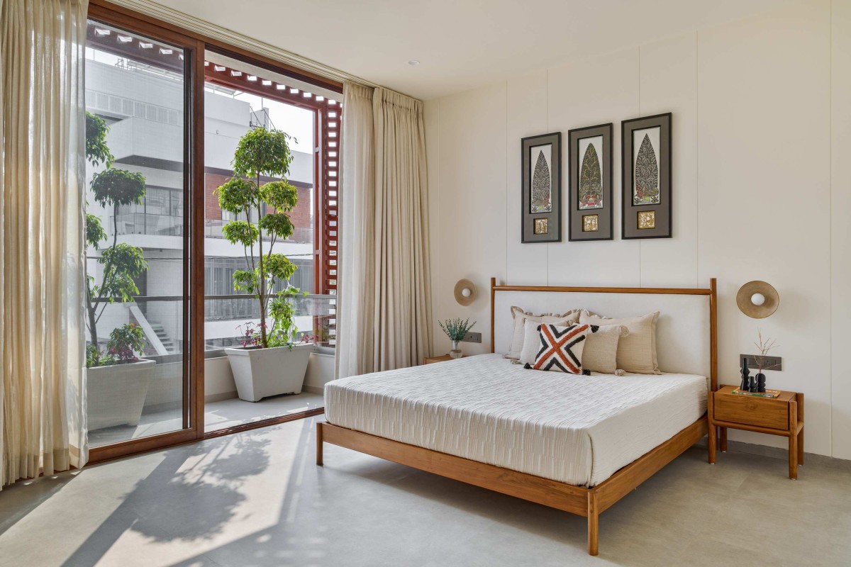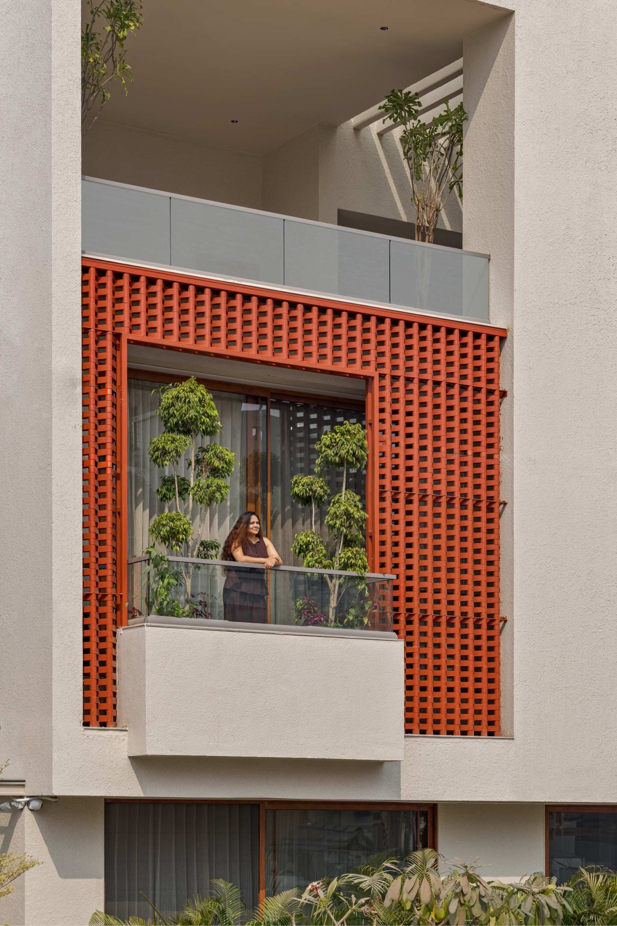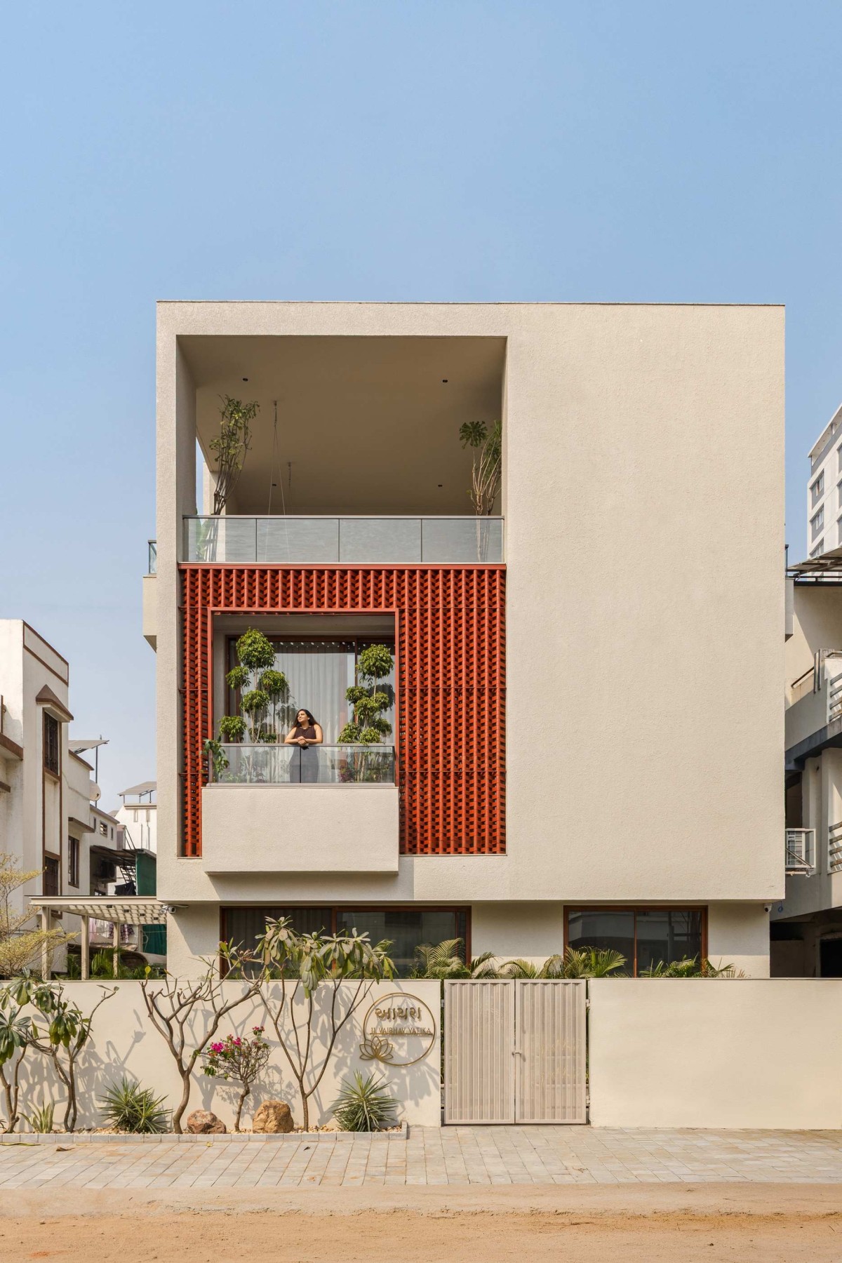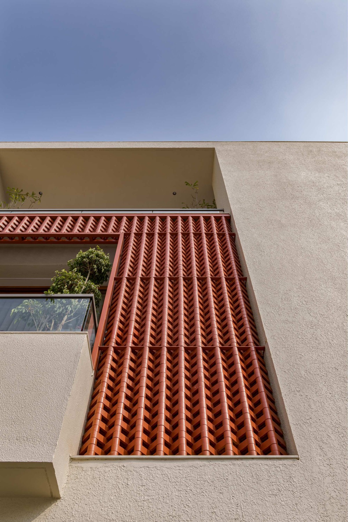 The south facade, traditionally the most vulnerable to heat, is articulated with a terracotta block screen. This functional skin serves as a thermal buffer for the master bedroom, transforming the midday glare into a soft, dappled tapestry of shadows. Above, the terrace is crowned with a pergola, which acts as a rhythmic filter, marking the passage of time through its changing shadow patterns on the floor.