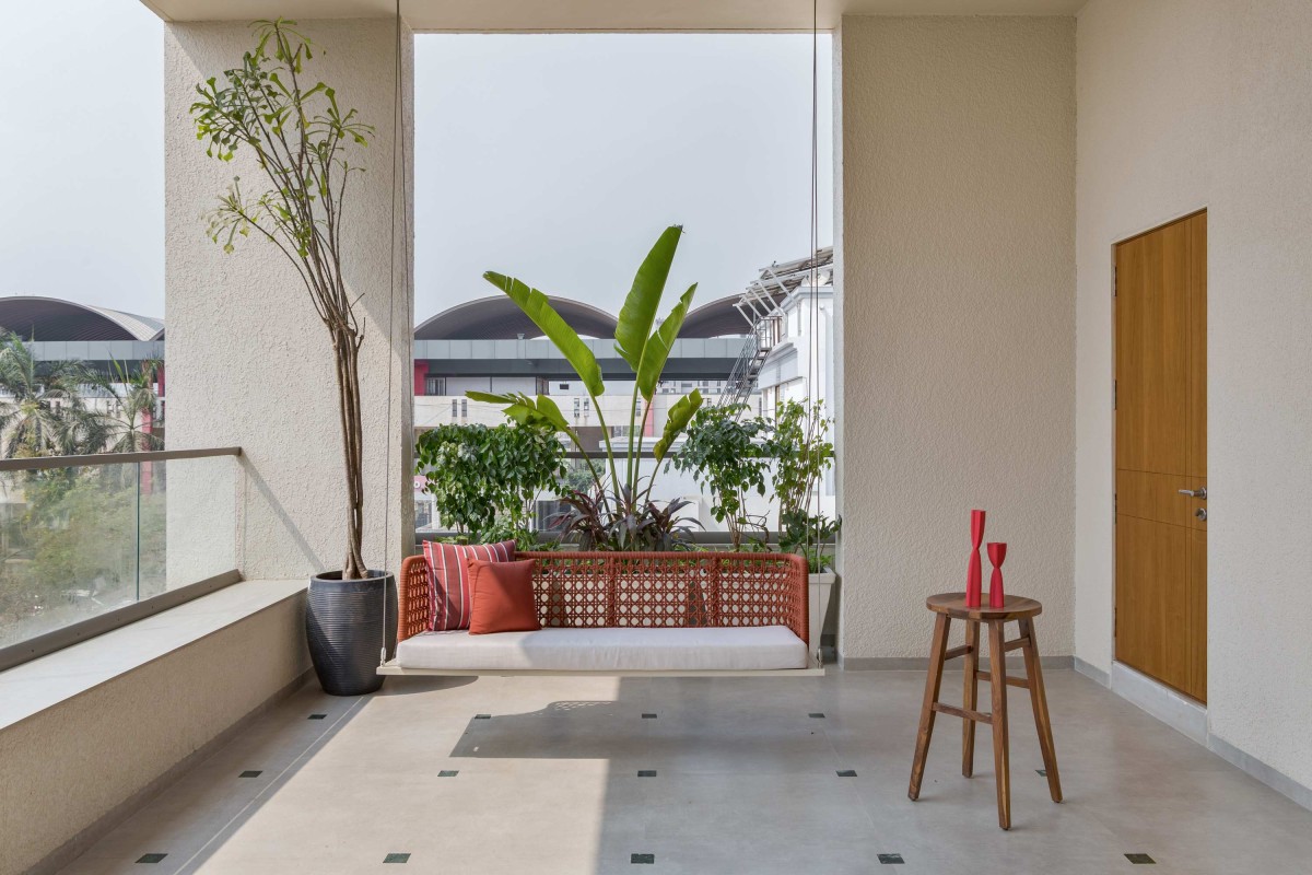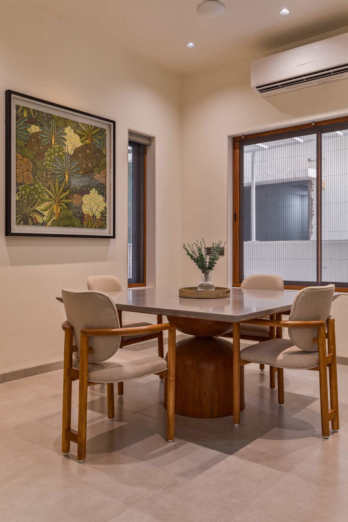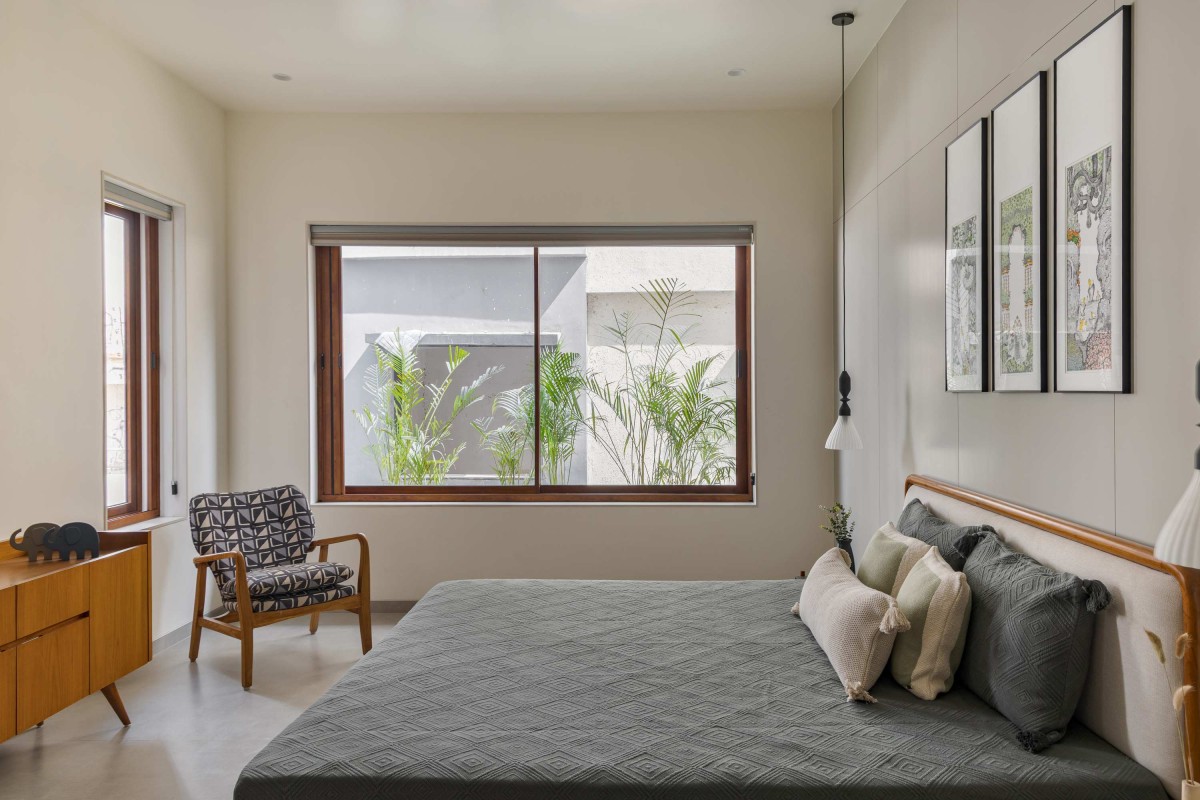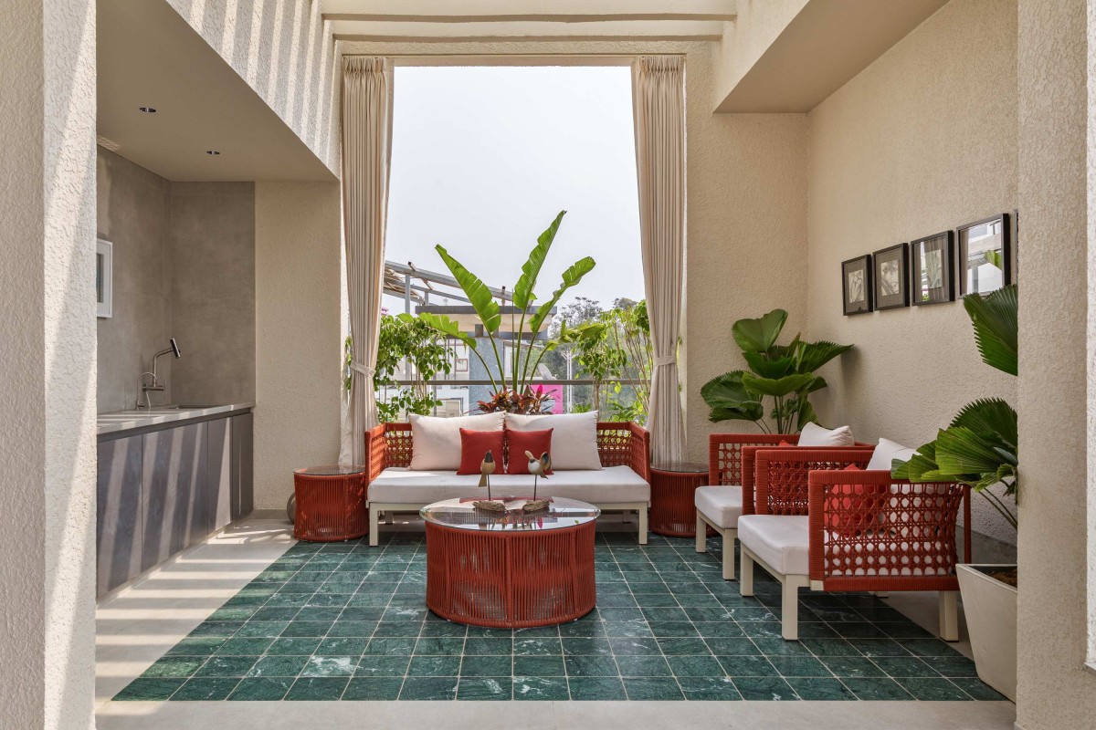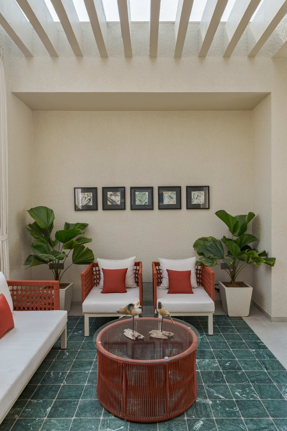 The south facade, traditionally the most vulnerable to heat, is articulated with a terracotta block screen. This functional skin serves as a thermal buffer for the master bedroom, transforming the midday glare into a soft, dappled tapestry of shadows. Above, the terrace is crowned with a pergola, which acts as a rhythmic filter, marking the passage of time through its changing shadow patterns on the floor.