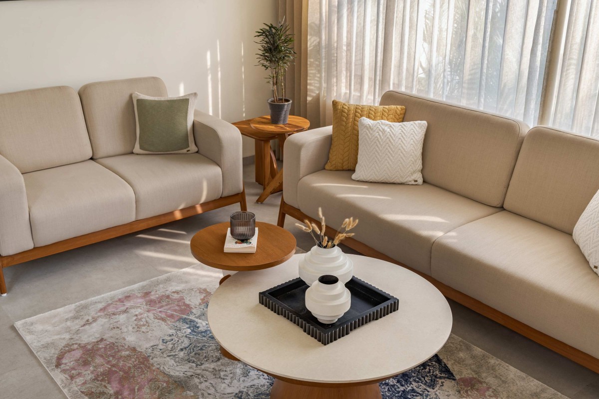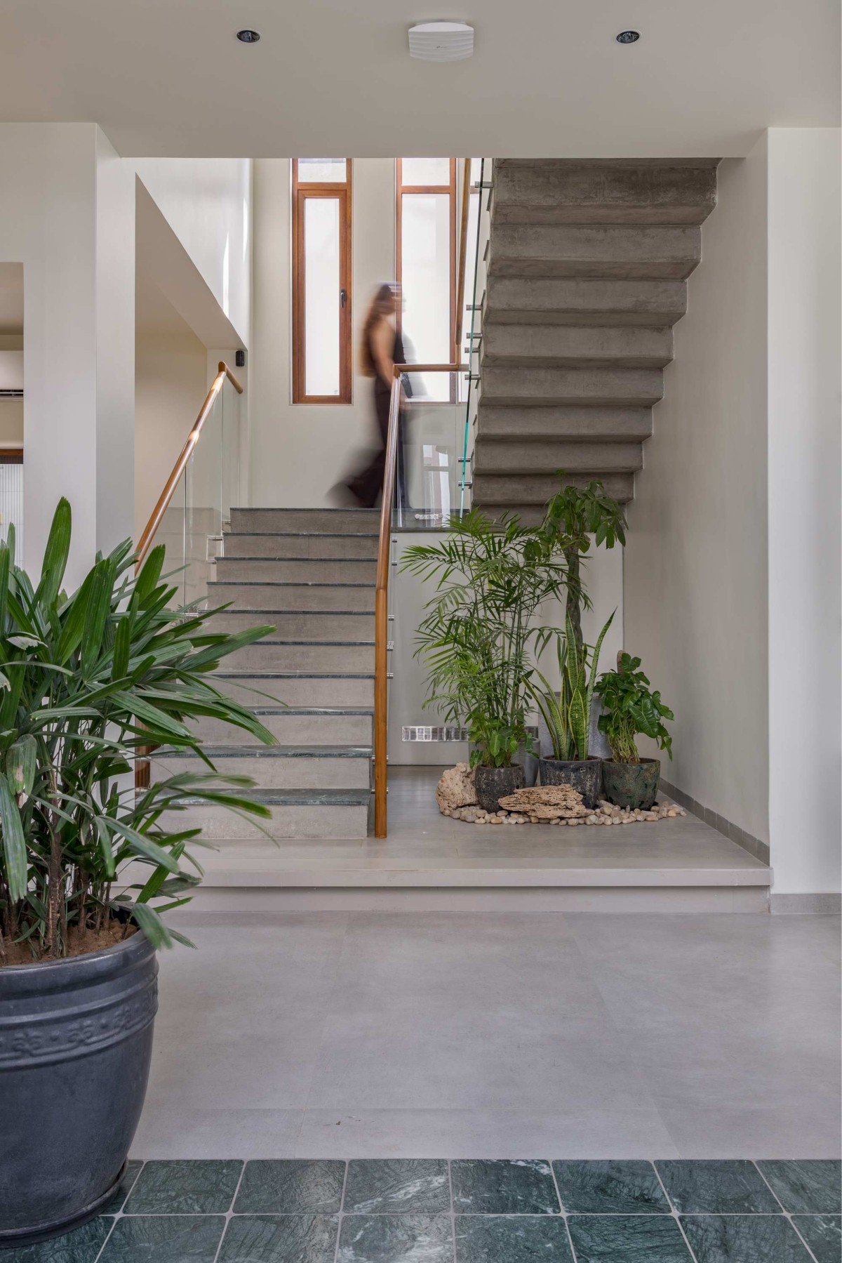 The ground floor is defined by two primary axes: one with the living, courtyard, and kitchen, and the other linking the courtyard to the vertical circulation of the staircase. This floor houses the public zones and a bedroom; all focused around the central void. As one ascends, the transition is marked by a bridge passage on the first floor. This architectural element acts as a physical and visual link, overlooking the courtyard below and reinforcing the sense of familial connectivity.