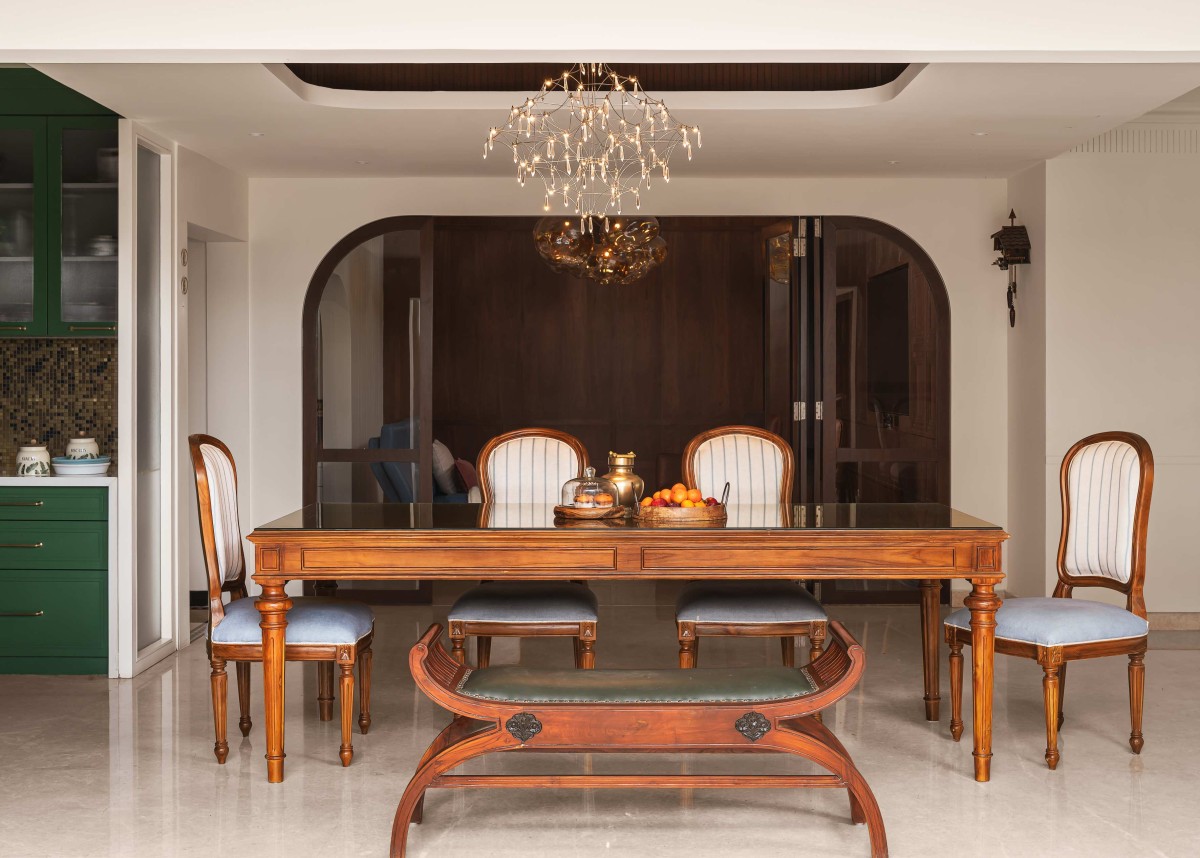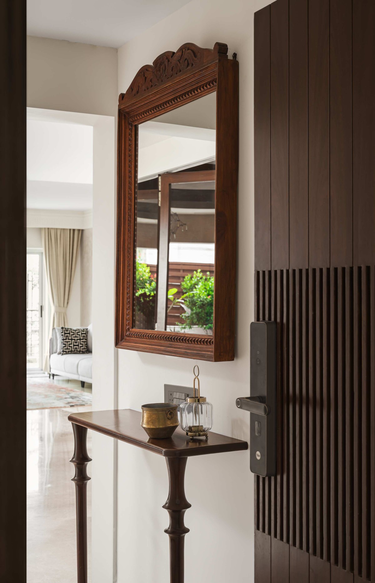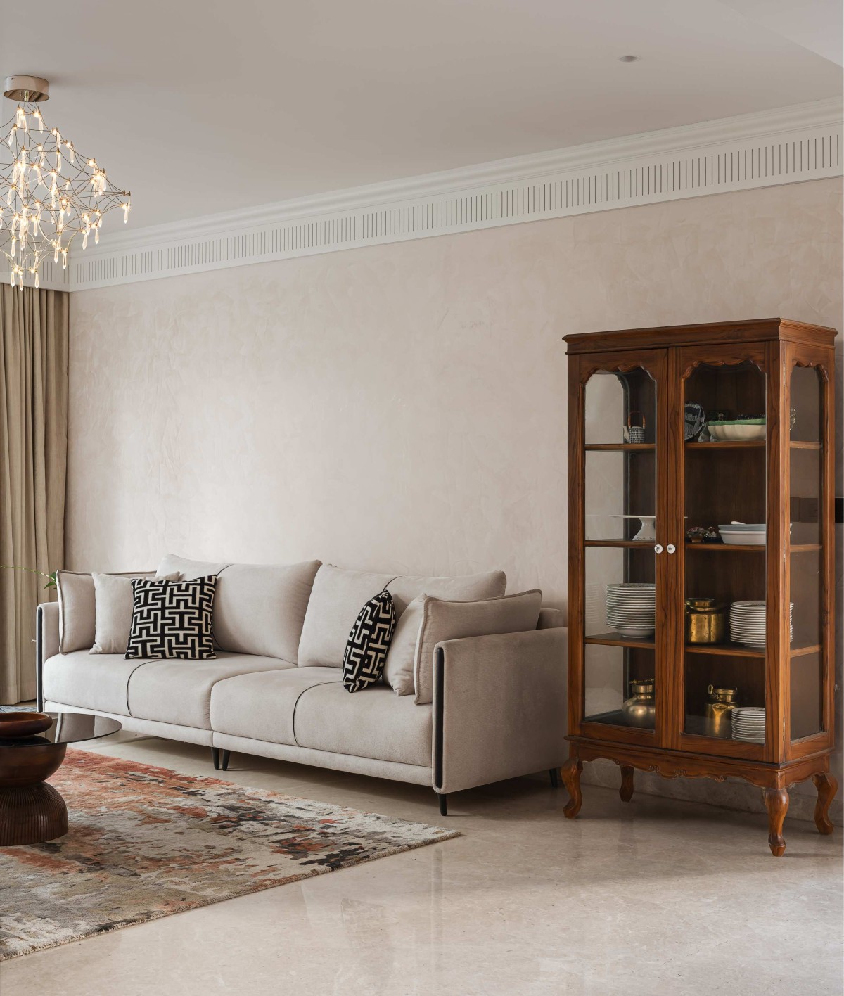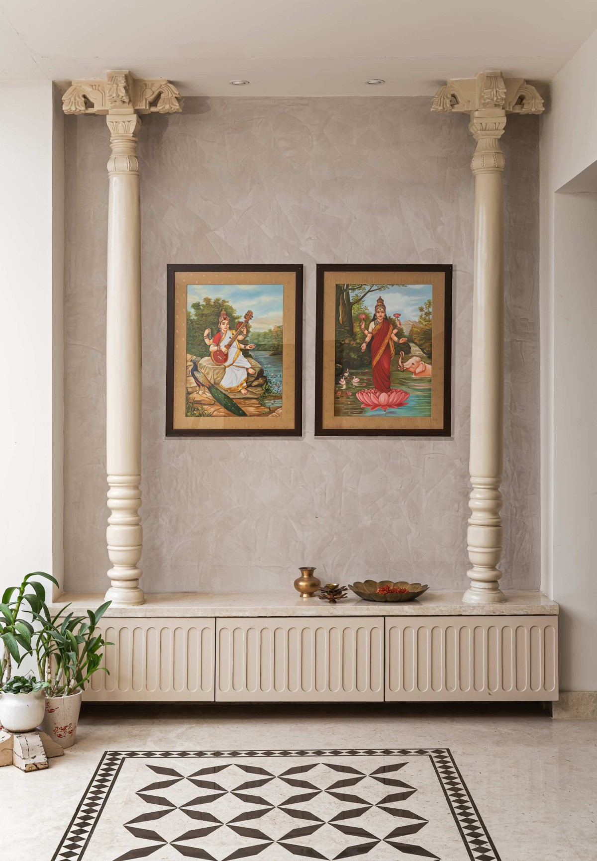 A moment of contrast and cultural significance is introduced at the pooja mandir. Positioned as a spiritual focal point within the home, it is defined by a dark marble floral inlay embedded into the beige flooring. This subtle intervention demarcates the sacred zone while remaining aligned with the overall material palette. Rooted in traditional motifs, the inlay adds depth, reverence, and ritual without compromising the contemporary sensibility of the space.
