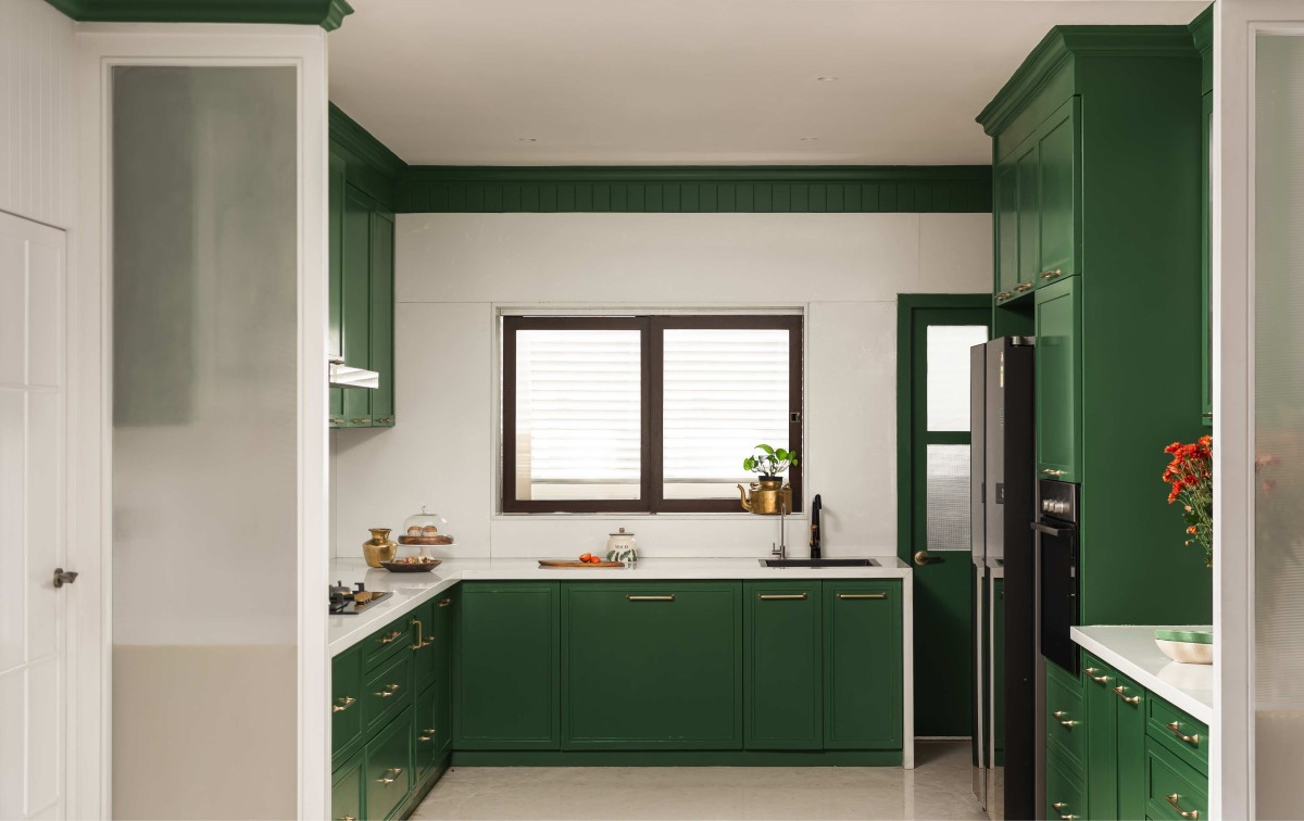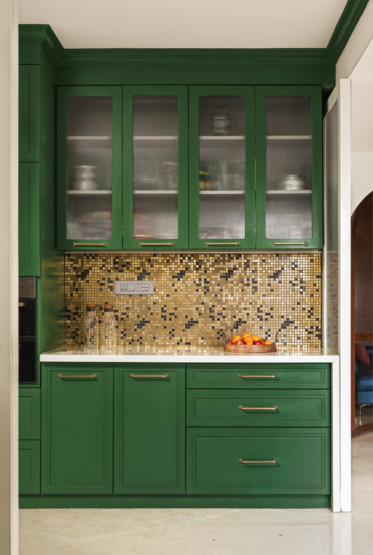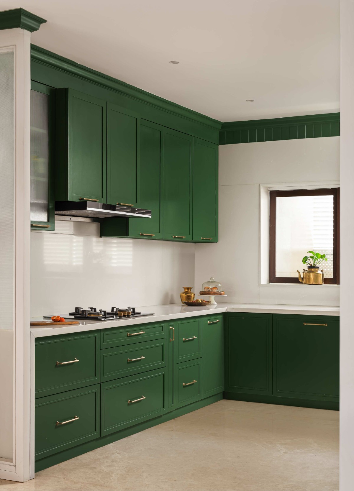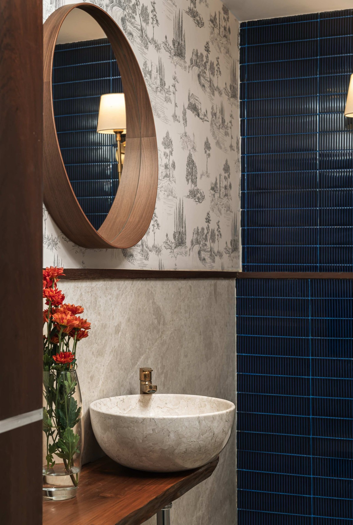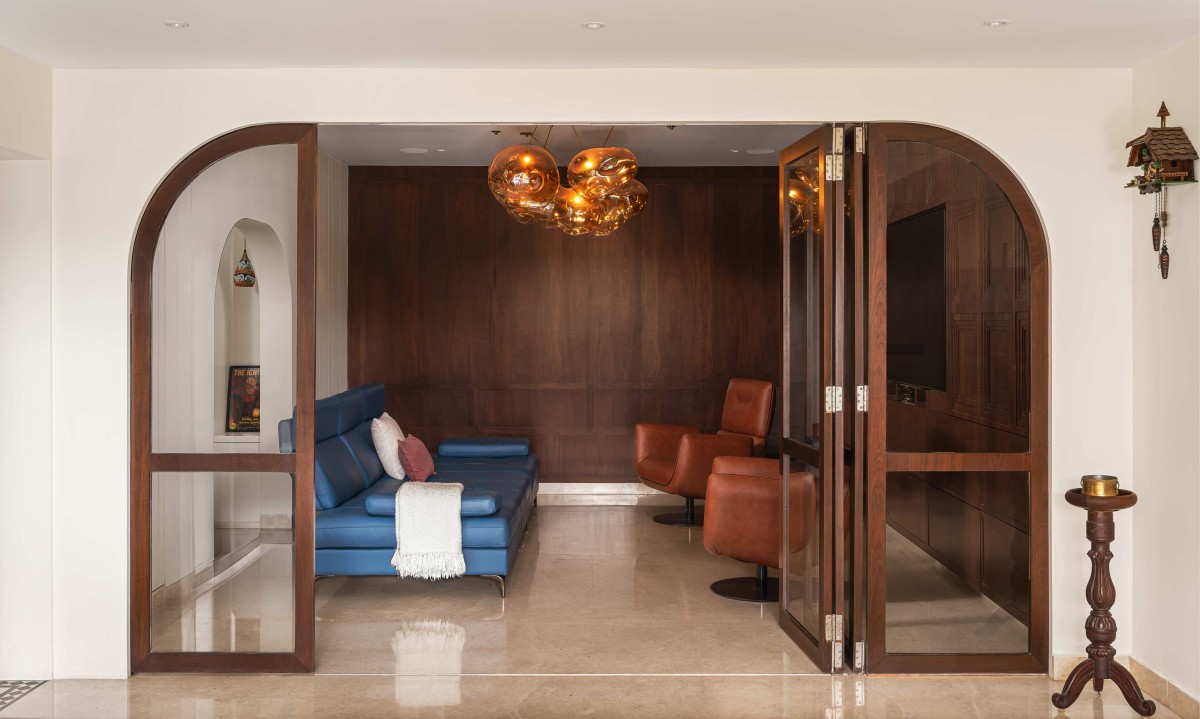 A moment of contrast and cultural significance is introduced at the pooja mandir. Positioned as a spiritual focal point within the home, it is defined by a dark marble floral inlay embedded into the beige flooring. This subtle intervention demarcates the sacred zone while remaining aligned with the overall material palette. Rooted in traditional motifs, the inlay adds depth, reverence, and ritual without compromising the contemporary sensibility of the space.