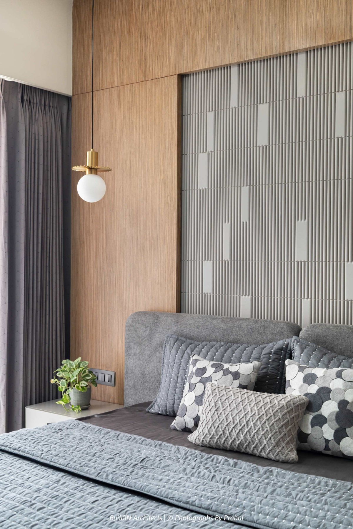 A disciplined neutral palette defines this modern bedroom's elegance. The focal point is the headboard, a masterful blend of warm, linear-grained wood and a sophisticated 3D textured grey panel. Layers of soft grey textiles on the bed add comfortable depth. Sleek, floating nightstands maintain the minimalist aesthetic. A brass-accented pendant light provides a touch of polish. The design succeeds by layering contrasting textures within a serene, monochromatic scheme, creating a luxurious and tranquil retreat.