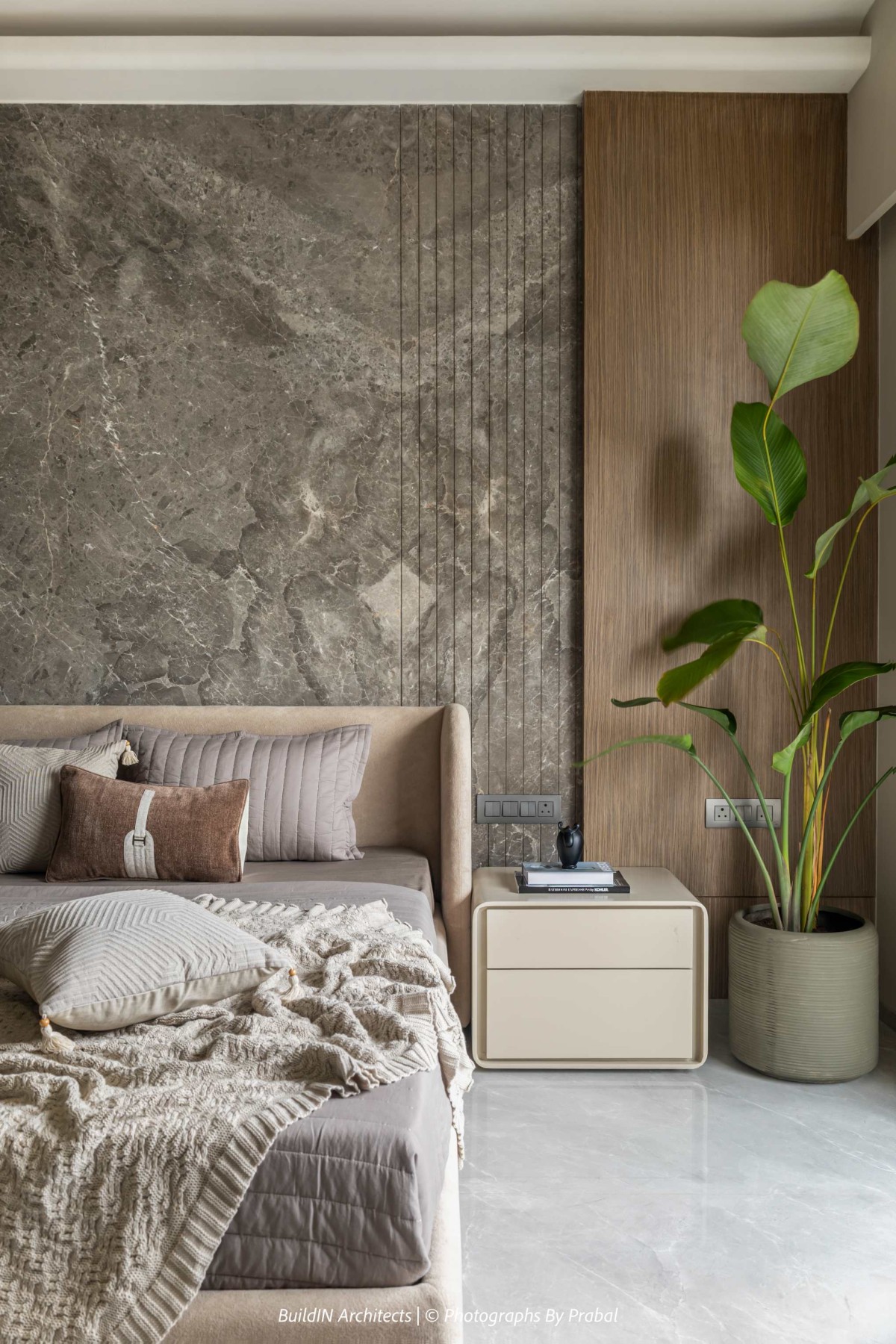 This bedroom embodies understated luxury through a seamless interplay of texture, tone, and form. A striking marble accent wall anchors the design, while warm wooden paneling adds depth and intimacy. The neutral palette—layered with taupe, beige, and muted greys—cultivates a soothing, cocoon-like ambiance. Soft furnishings and tactile textiles enhance comfort, as minimal furniture maintains visual lightness. Fluted details, a graceful archway, and a floating TV console lend architectural elegance, blending modern functionality with tranquil refinement. Natural light softly filters through sheer drapery, accentuating the material warmth and the room’s effortless sophistication.