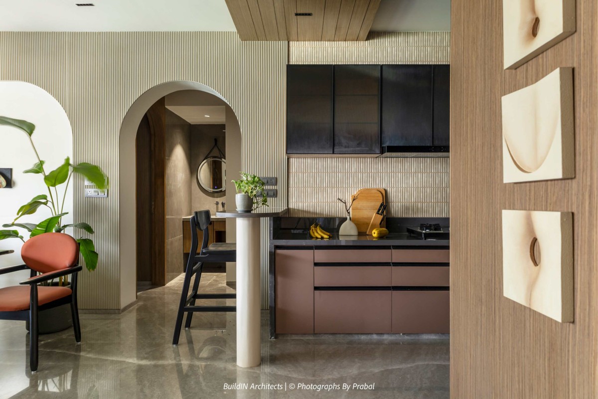 This contemporary kitchen embraces a refined balance of form and feeling, where architectural details and natural textures come together in quiet harmony. Vertical fluted wall paneling adds depth and rhythm, while the sculpted arched opening introduces a sense of timeless elegance and fluid spatial movement.