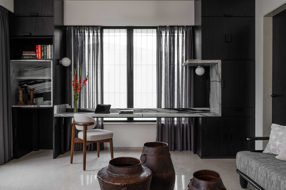 The study room on the first floor is designed for focus and calm. The built-in study desk in Panda white marble, extending into the side storage units and framing the window beyond - a thoughtful use of lines and light. The study extends into a small terrace with a floor pattern designed in two tones of natural stone.
