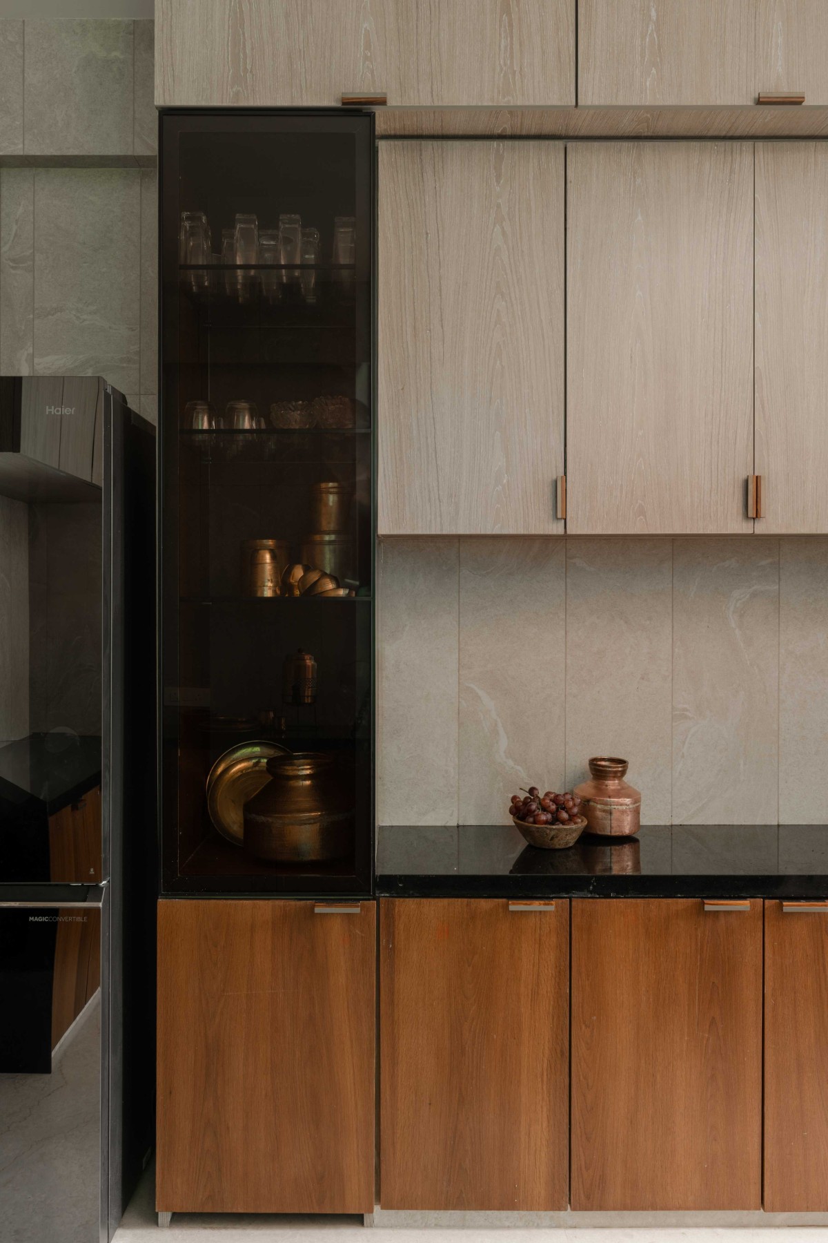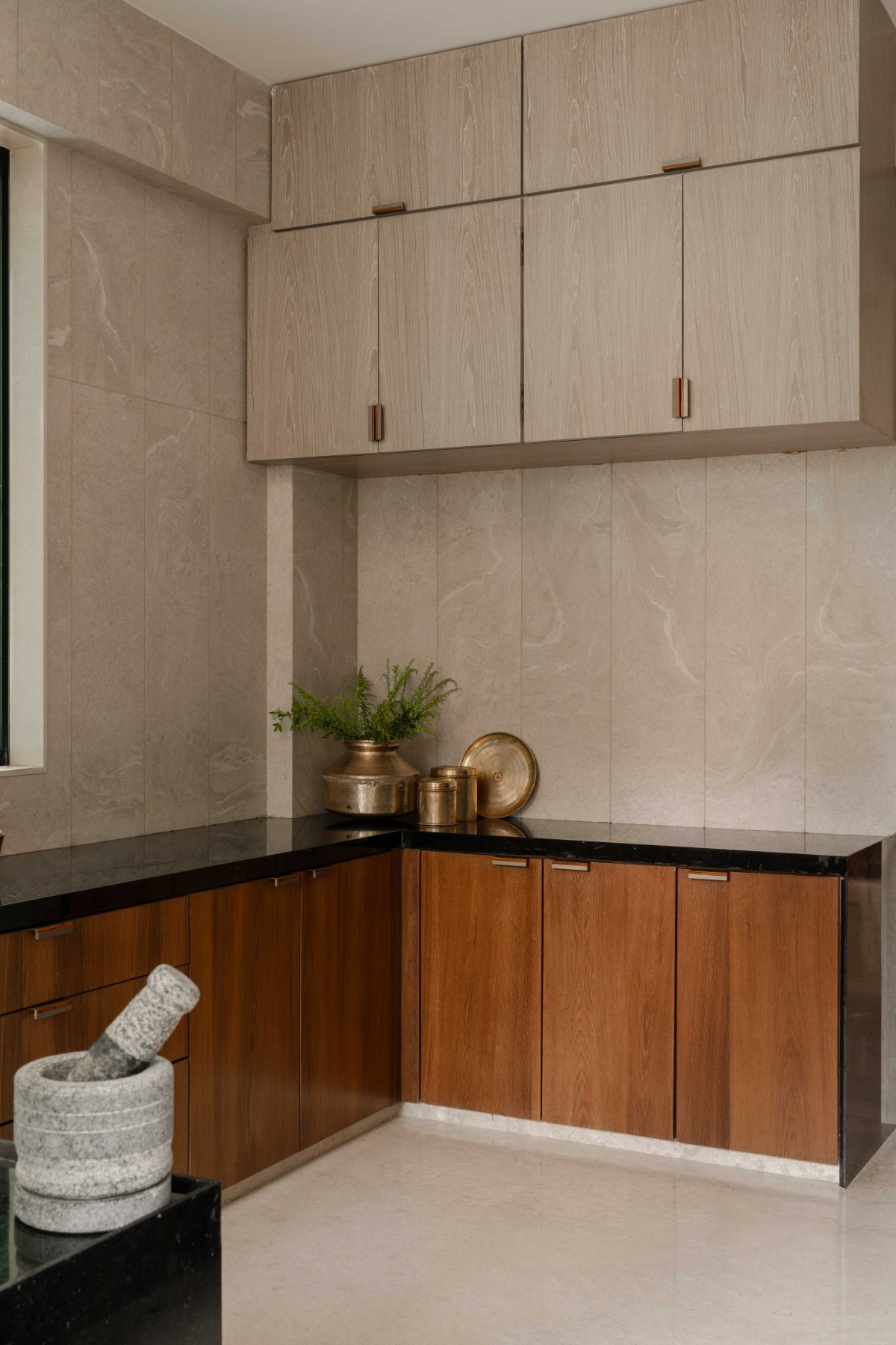 The kitchen is classic and clean. Black granite countertops contrast with dual-tone veneer cabinetry. Textured beige tiles have been cut into linear strips, elongating the visual axis.