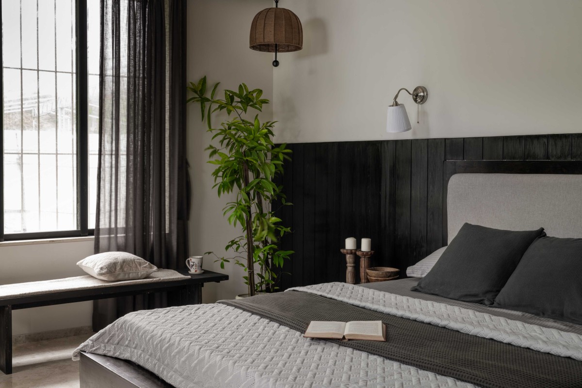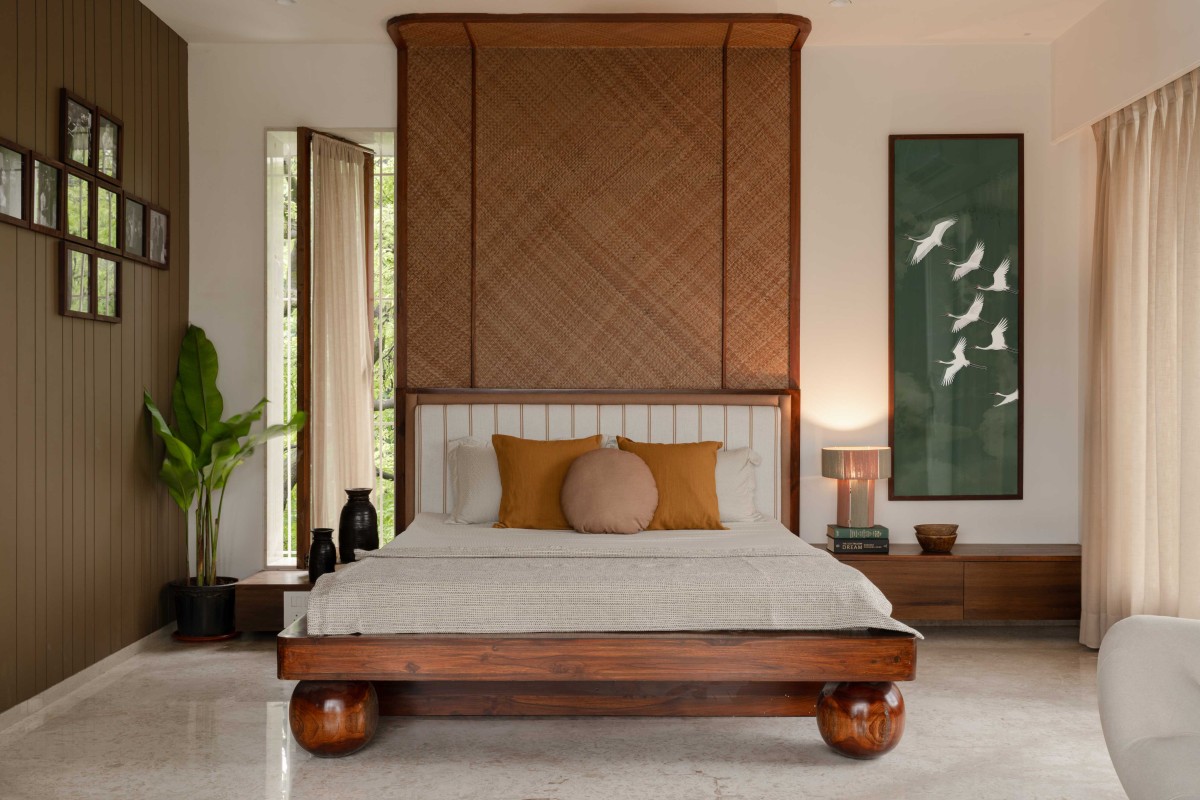 On the second floor, the master bedroom opens to a private terrace through sliding-folding wooden-framed glass shutters that neatly stack away, blurring the line between indoors and outdoors. A cane-sheet bedhead extends across the wall and seamlessly curves onto the ceiling. The room features a wall of framed family portraits, long windows, a pivot window, and a walk-in closet—key elements that add character and function. Outside, an outdoor pergola offers a serene spot for morning tea or evening conversations, especially magical during Bombay’s monsoon rains.