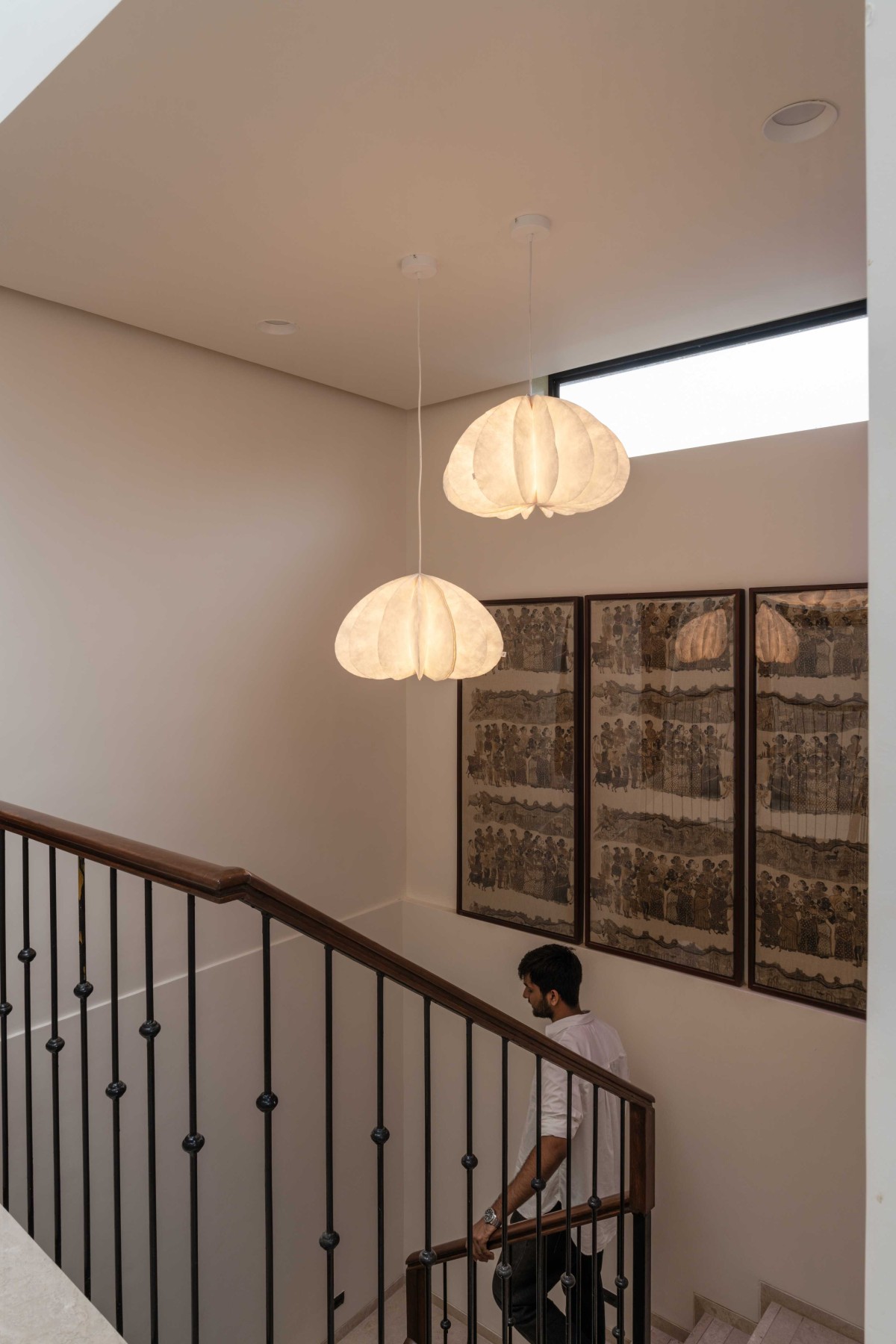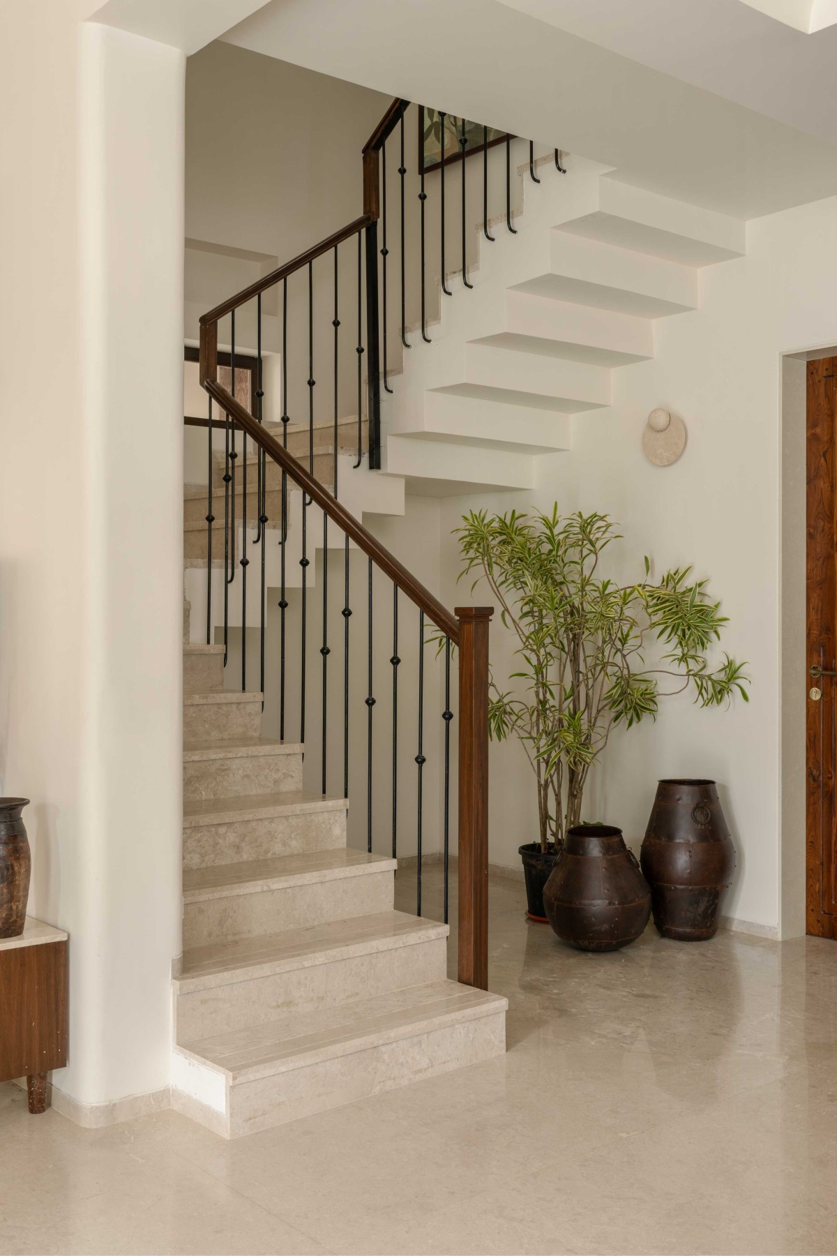 The centrally placed staircase, with a unique anti-skid detail: a strip of river-washed marble sandwiched between polished marble treads. A sleek metal handrail is fixed to the sides, while a fabric-sandwiched glass window divides the staircase from the living room. This translucent feature doubles as a sophisticated backdrop for the TV unit, offering glimpses of the stairs beyond and adding layered depth to the space.