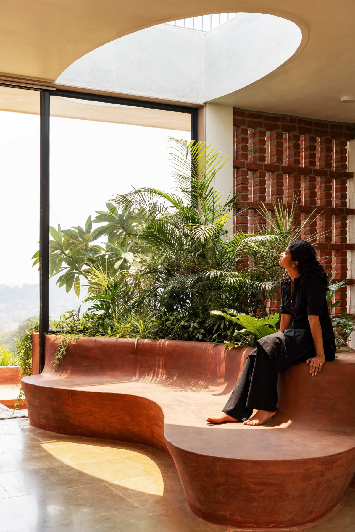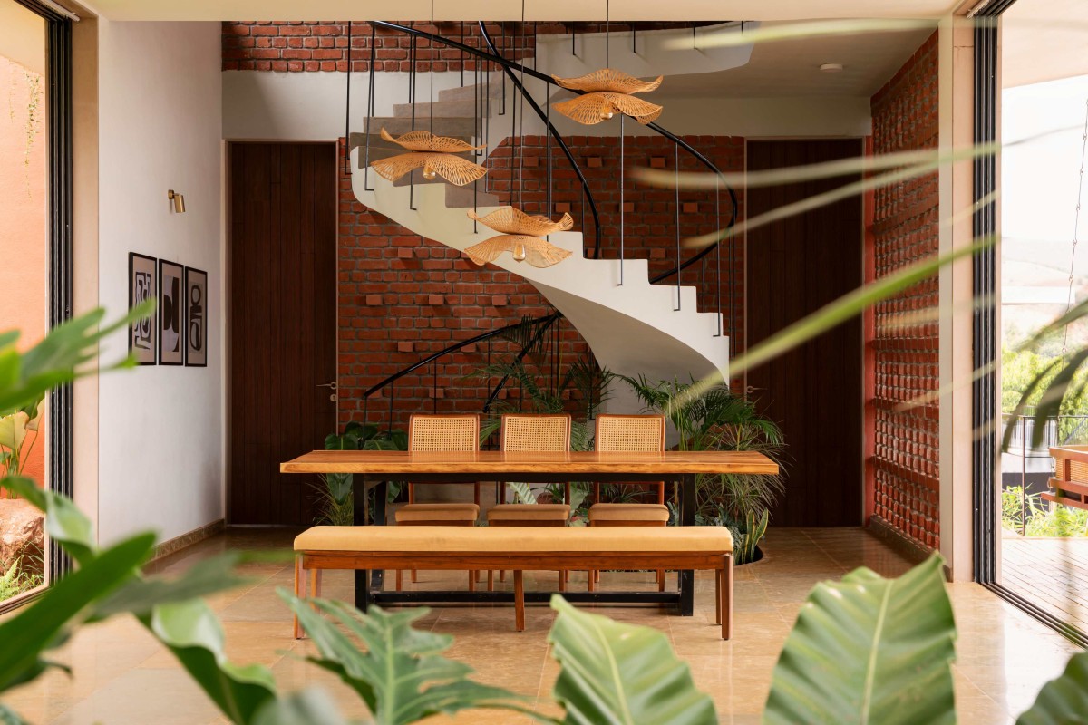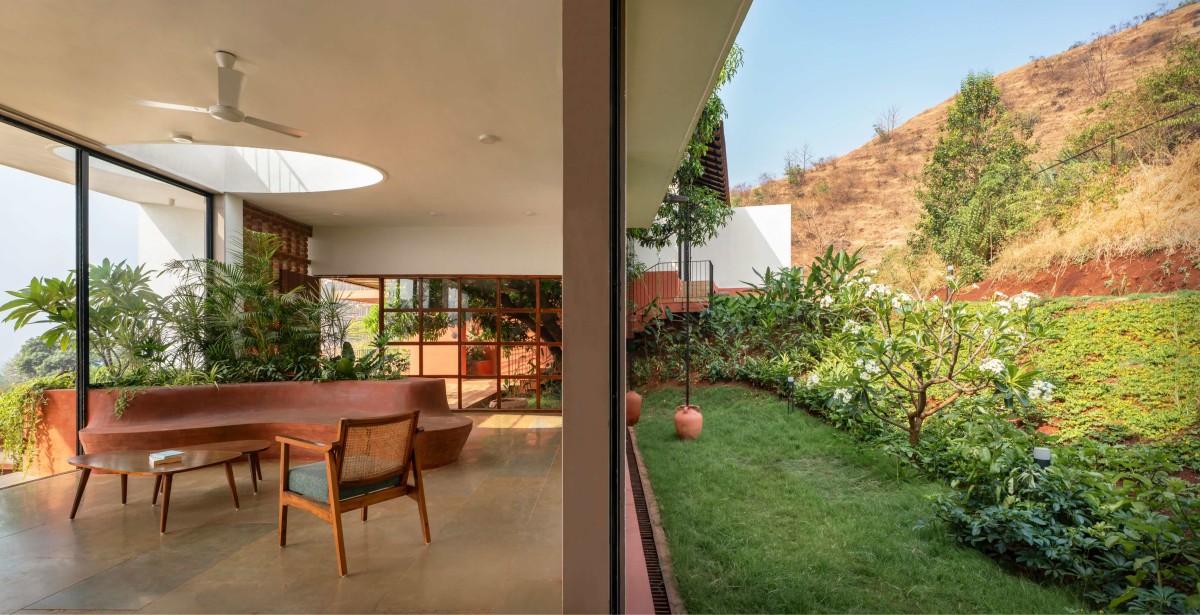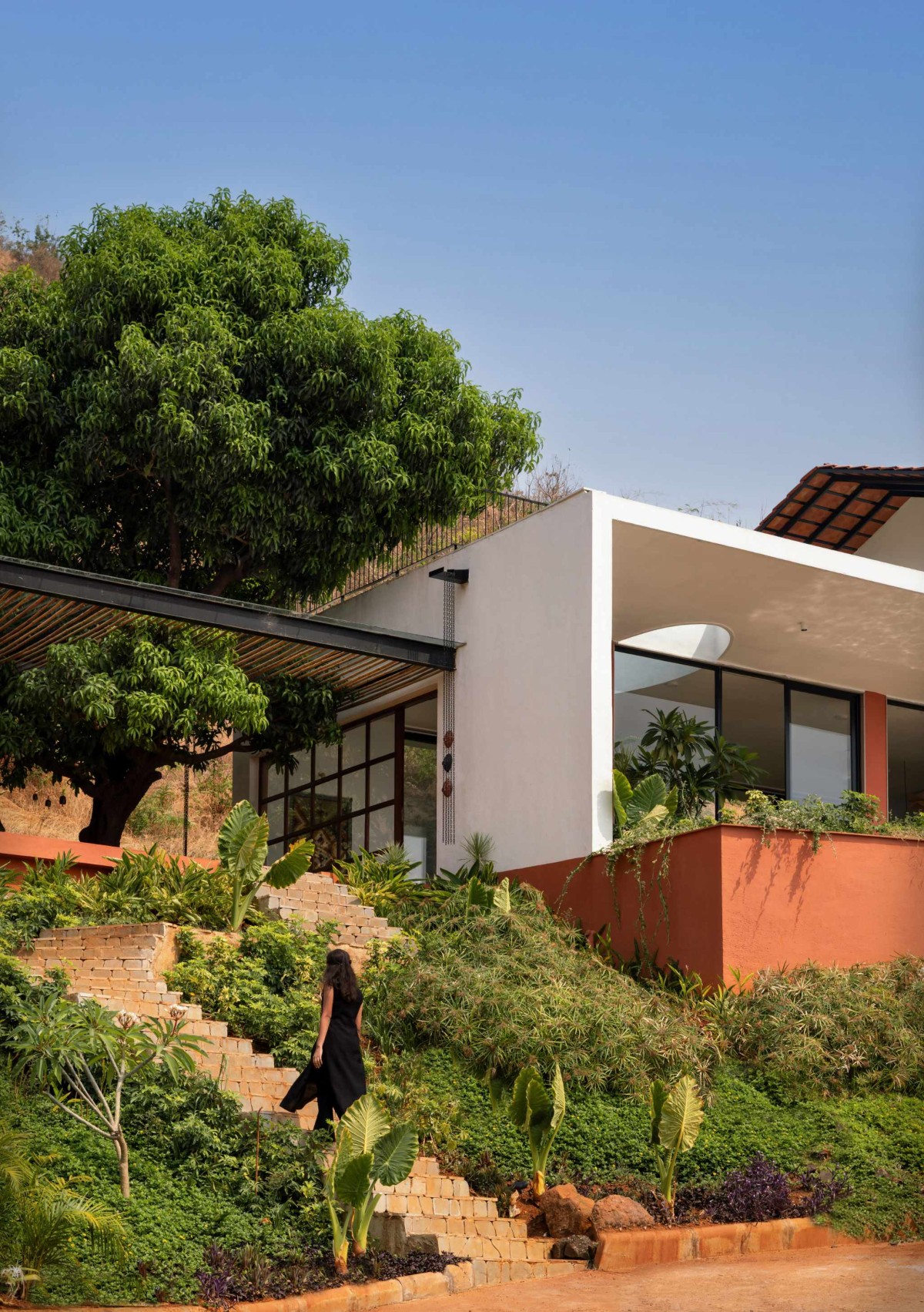 Metaphorical to an earthy creature born from the Sahyadris’ fertile soil, the home with its terracotta hues, gives birth to the various green offsprings. Brick — honest, textural, and timeless — is used extensively for walls and flooring, instilling warmth and tactility. Native cost-effective shahbad stone is laid in various forms and patterns throughout the home. The traditional Mangalore tile roof evokes the timeless qualities of regional building techniques, while the villa’s interiors maintain a warm, intimate atmosphere. Large, expansive windows invite abundant natural light and frame the breath-taking views of the surrounding landscape.