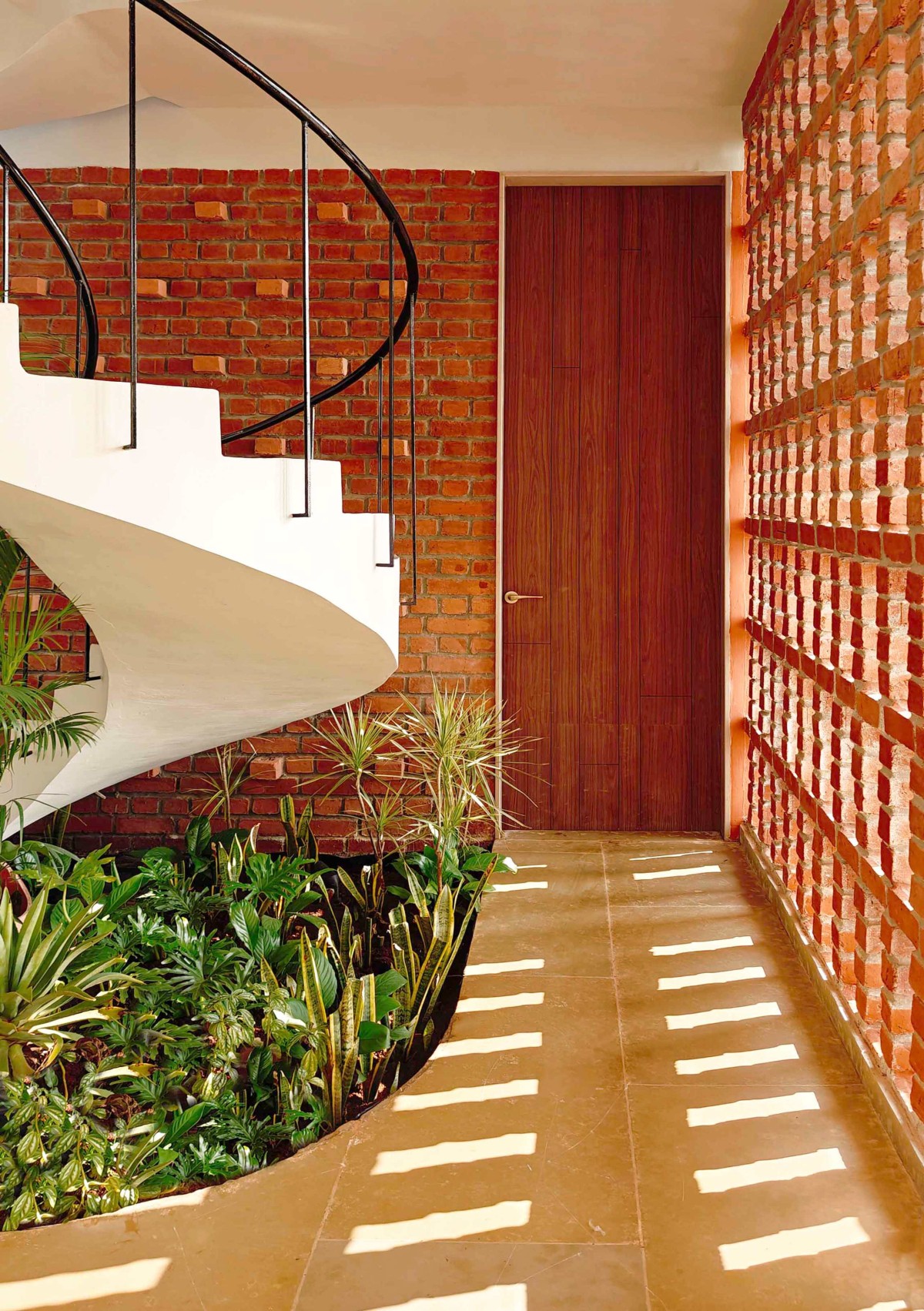 A central spiral stair, another defining feature of the living, born out of another planter bed with an earthy backdrop of bare-brick wall, leads you to the upper bedroom. The other three bedrooms constituting the private wing, are straddled at three different levels, negotiating the existing contours through outdoor stairs, consistently interspersed with greens. At Prakriti, nature is not a mere backdrop, but the narrative itself. One can feel the forest breathing through the home through its multiple biophilic gestures, be it visual, olfactory or auditory. These green inserts are the off springs of this earthy home which bring an innate serenity into the space.