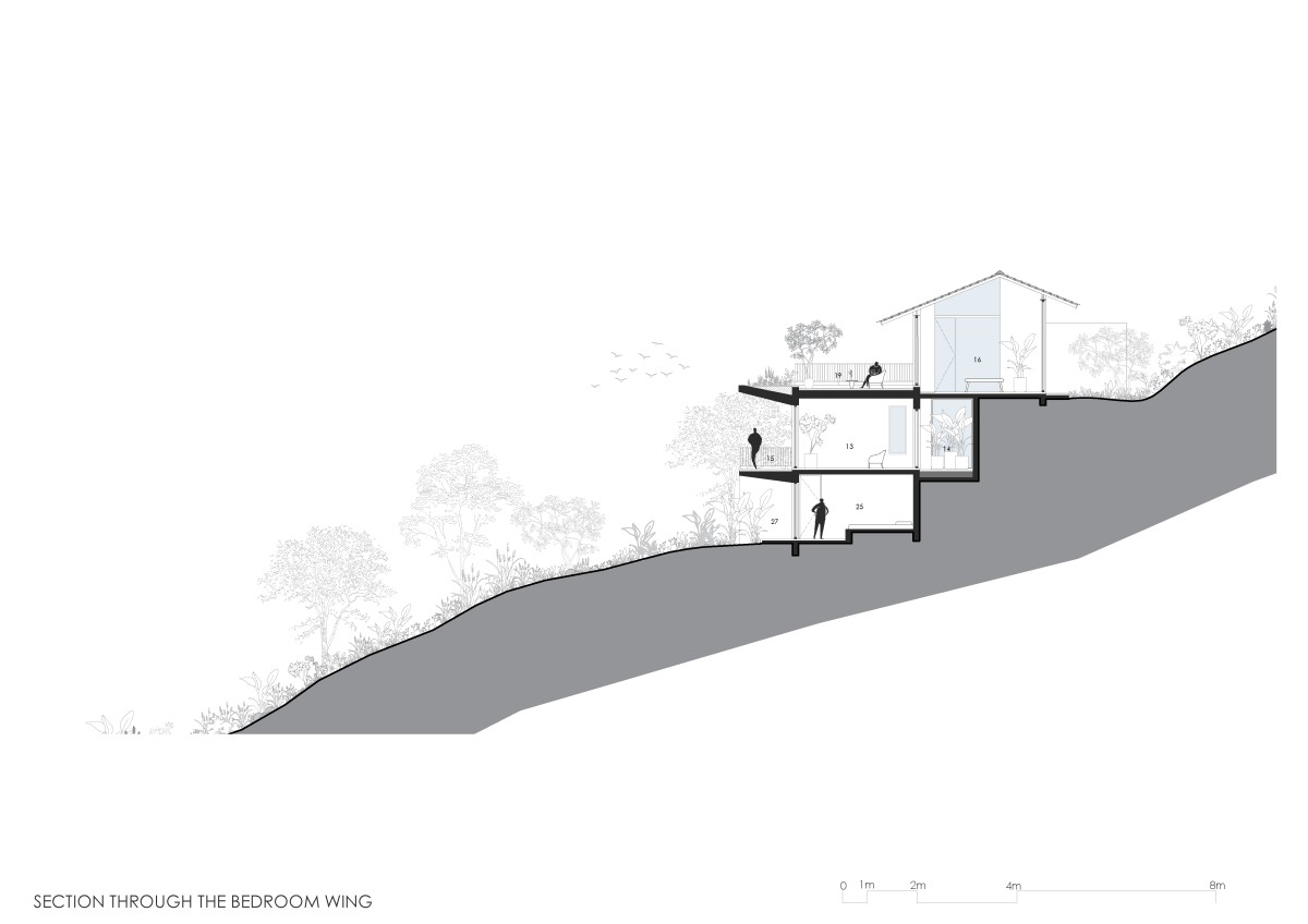 The first seed of thought was born right under the lone mango tree. Its position, quiet yet assertive, formed the instinctual nucleus — the axis mundi, around which the home weaves its story. The spatial configuration splits in two wings around this mango tree — one public, one private. Between them is not just circulation, but conversation: between light and shade, sound and silence, self and the surrounding wilderness. Just like the tree, the house grows outward in humility and strength, where the tree transforms itself into a living sculpture. Traversing the home on a contoured topography becomes an act of choreography, negotiating numerous  levels, slowly unravelling spaces and distant vantages. The terrain is not seen as an obstacle to overcome, but a rhythm to follow. Instead of flattening the ground into terraces, the house treads gently along it — a minimal cut-fill philosophy respecting the natural gradient.