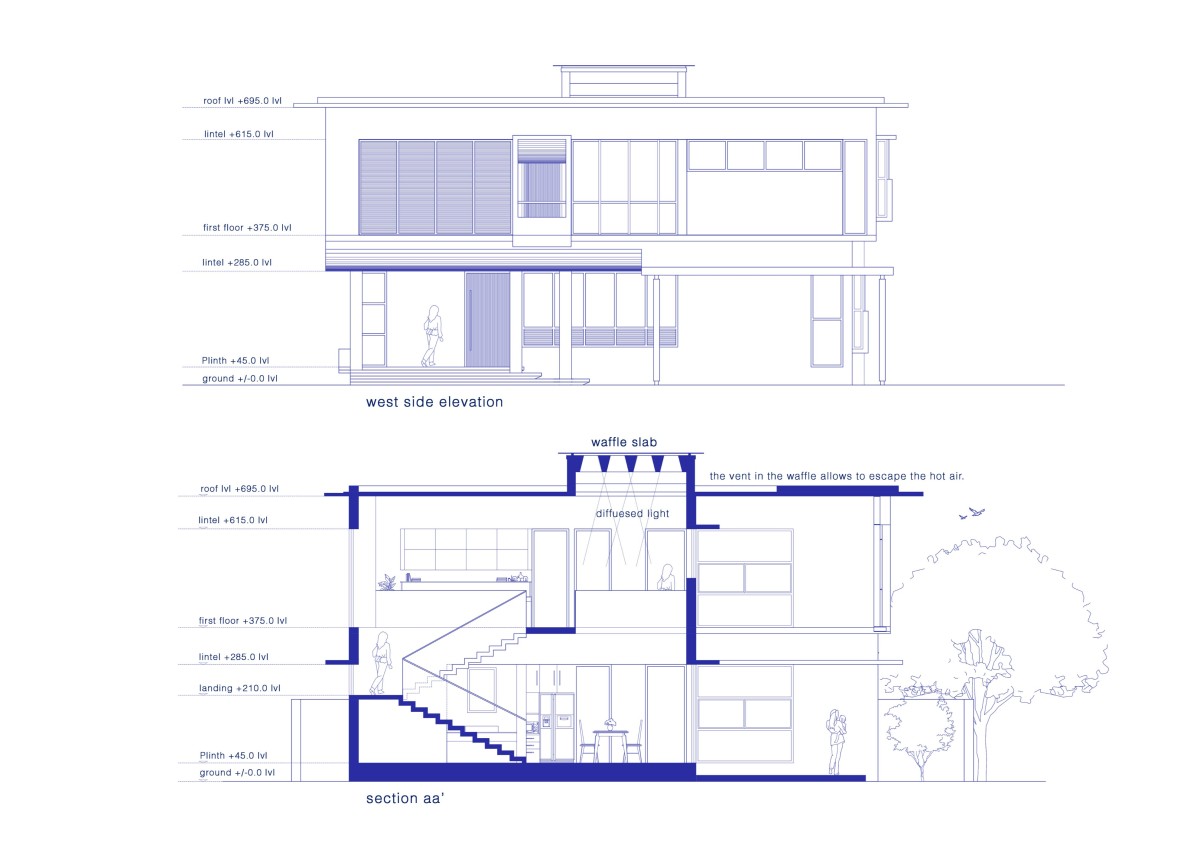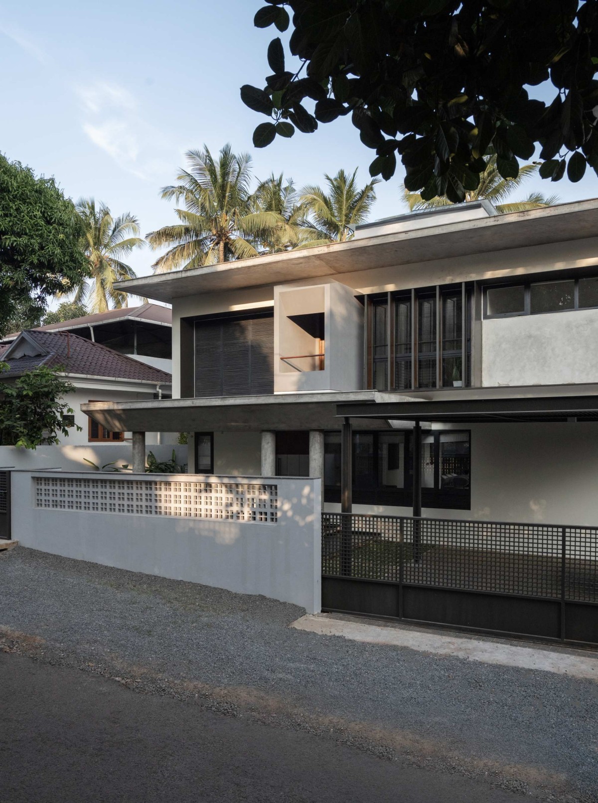 Two large vents integrated into the waffle slab allow hot air to escape, enhancing natural ventilation and maintaining a comfortable indoor climate. Facing west, the residence required careful treatment to mitigate harsh afternoon sunlight. The front elevation incorporates deep cantilevered slabs, operable pivoted shutters, and louvered openings strategies that protect interiors from heat while maintaining light, airflow, and visual connection.