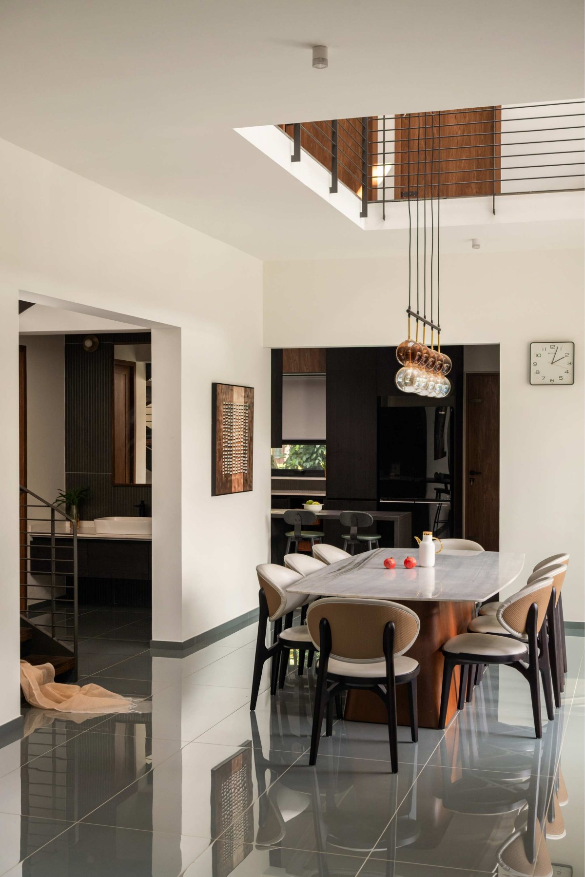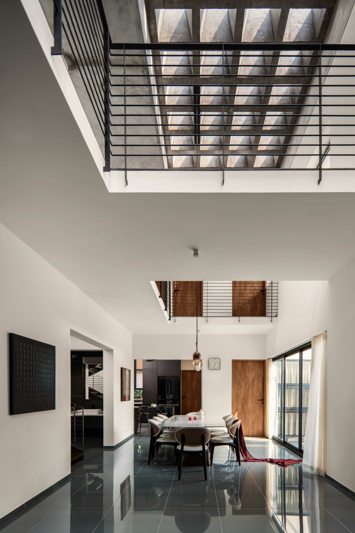 The concept of the waffle slab emerged when the common spaces were centralized, creating a need for natural light to reach the heart of the home. To address this, we introduced a skylight, carefully designed to diffuse sunlight and create a subtle play of light and shadow within the spaces. The waffle slab features gentle tapering, allowing soft, filtered light to animate the interiors without glare, enhancing both comfort and spatial experience.