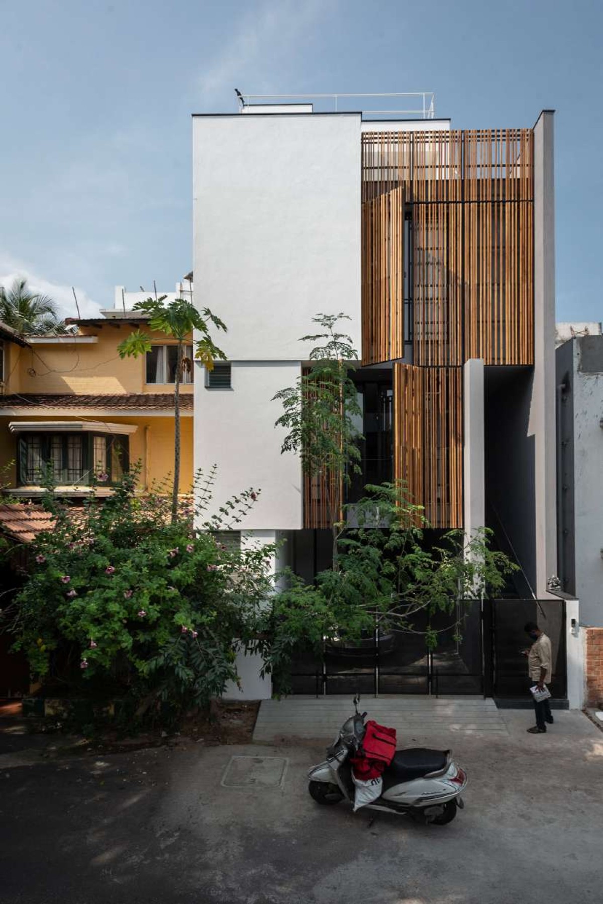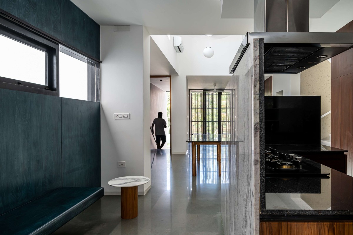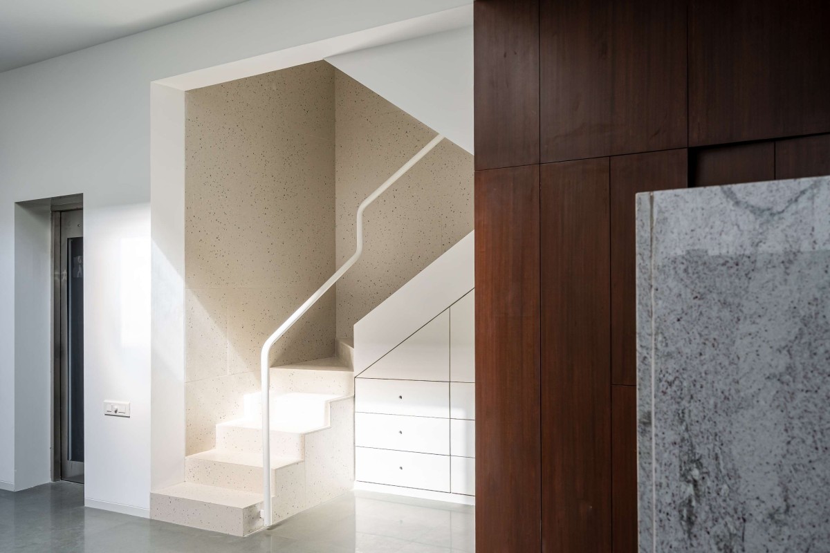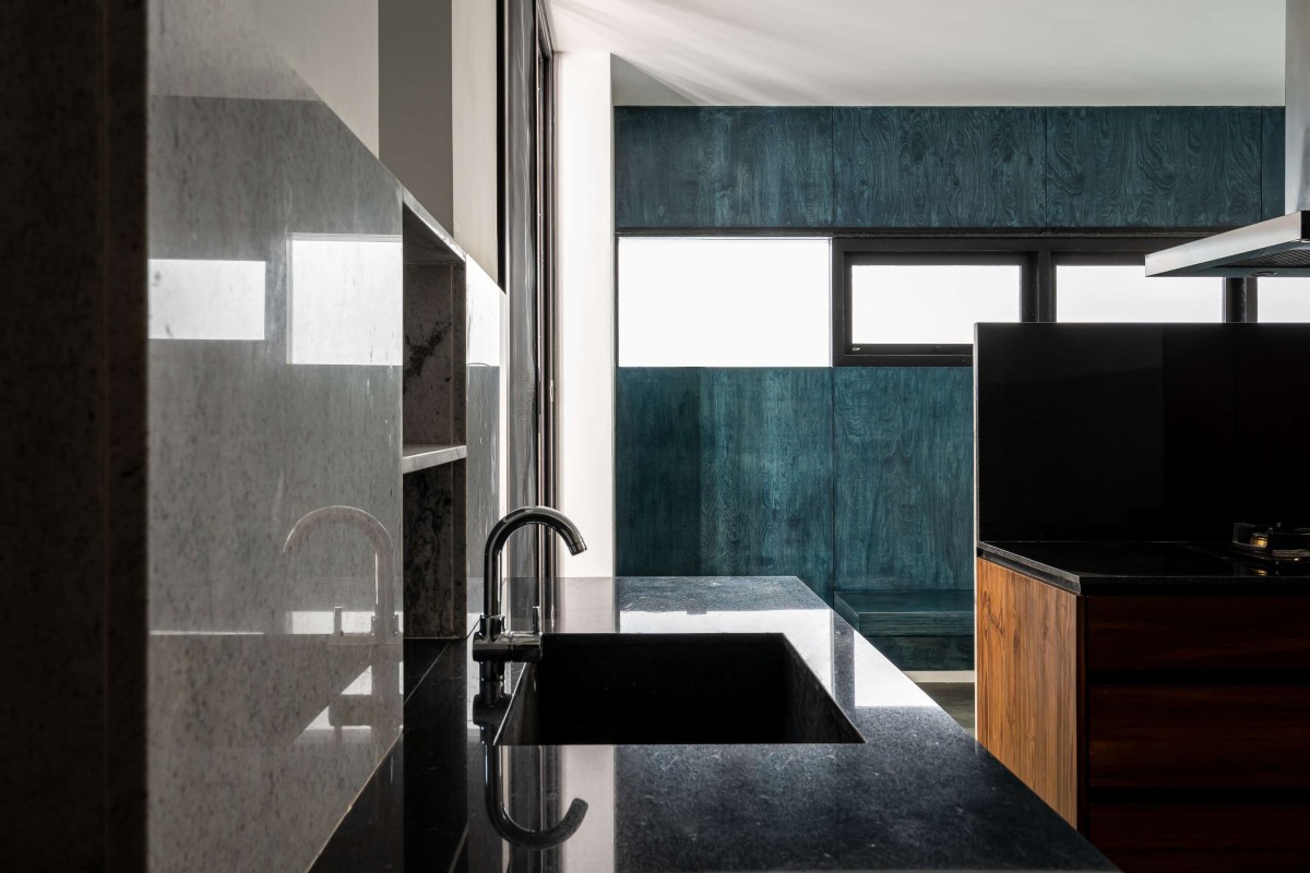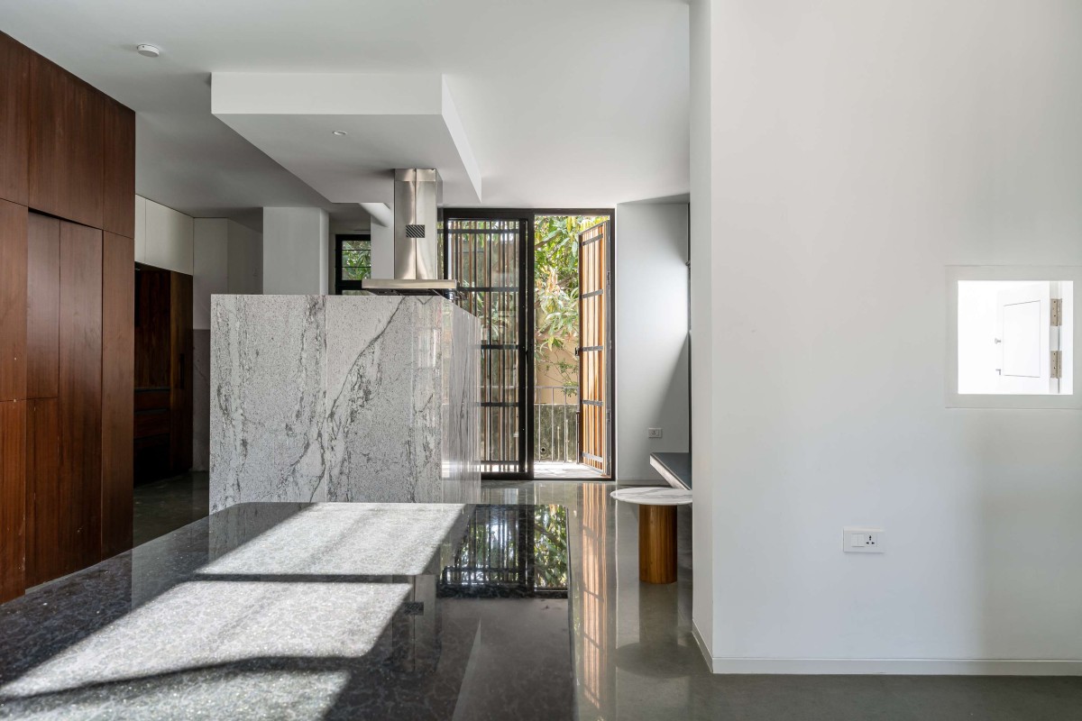 The design of the house is a direct response to the above challenges. A staggered block of service along the depth holds the floor plates for maximum ventilation seasoned teak wood louvers express the porosity for ventilation.