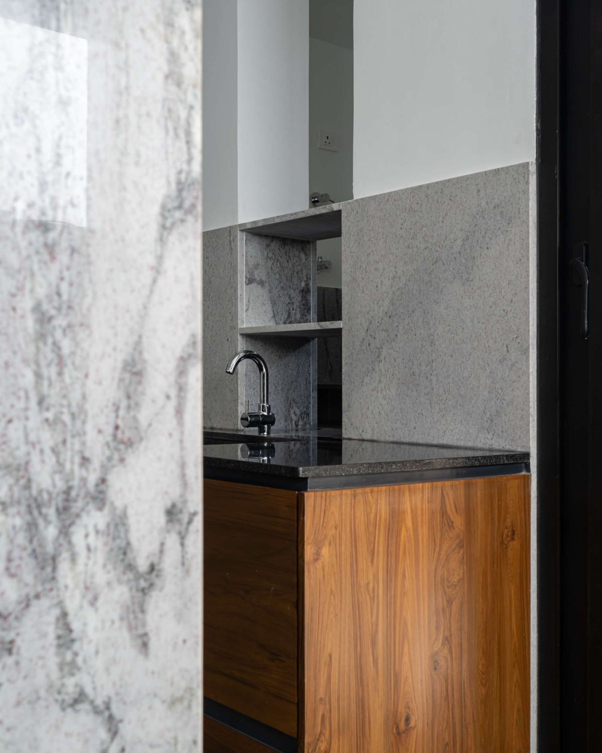 Material finishes include flooring in pre-polished kotah stone, mirror polished granite partition separating the kitchen to dining and natural wood veneer finish for wardrobes.