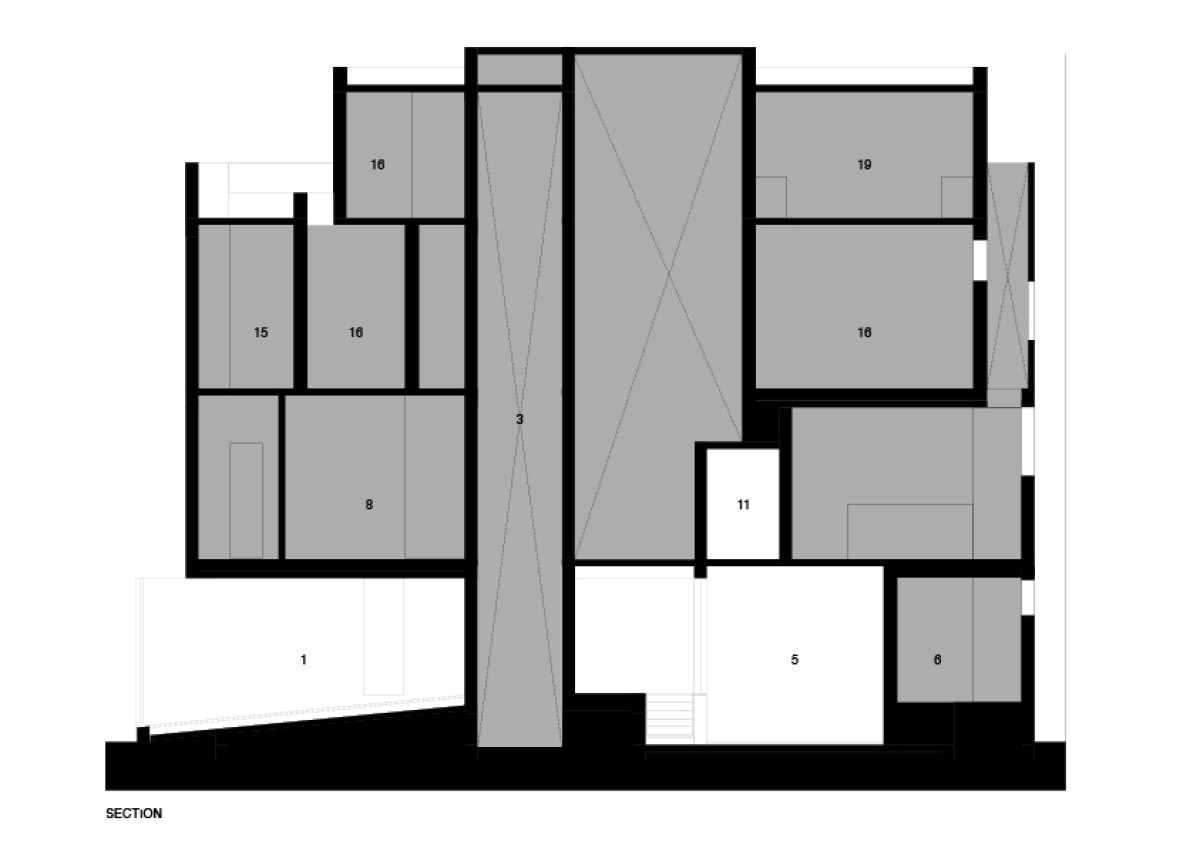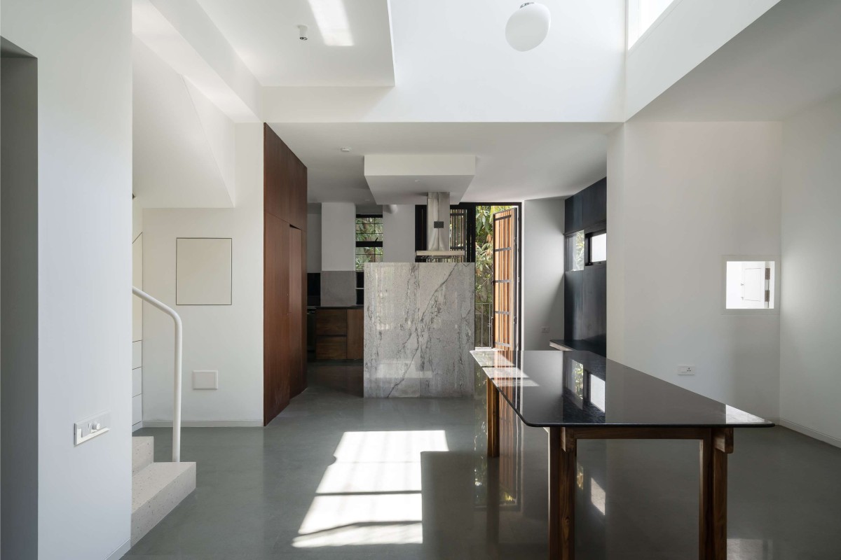 On the inside the strategies for the site include double-height dining in the centre with a balcony on the east, 10-foot-high doors for rooms, toilets and wardrobes located along the depth of the site use of skylights to perceptively increase the size of the spaces.