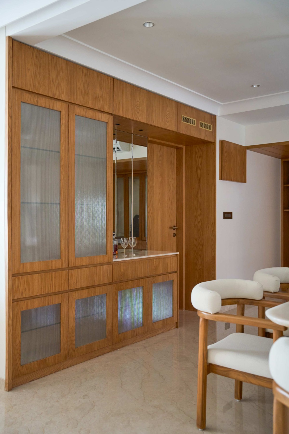 Crockery unit and bar area tucked into the corner opposite the dining space of Walnut Groove by Bombay Building Workshop