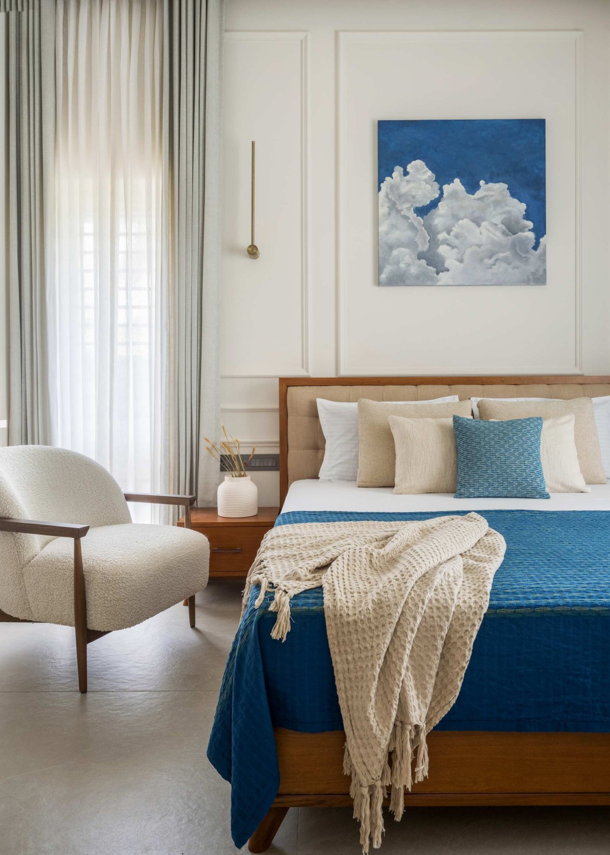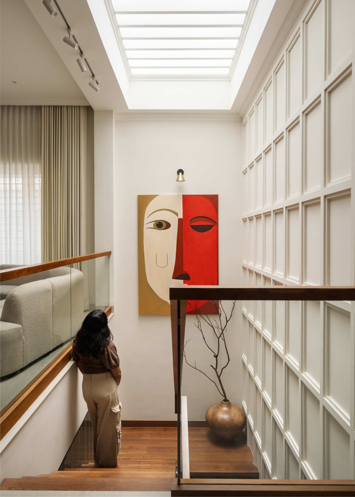 Positioned as a vertical connector, the staircase transcends its functional role to become a spatial experience defined by light and material. The use of teakwood grounds the composition, while glass railings dissolve visual barriers, enhancing continuity. Above, a skylight activates the volume, allowing daylight to cascade along the wainscoted double-height wall. This structured backdrop is punctuated by a striking artwork, creating a moment of pause within movement and reinforcing the staircase as the visual and experiential core of the house.