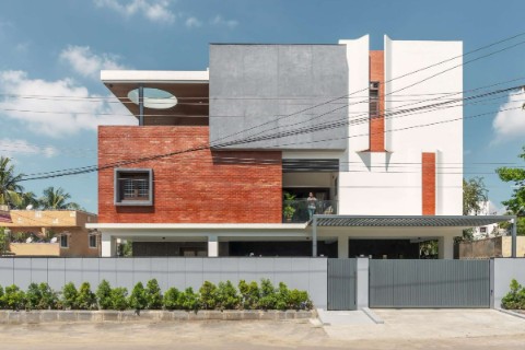 This beachfront property in Chennai is designed as a gift for a father's daughter's wedding. Elevated by 1.5 meters, it features a meandering pedestrian approach, a large great room and a triple-height space with a sea view. The façade is double-skinned with porotherm blocks and half-cut bricks with the roof doubly insulated.