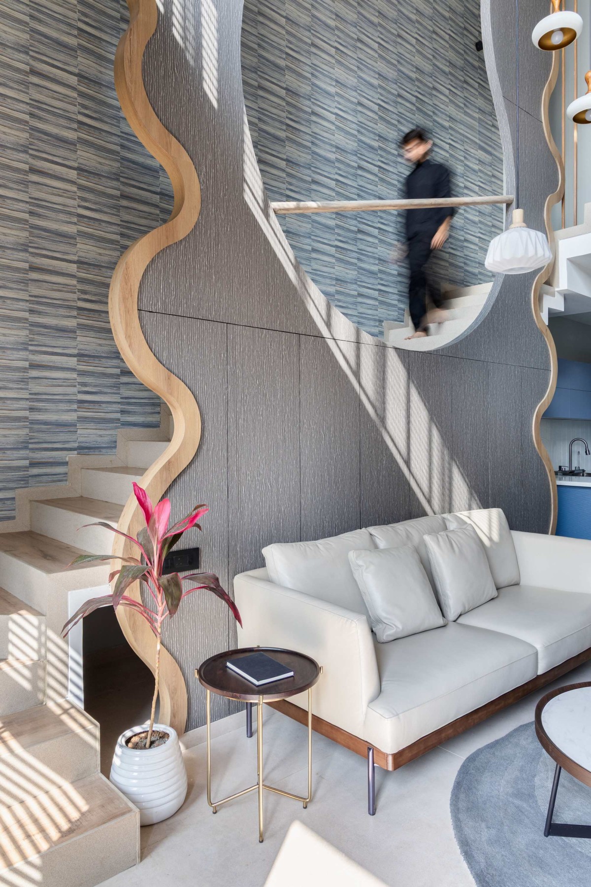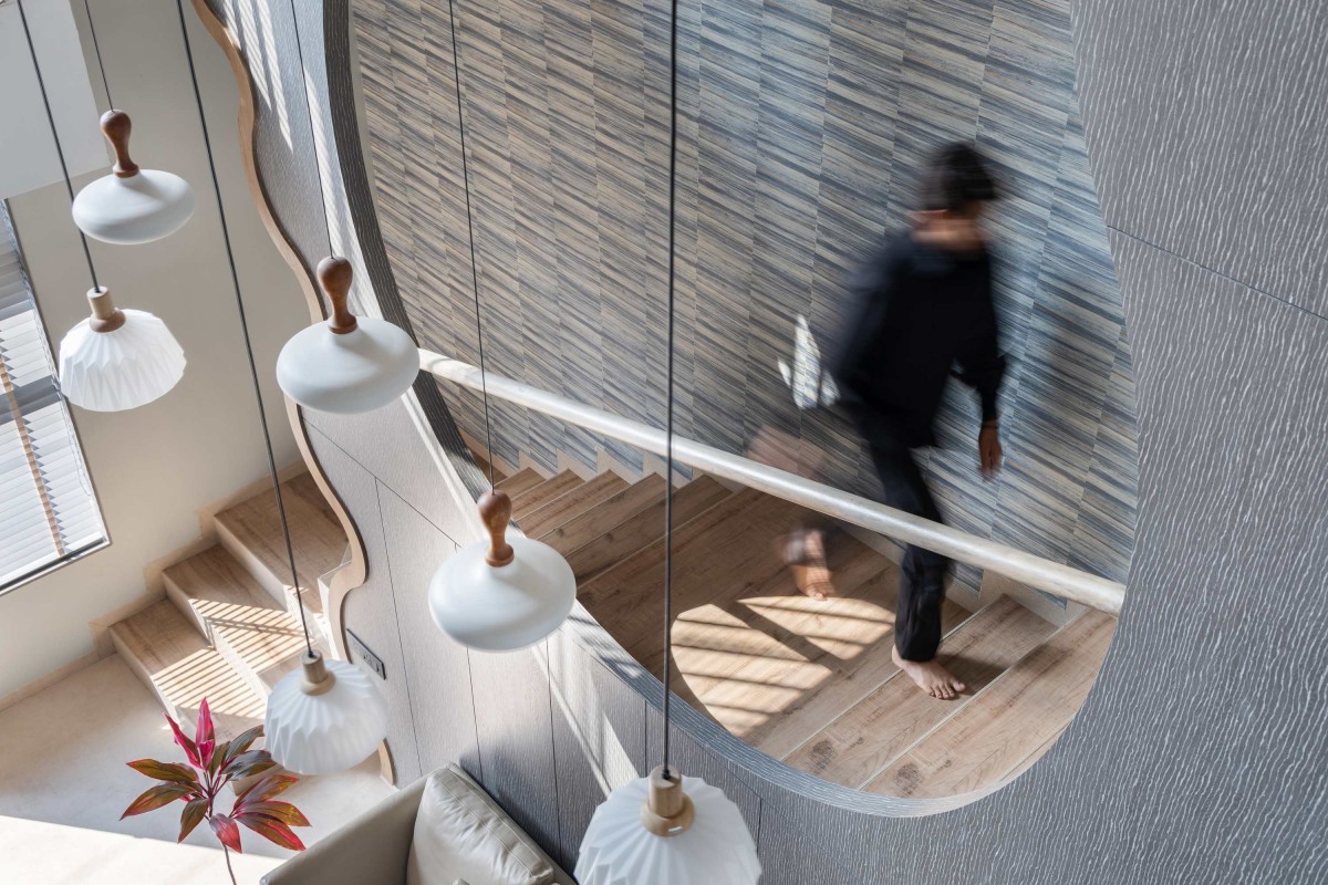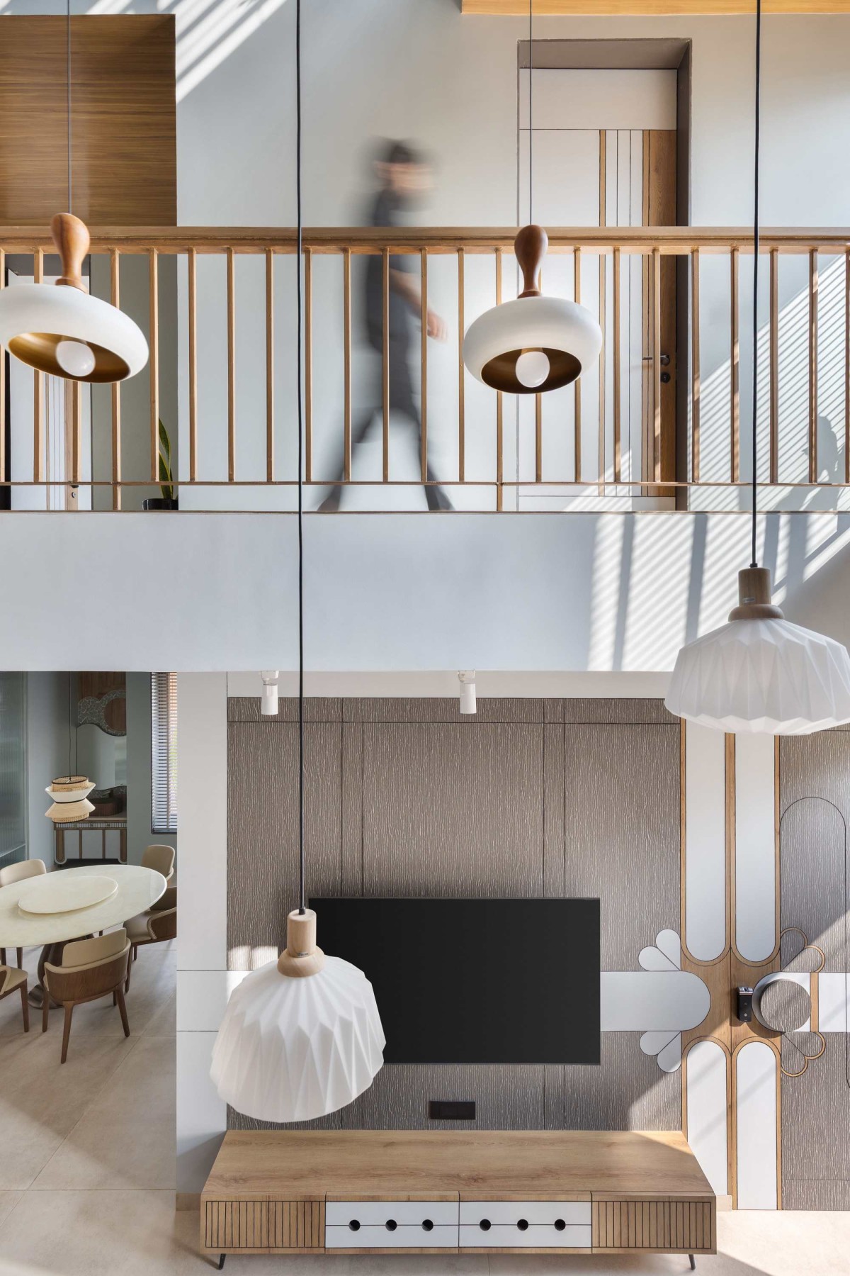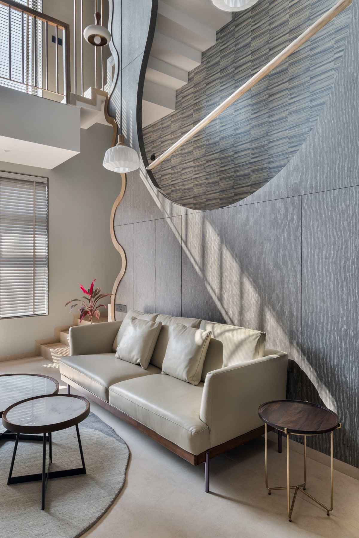 Upon entering the house, one is greeted by a soaring triple-height living room, where an artistic staircase ascends gracefully in the backdrop. Blending of these 2 functions, details how circulation form and flow in architecture meets art in harmony. Using of wooden palette with textured laminates, colours and wallpapers, marks in the interiors for this house. Organic silhouettes of various motifs and free forms, let the concept of curves flowing inside the house in furniture detail.