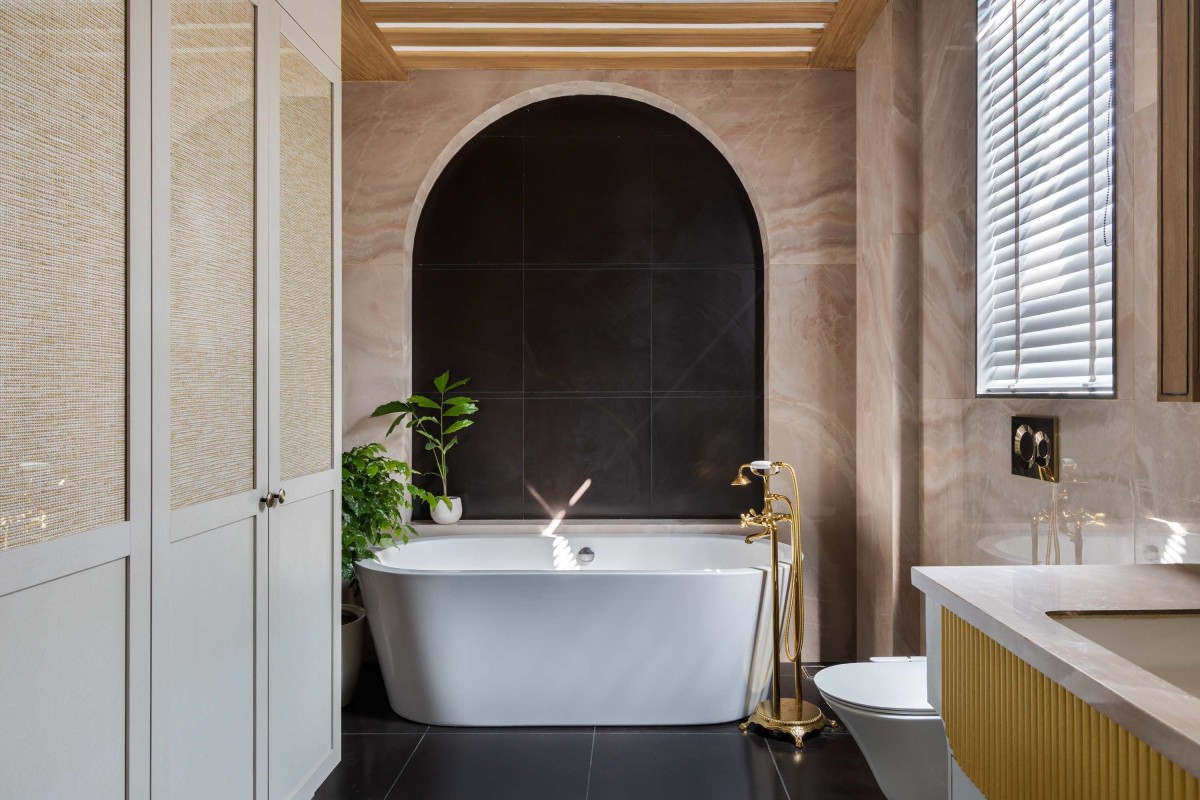 Bathrooms have incorporated the concept of walk-in wardrobes covered in concepts of fluted and laminated weaved surfaces. Art relates beautifully even in these daily activities zones, making it an interpretations of resort type of bathing experience, with pergola themed ceilings or warm shades.
