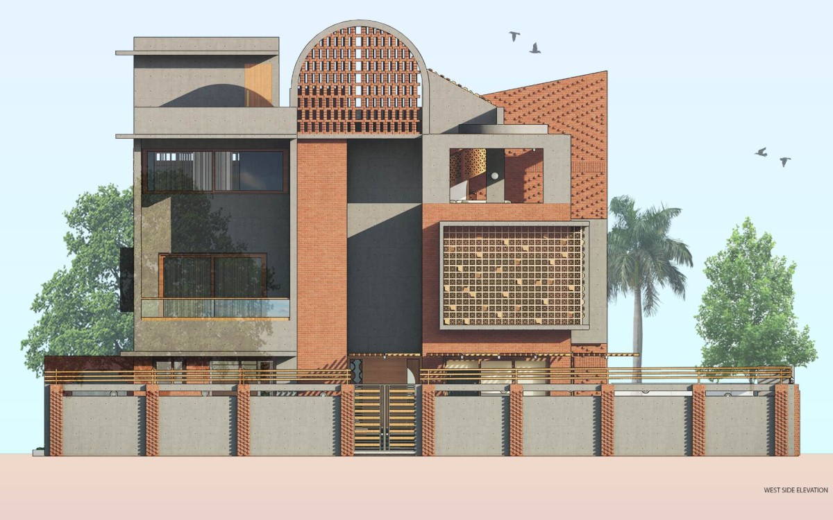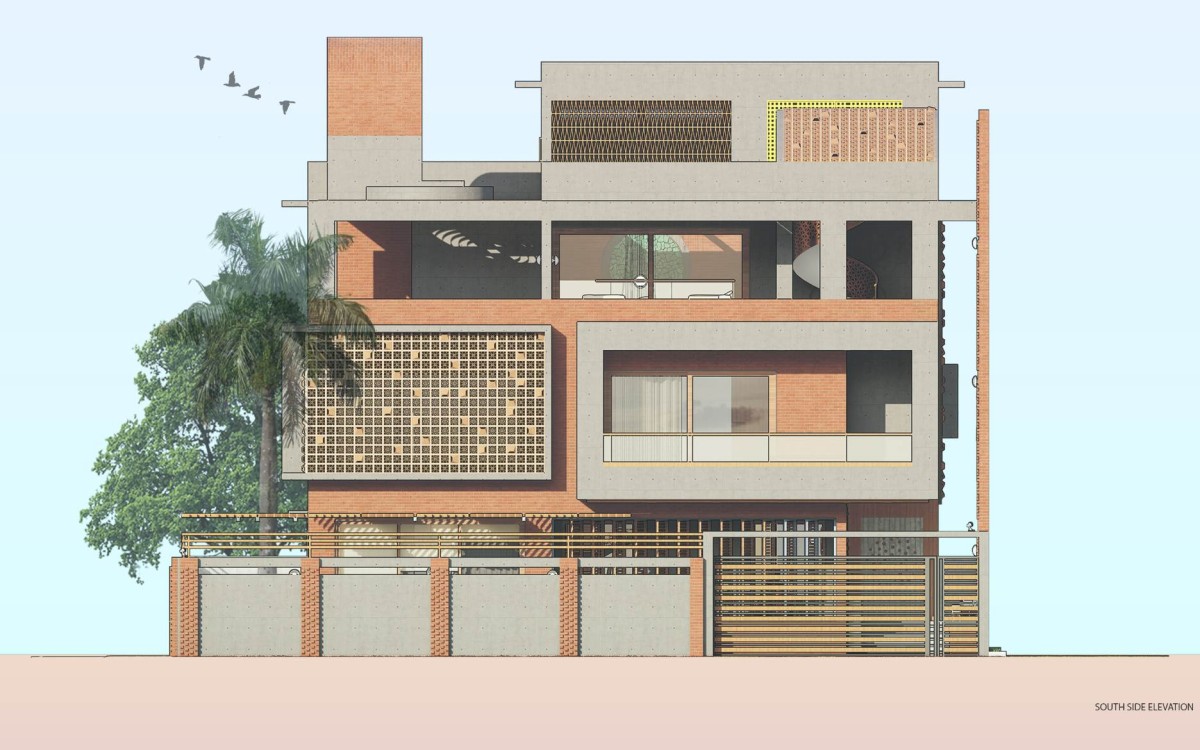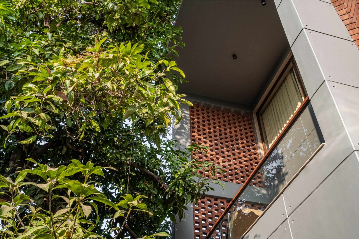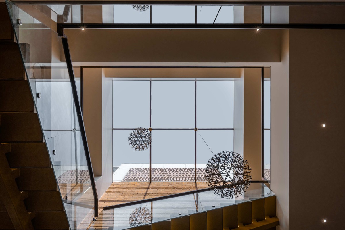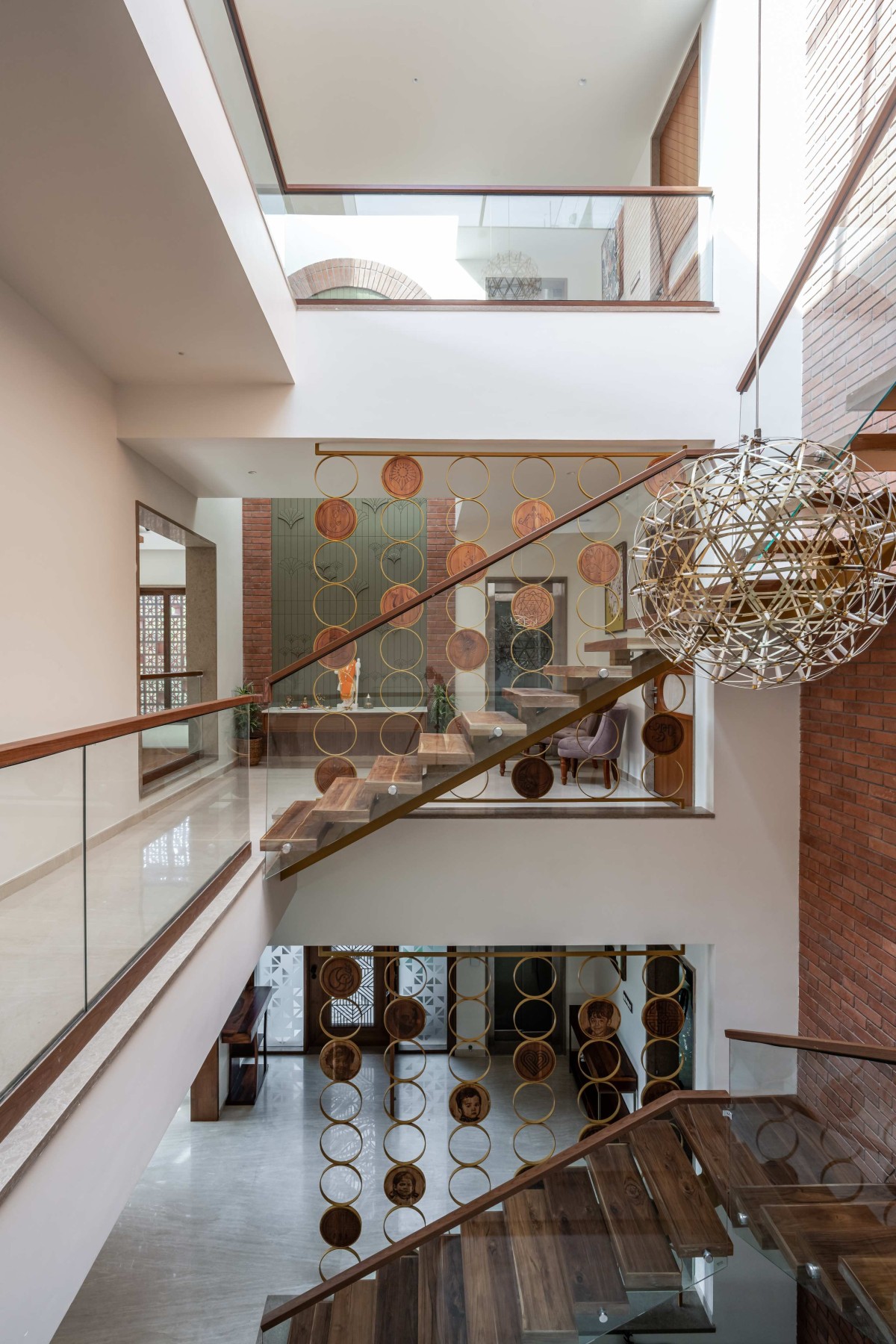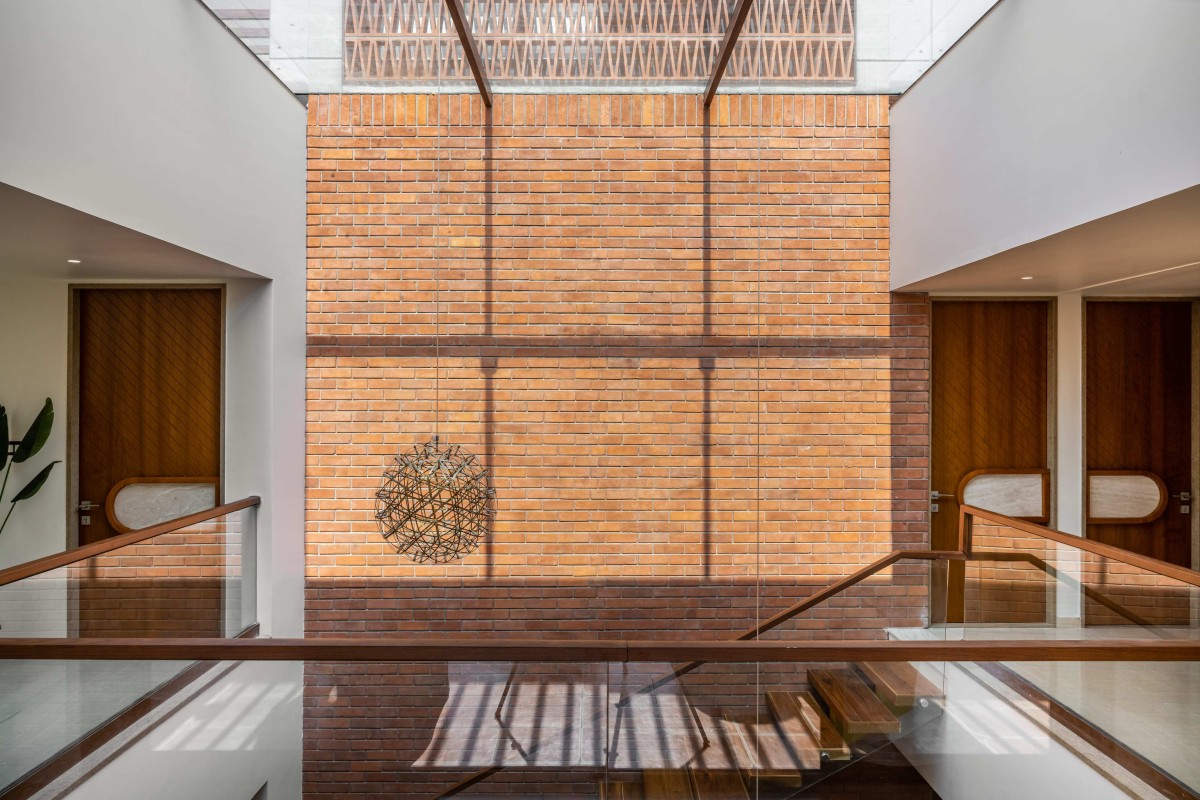 A combination of structural and aesthetic elements was used to create a configuration which is dynamic and provides spaces of varying heights, dimensions, and energies. While the central staircase creates visual lines between the floors above, it also gives way to a double height living room. Sweeping high ceiling makes up for a double height balcony in one of the first-floor bedrooms. The brick wall runs tall on the eastern façade of the building, providing a needed balance to the massing while also creating a focal point for the main circulation areas in the house, on all the floors.