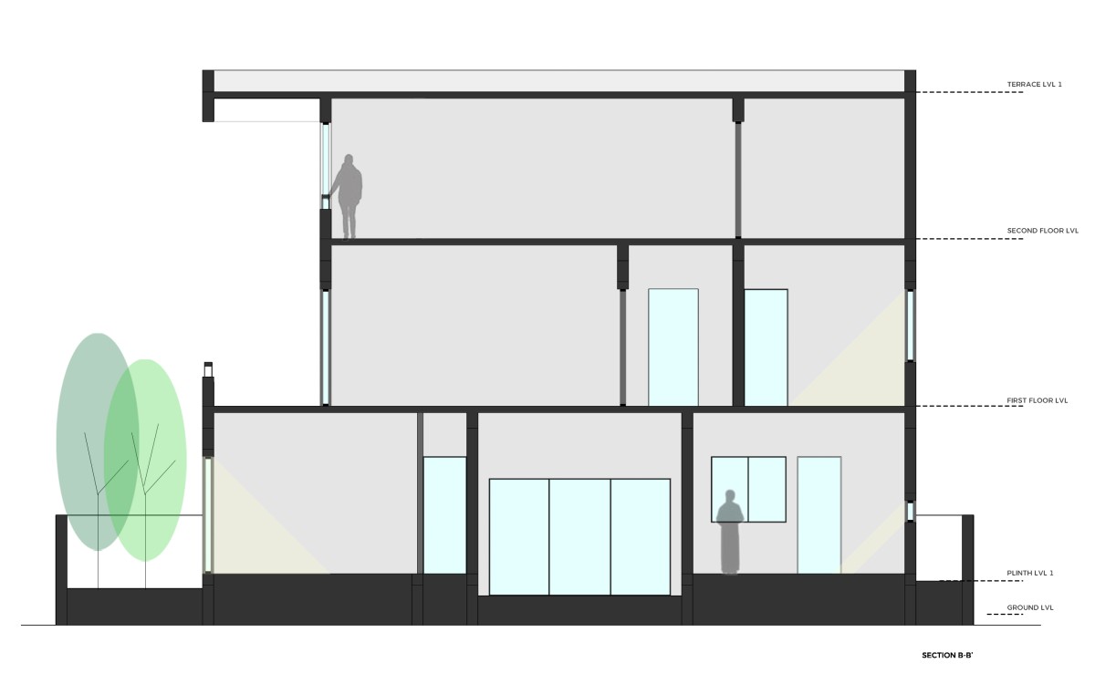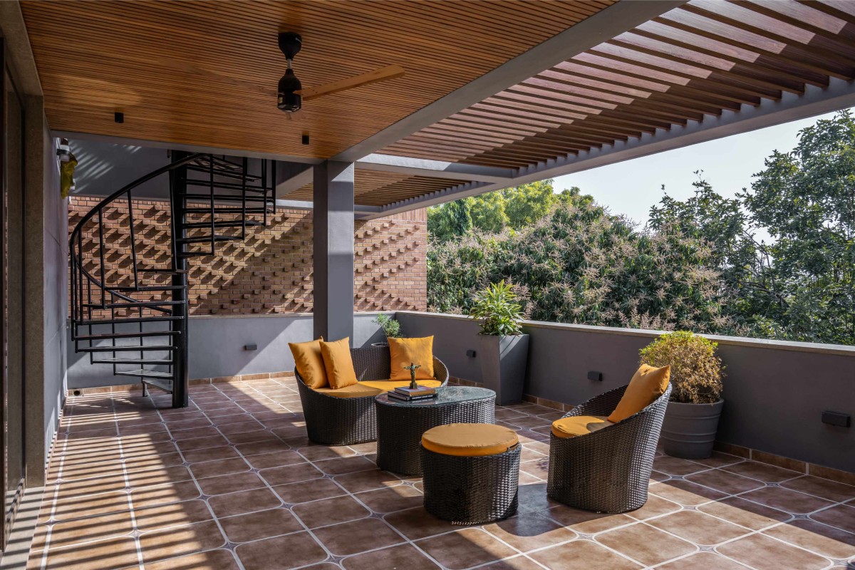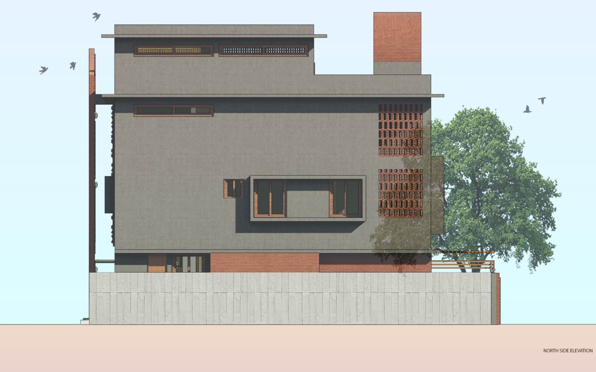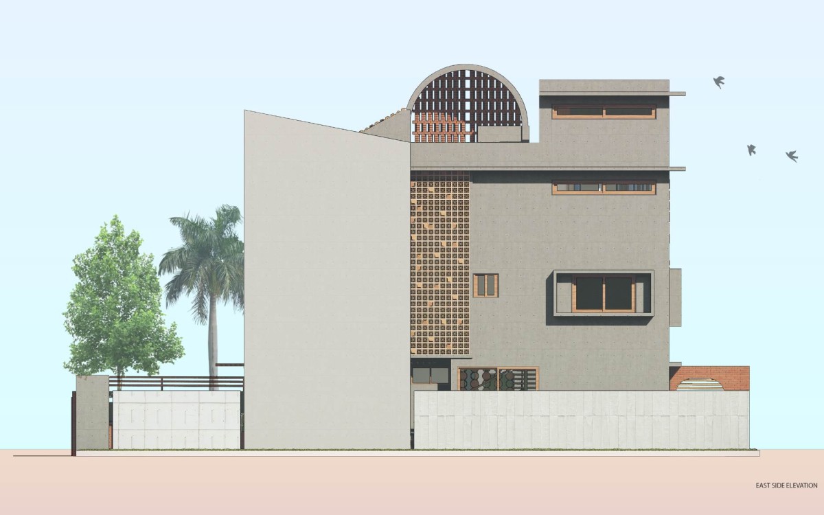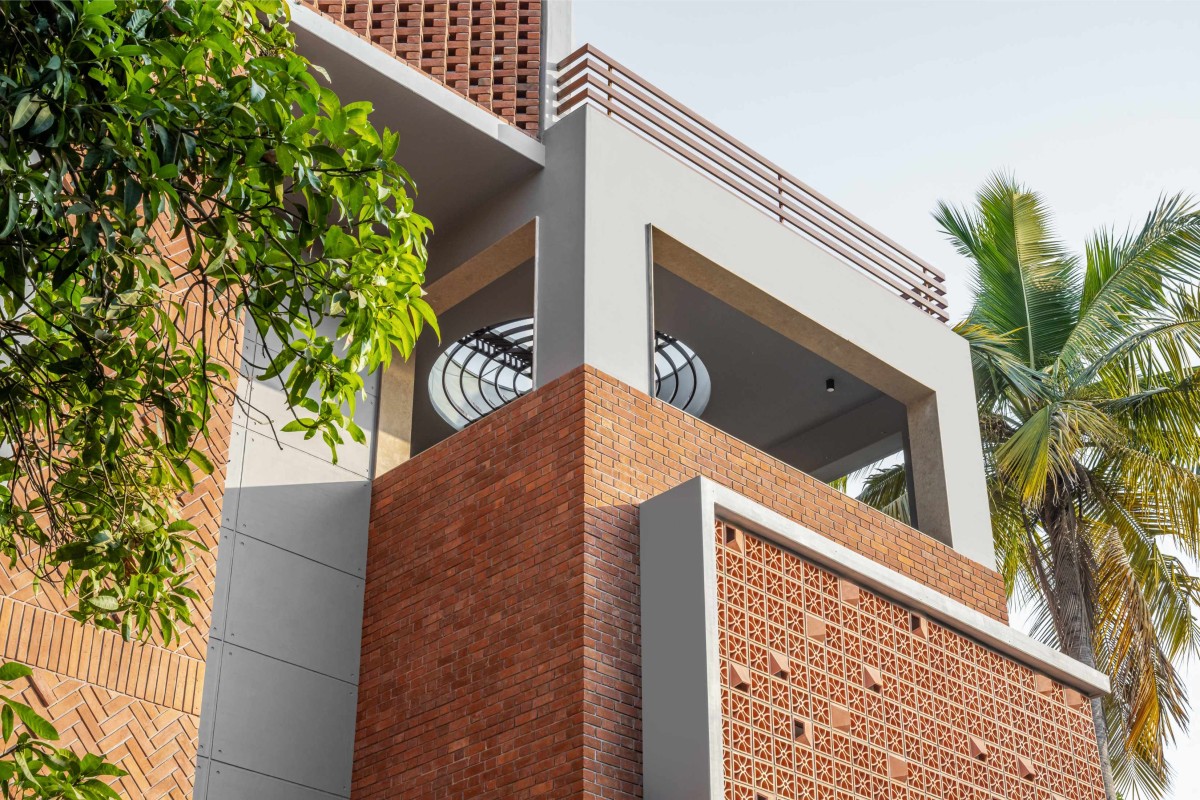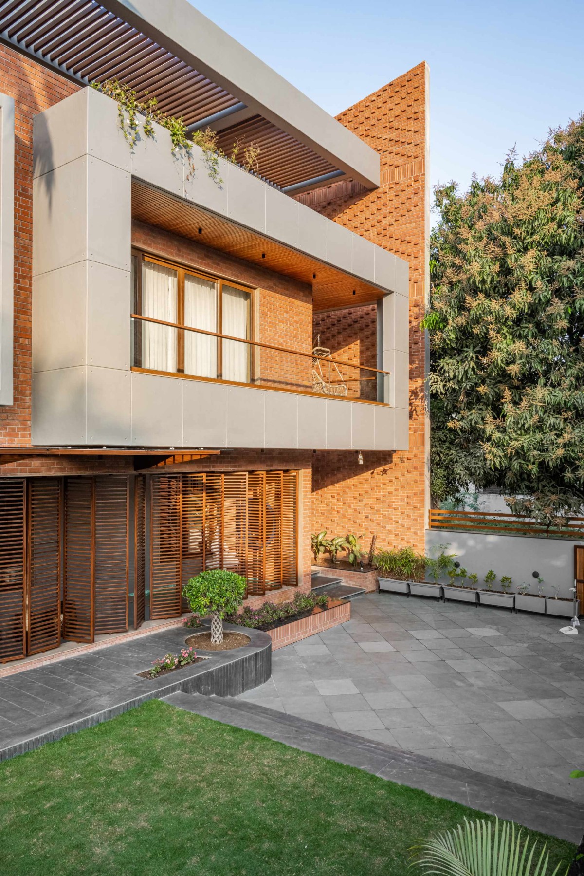 A combination of structural and aesthetic elements was used to create a configuration which is dynamic and provides spaces of varying heights, dimensions, and energies. While the central staircase creates visual lines between the floors above, it also gives way to a double height living room. Sweeping high ceiling makes up for a double height balcony in one of the first-floor bedrooms. The brick wall runs tall on the eastern façade of the building, providing a needed balance to the massing while also creating a focal point for the main circulation areas in the house, on all the floors.