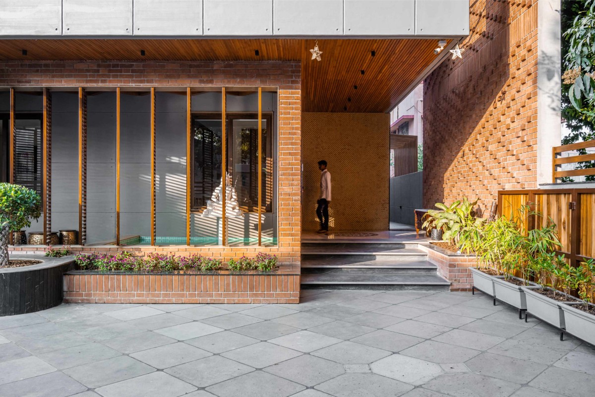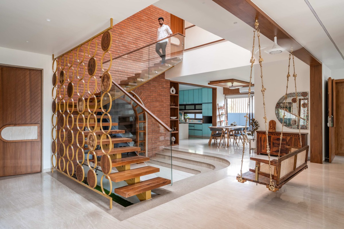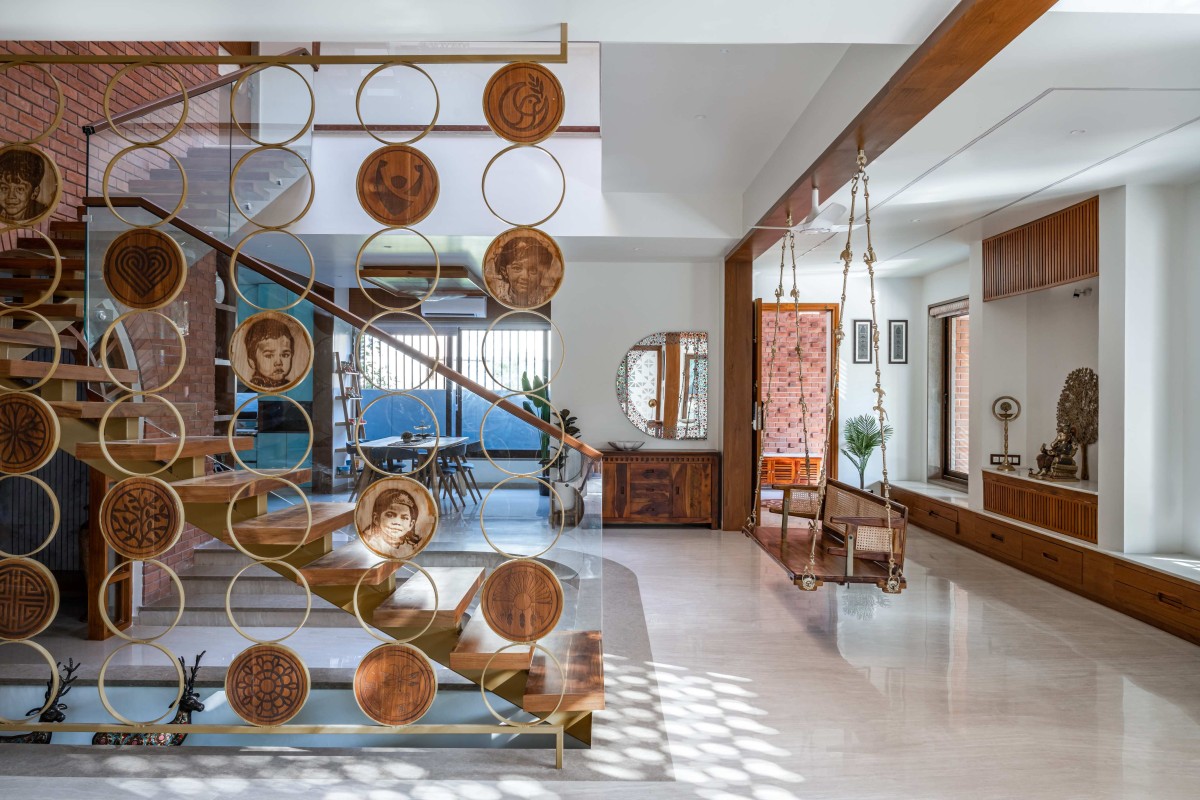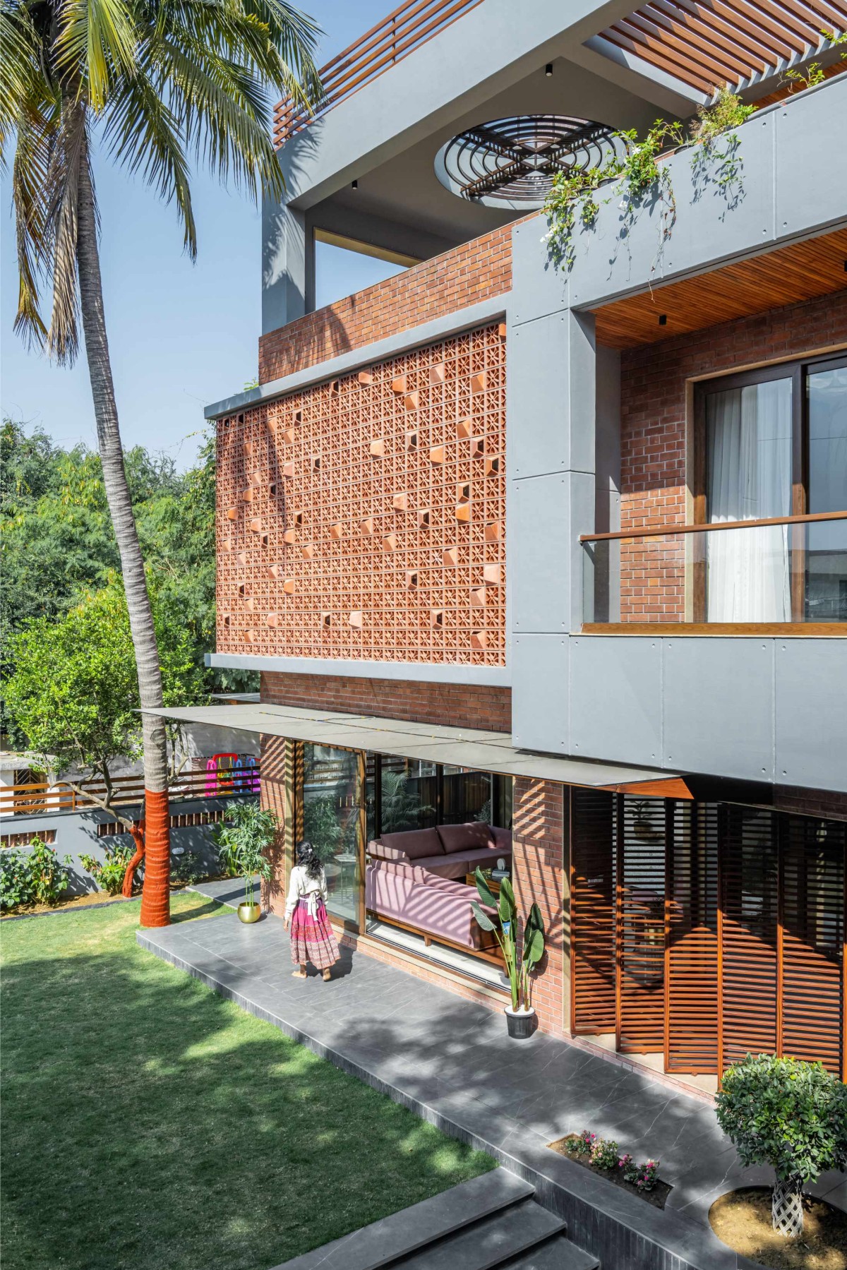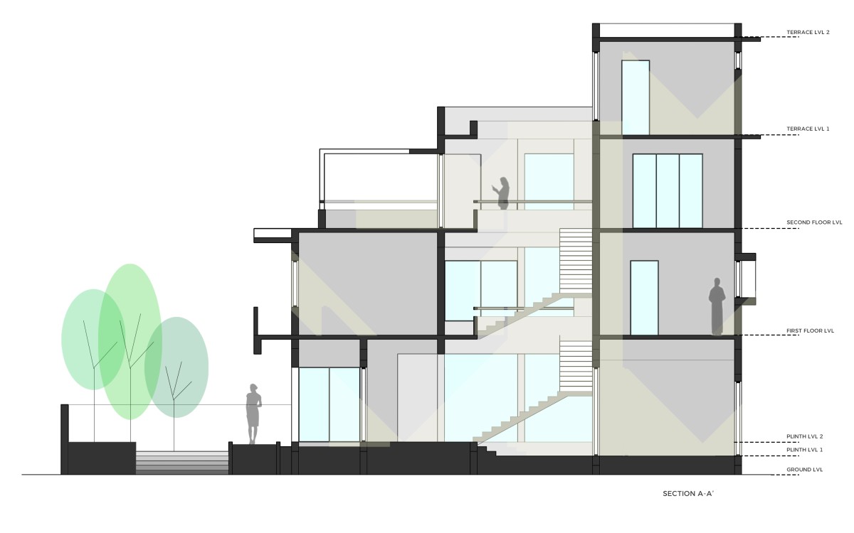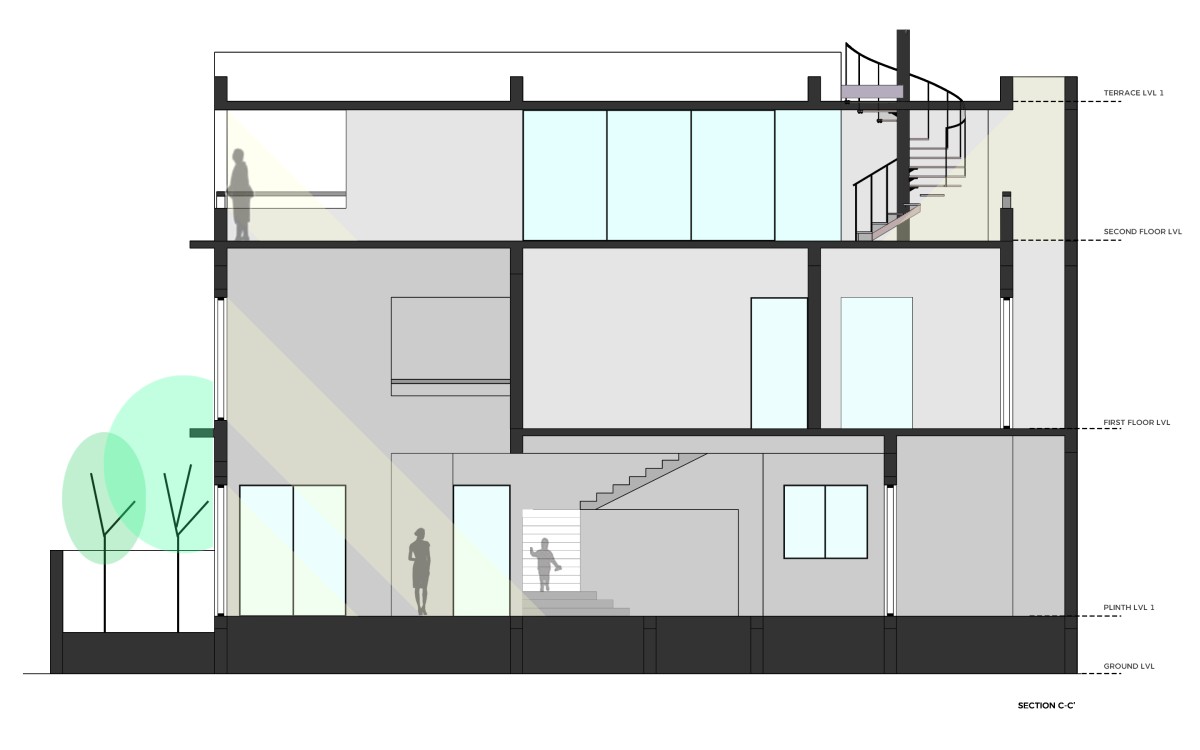 A combination of structural and aesthetic elements was used to create a configuration which is dynamic and provides spaces of varying heights, dimensions, and energies. While the central staircase creates visual lines between the floors above, it also gives way to a double height living room. Sweeping high ceiling makes up for a double height balcony in one of the first-floor bedrooms. The brick wall runs tall on the eastern façade of the building, providing a needed balance to the massing while also creating a focal point for the main circulation areas in the house, on all the floors.