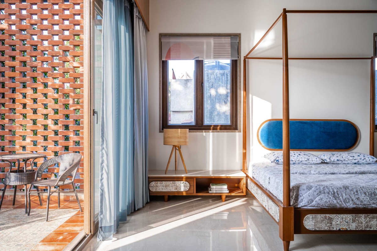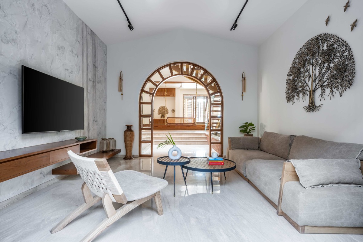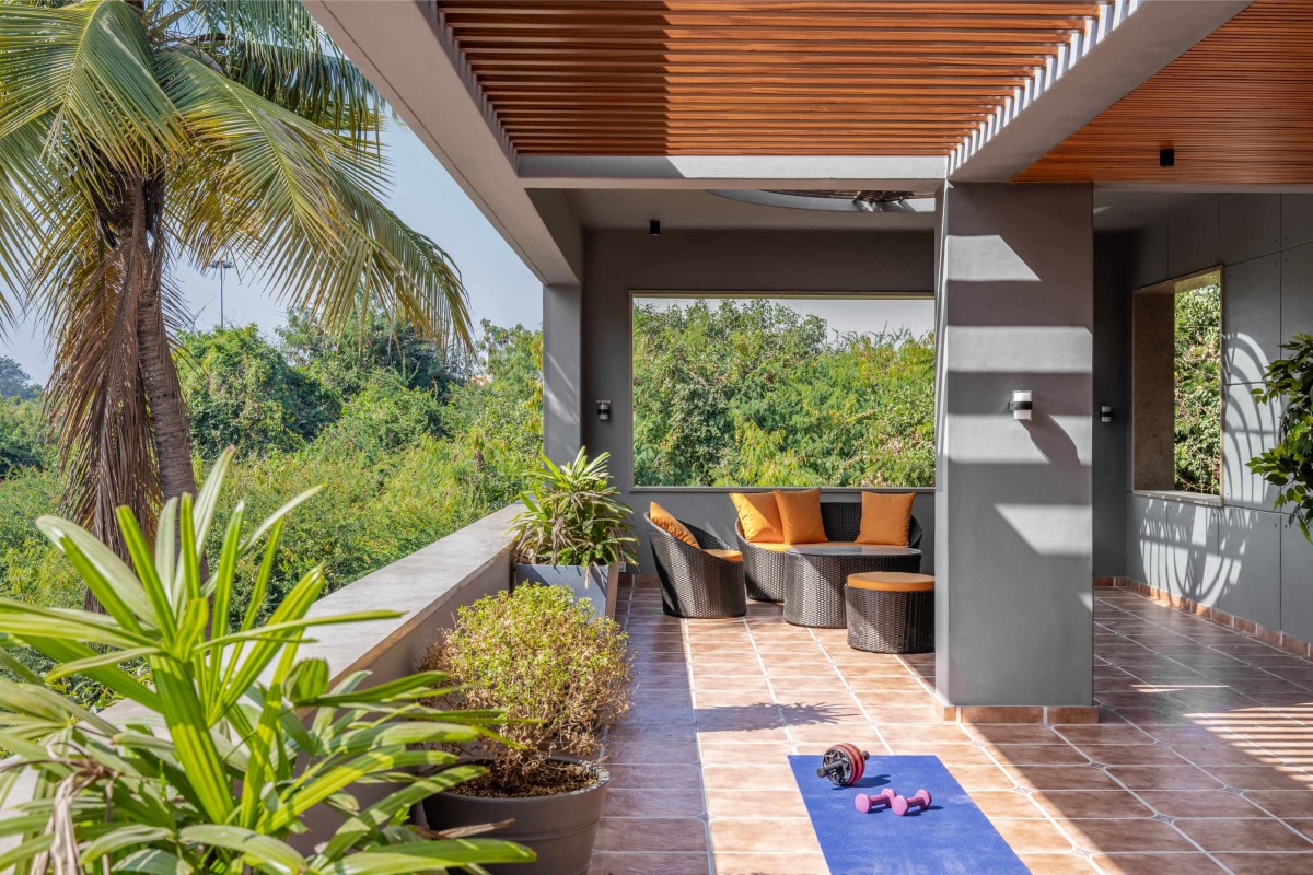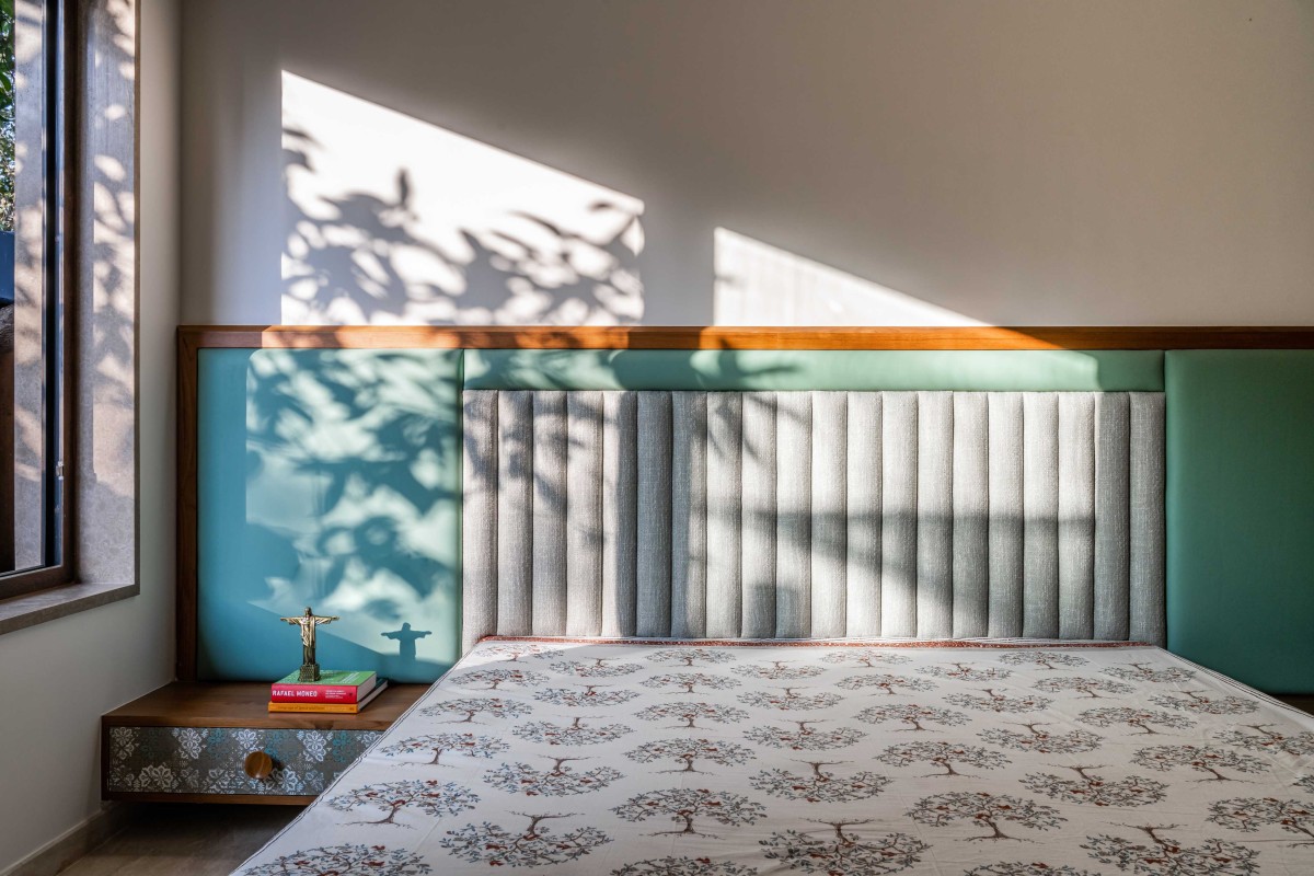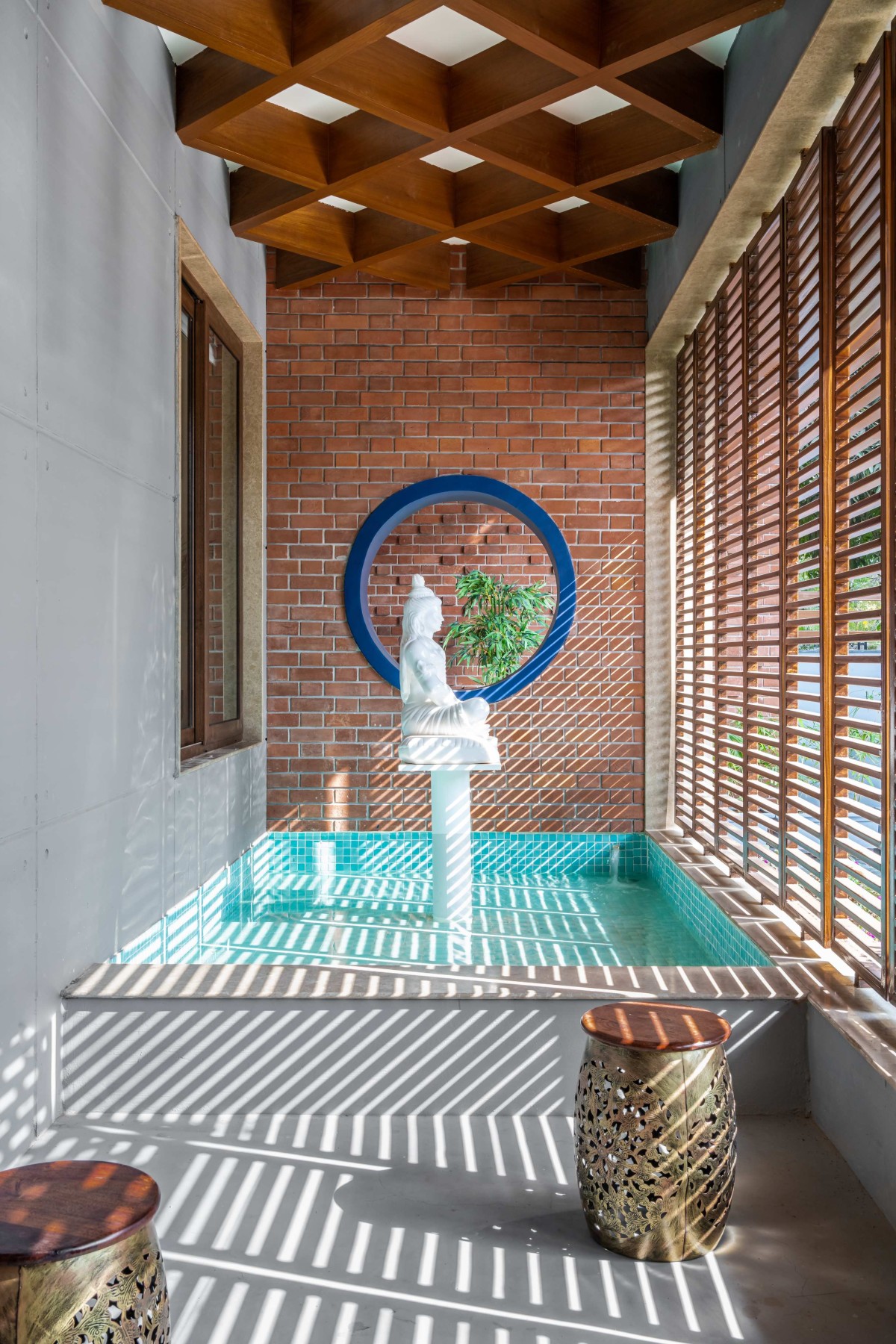 A combination of structural and aesthetic elements was used to create a configuration which is dynamic and provides spaces of varying heights, dimensions, and energies. While the central staircase creates visual lines between the floors above, it also gives way to a double height living room. Sweeping high ceiling makes up for a double height balcony in one of the first-floor bedrooms. The brick wall runs tall on the eastern façade of the building, providing a needed balance to the massing while also creating a focal point for the main circulation areas in the house, on all the floors.