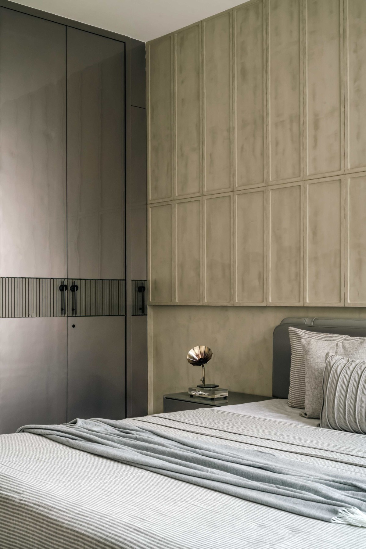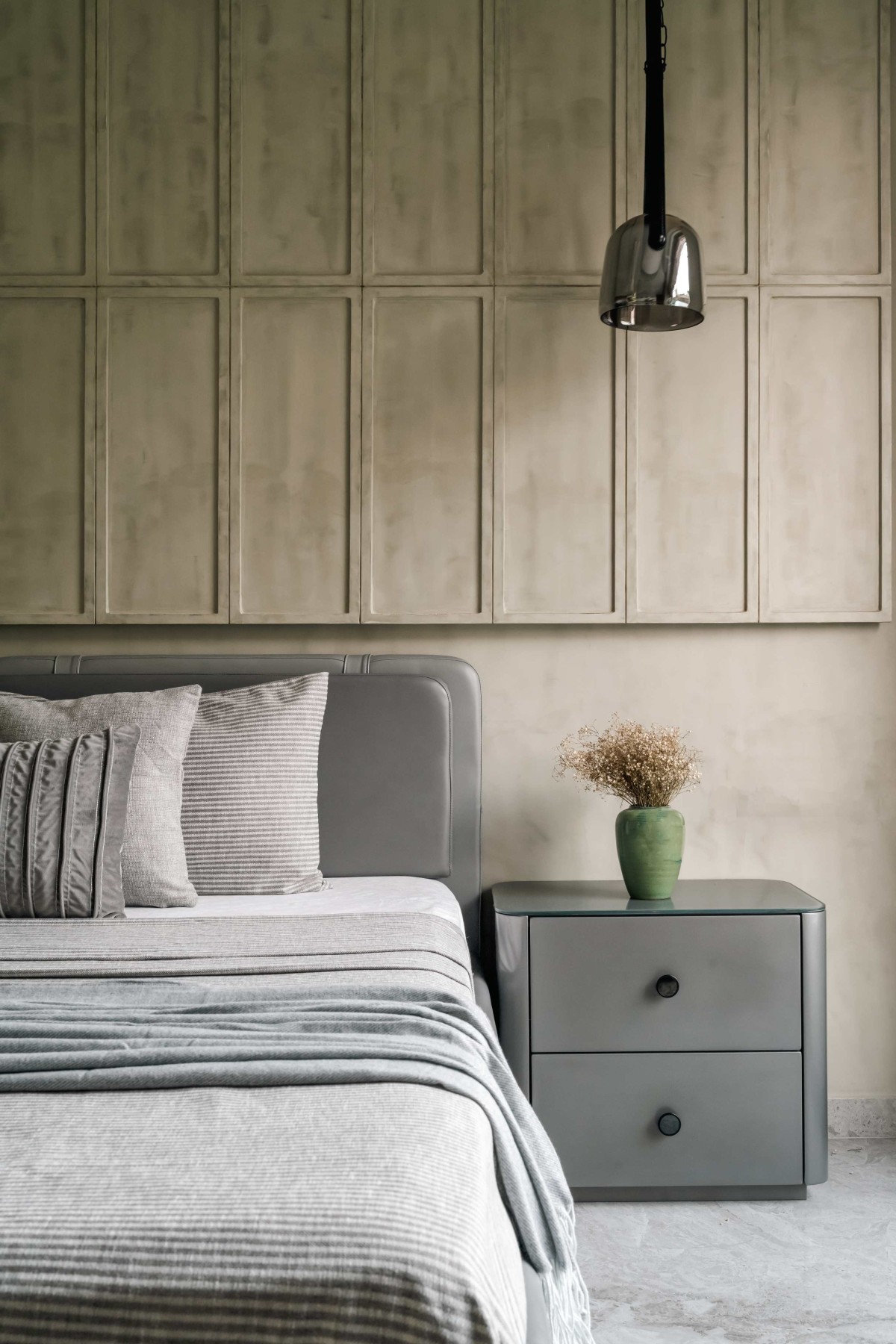 The guest bedroom exudes tranquility, designed with a focus on subtle sophistication. The muted concrete-finished wall panels create a refined backdrop, lending depth to the space while maintaining a minimalist aesthetic. The gray leather bed, adorned with textured cushions and paired with matching bedside tables, adds a touch of contemporary elegance. Softly illuminated by a sleek pendant light, the space feels warm and inviting. This carefully curated room combines calm tones, layered textures, and practical elegance, ensuring a serene yet stylish retreat for guests.