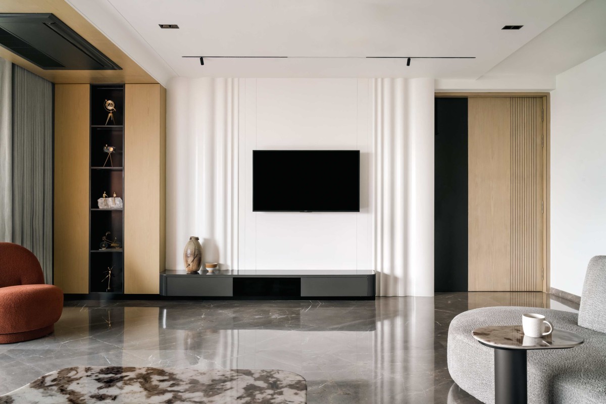 TV Unit of 4BHK Apartment at Akshar Iland By Scj Architects & Interior Designers