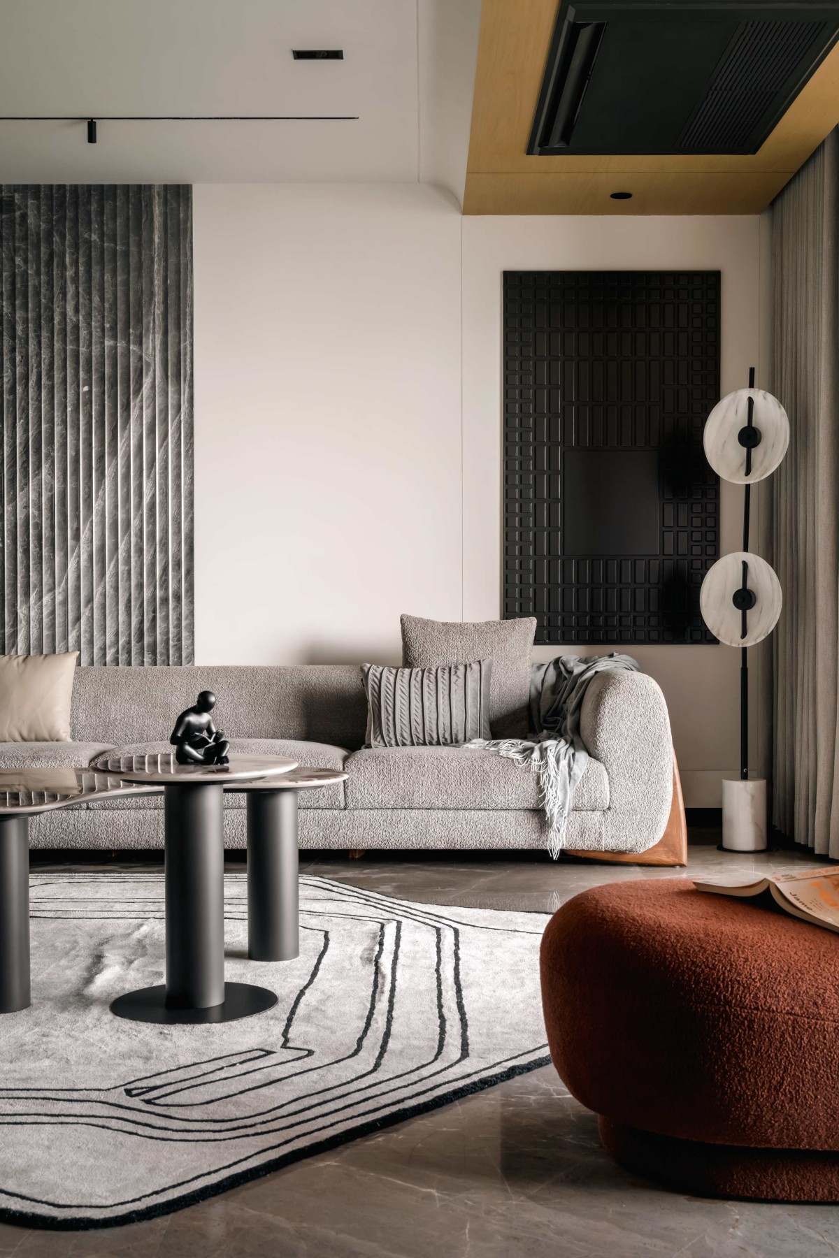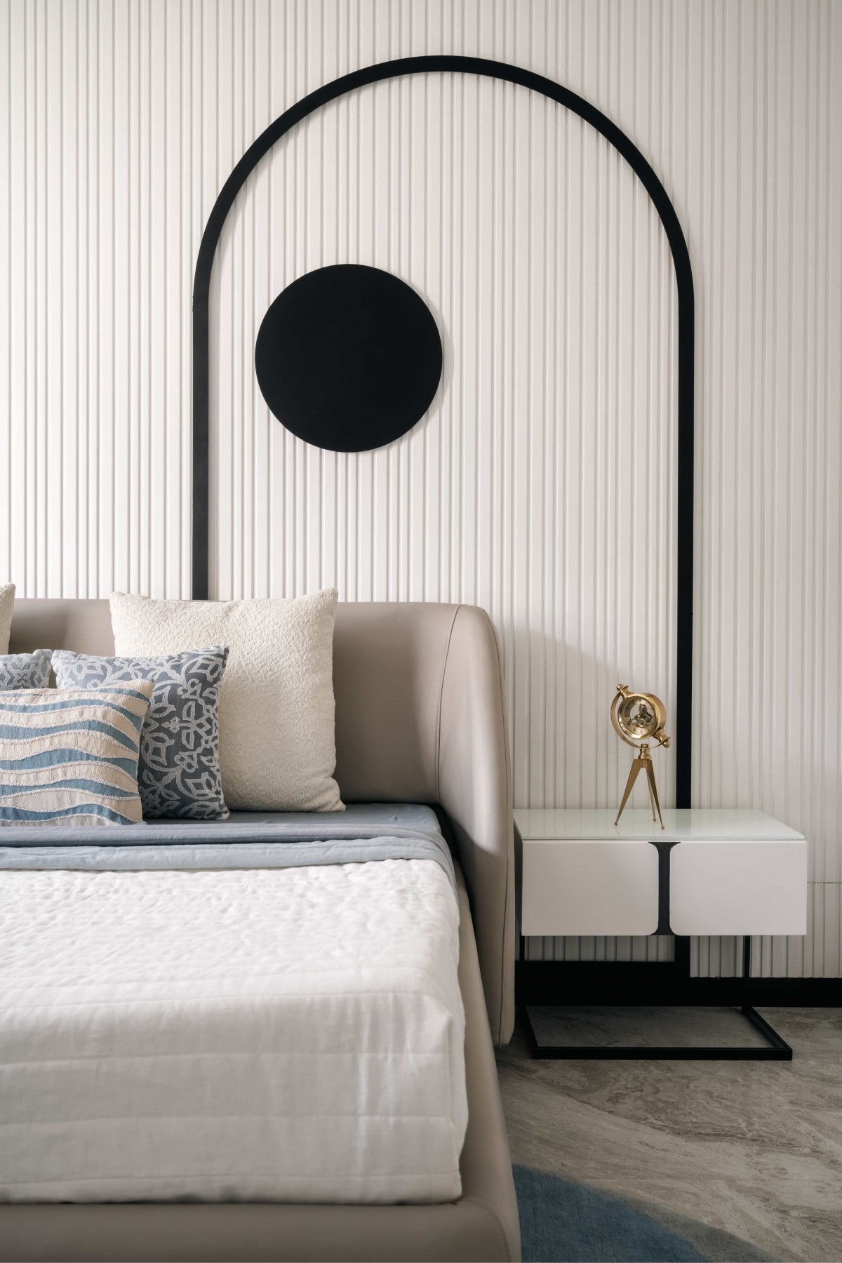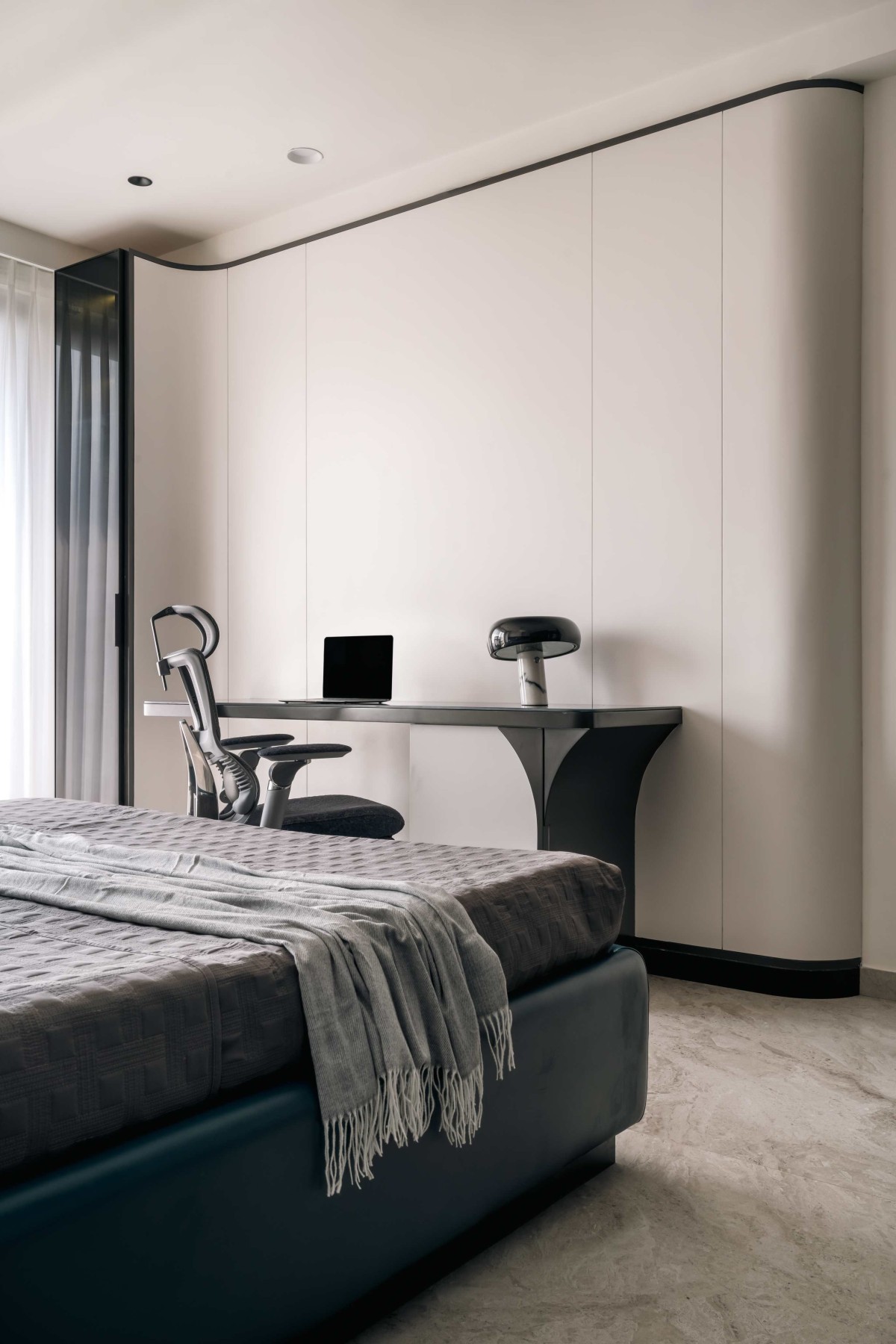 Complementing the curves, the minimalist headboard and wardrobe continue the theme of understated elegance, ensuring the room feels spacious yet cozy. Every detail, from the carefully curated materials to the delicate accents, is designed to reflect a balance of practicality and aesthetic charm, making it a space where creativity and comfort seamlessly converge.
