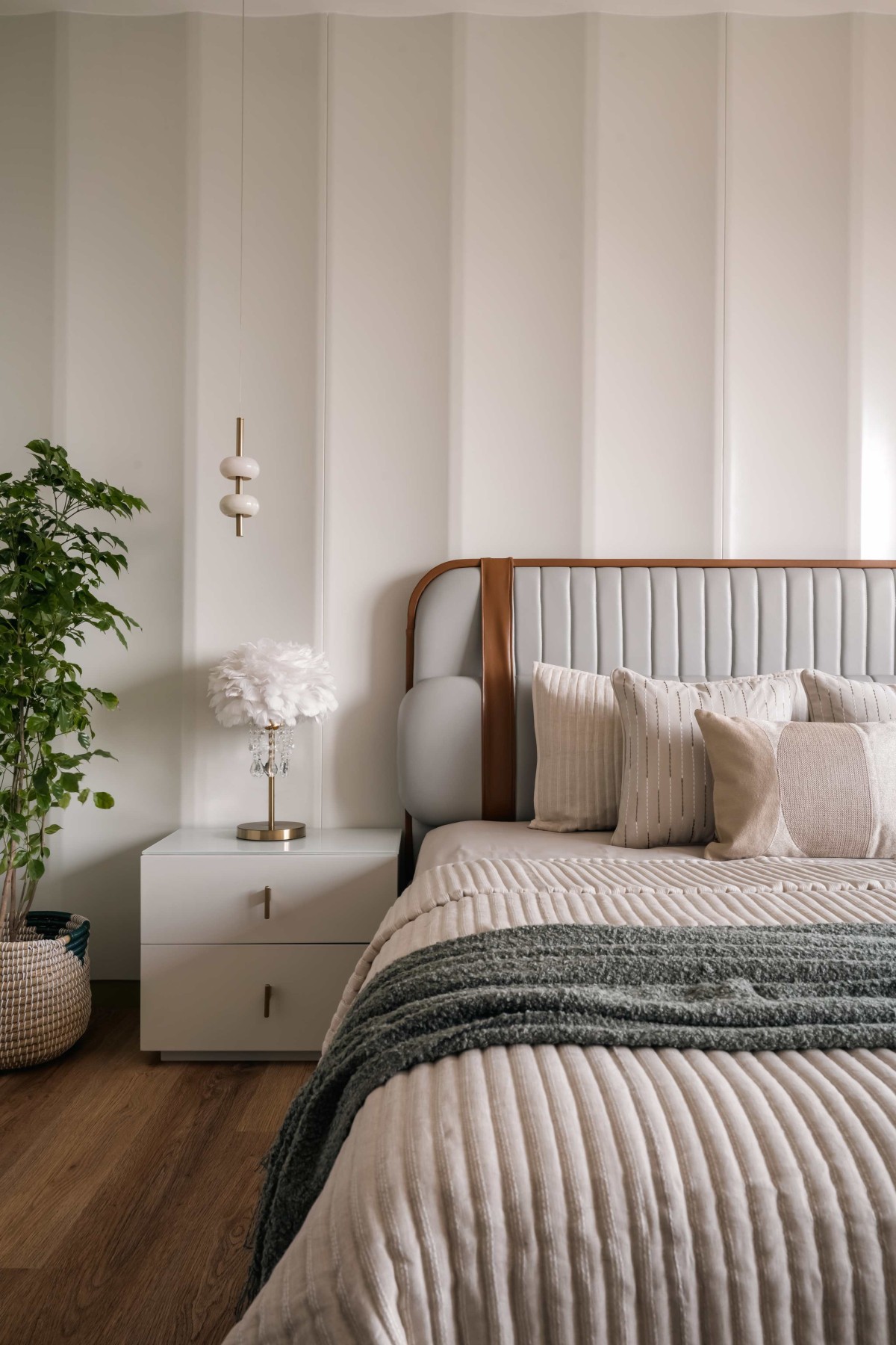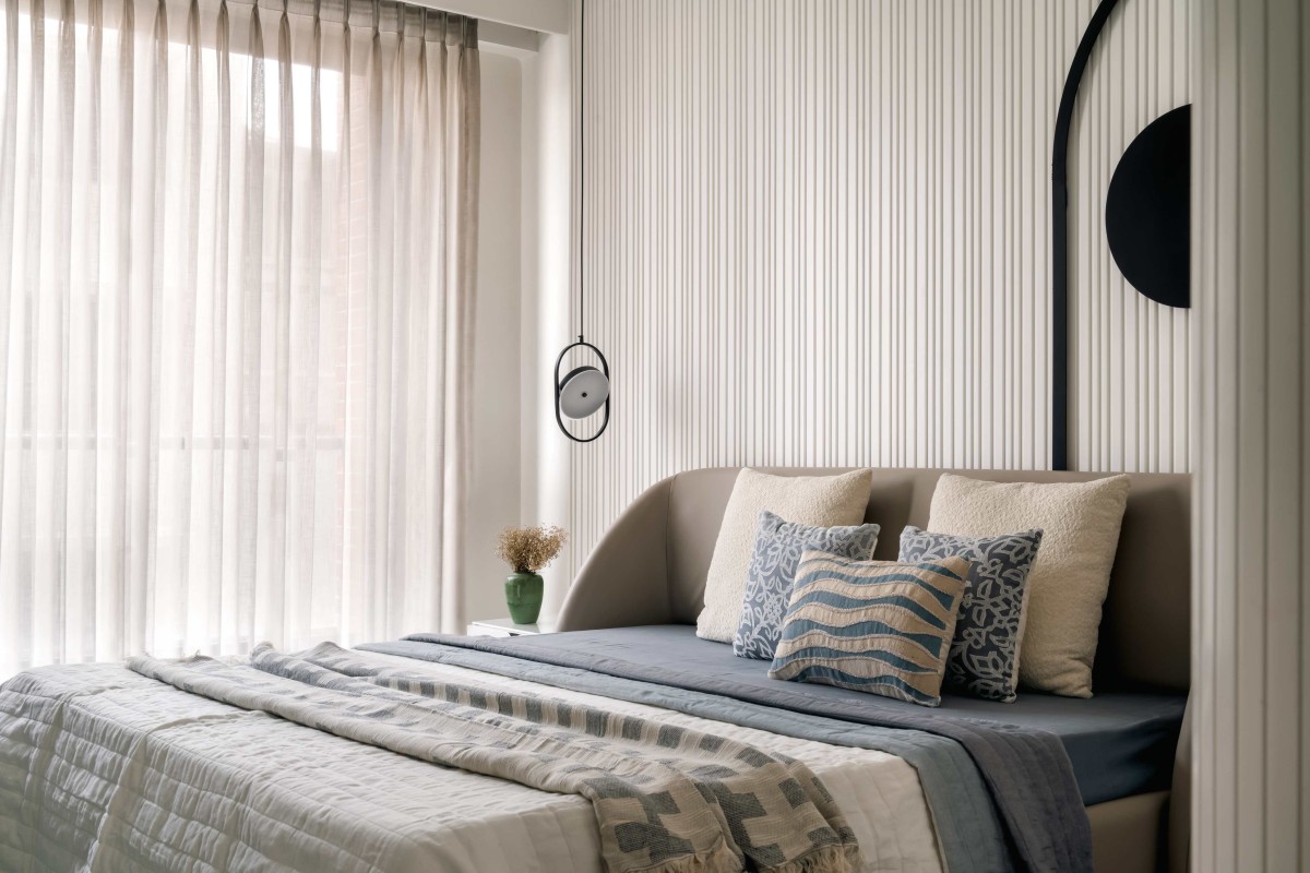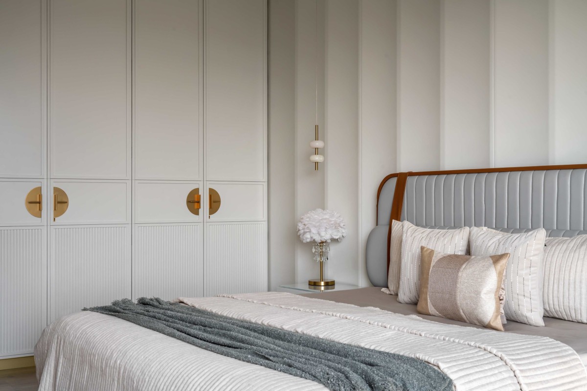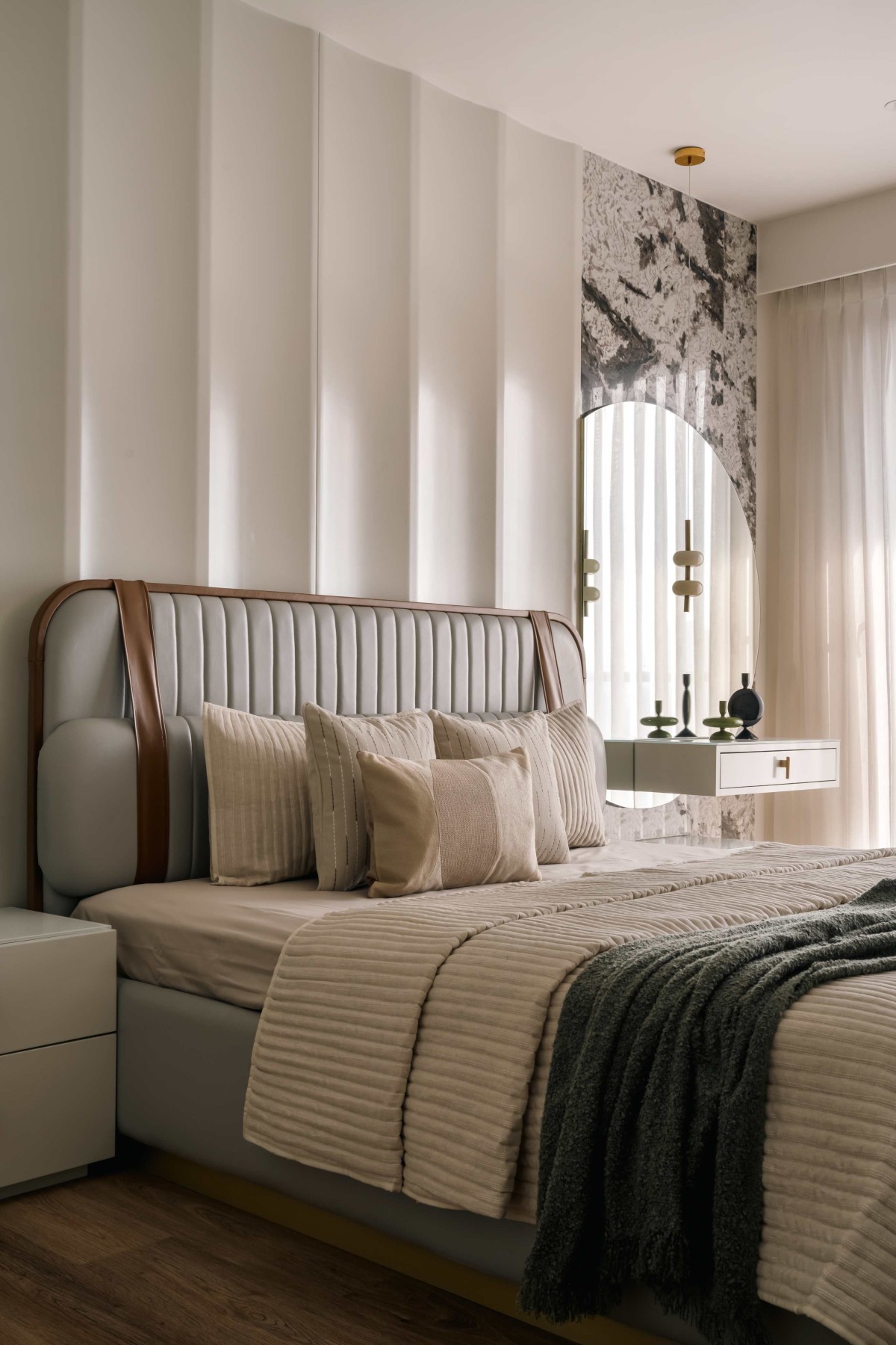 The master bedroom exhibits understated luxury, with its timeless design and a warm, neutral palette that fosters relaxation. The room's standout feature is the custom-crafted headboard, blending leather and wood for an elegant yet cozy feel. Vertical paneling on the walls adds texture and height, complemented by soft, ambient lighting fixtures that create a soothing atmosphere. Carefully selected accessories, like the sculptural golden accents and lush greenery, inject character without overwhelming the space. The console unit, featuring fluted detailing, marries form and function while reinforcing the room’s refined aesthetic. Natural light filters through sheer curtains, enhancing the organic tones of the wooden flooring and harmonizing with the serene ambiance. This bedroom is a harmonious blend of comfort and sophistication, embodying a sanctuary tailored for relaxation and rejuvenation.