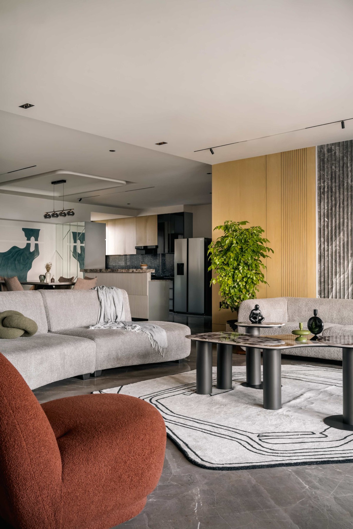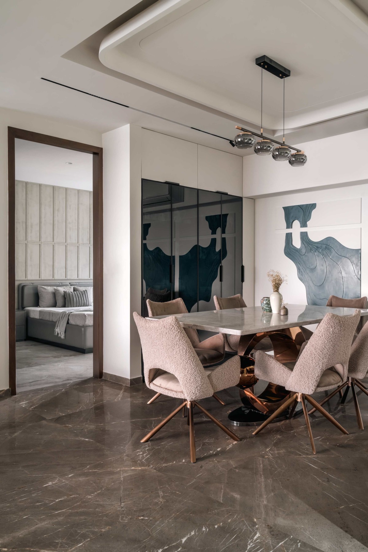 Adjacent to the living room, the dining area exudes elegance and intimacy. The sleek marble-top dining table rests atop a sculptural metal base, creating a dramatic centerpiece. Surrounding it, contemporary upholstered chairs add softness and comfort. Above, a striking linear chandelier with metallic finishes adds a glamorous touch, perfectly harmonizing with the abstract wall art that brings an artistic sensibility to the space. The dining area balances form and function, offering an ideal setting for family dinners and stylish entertaining.