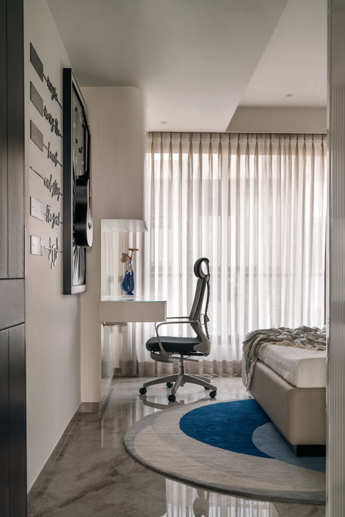 The daughter's bedroom emanates a sense of calm elegance, embracing a modern design approach with subtle artistic elements. The space is thoughtfully curated to balance functionality and aesthetic appeal. The workstation, compact yet efficient, is seamlessly integrated into the room, framed by soft, translucent drapery that invites natural light to create a tranquil work environment. A playful yet sophisticated color palette of whites and blues enhances the youthful energy while maintaining an understated charm. The textured wall and minimalist decor bring a sense of depth, while the circular rug adds a dynamic focal point, unifying the room's layout. Every element, from the ergonomic chair to the bespoke artwork, celebrates individuality and style, making it a serene retreat tailored to the daughter’s personality and needs. The room is a celebration of youthful grace, designed to inspire and nurture.