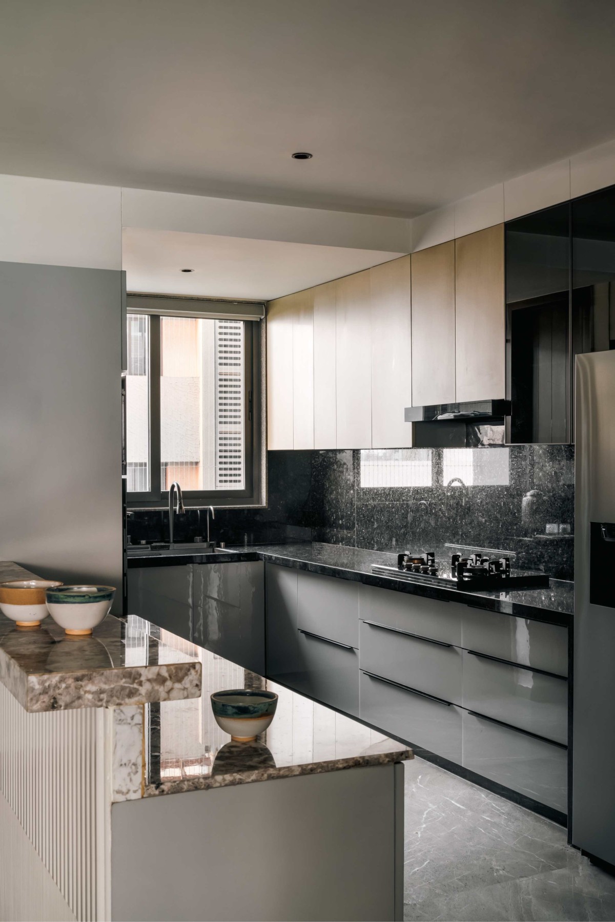 Anchored by a monochromatic palette, the interplay of volga blue granite countertops and muted cabinetry establishes a sophisticated yet inviting tone. The vertical fluted details on the island counter introduce a touch of texture and craftsmanship, softening the modern aesthetic.