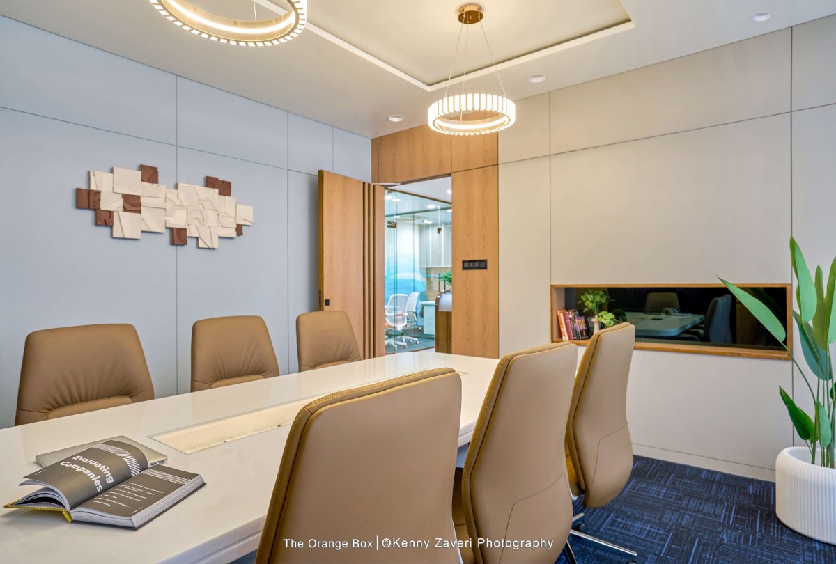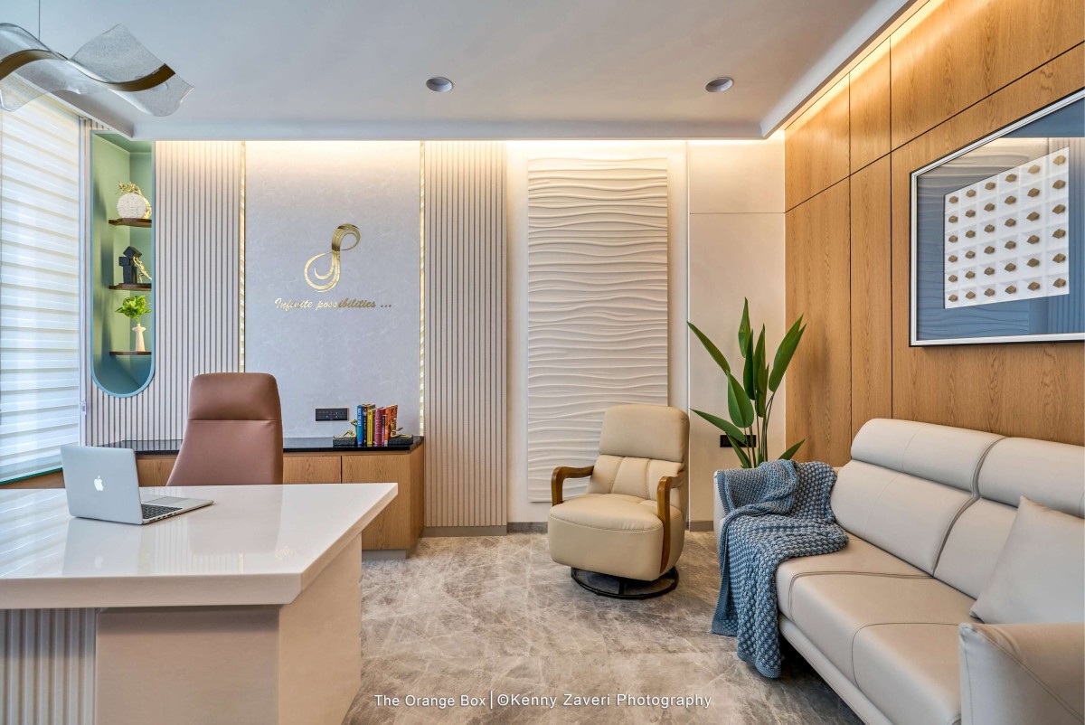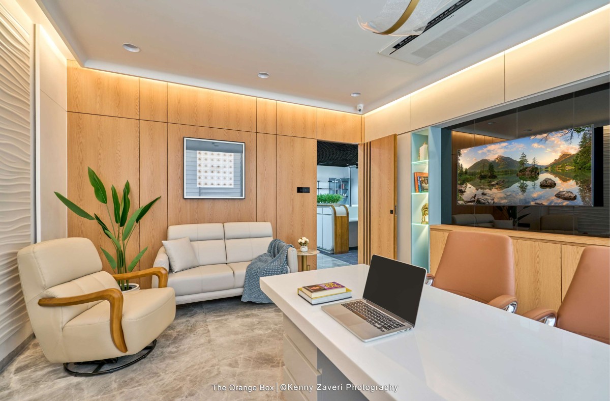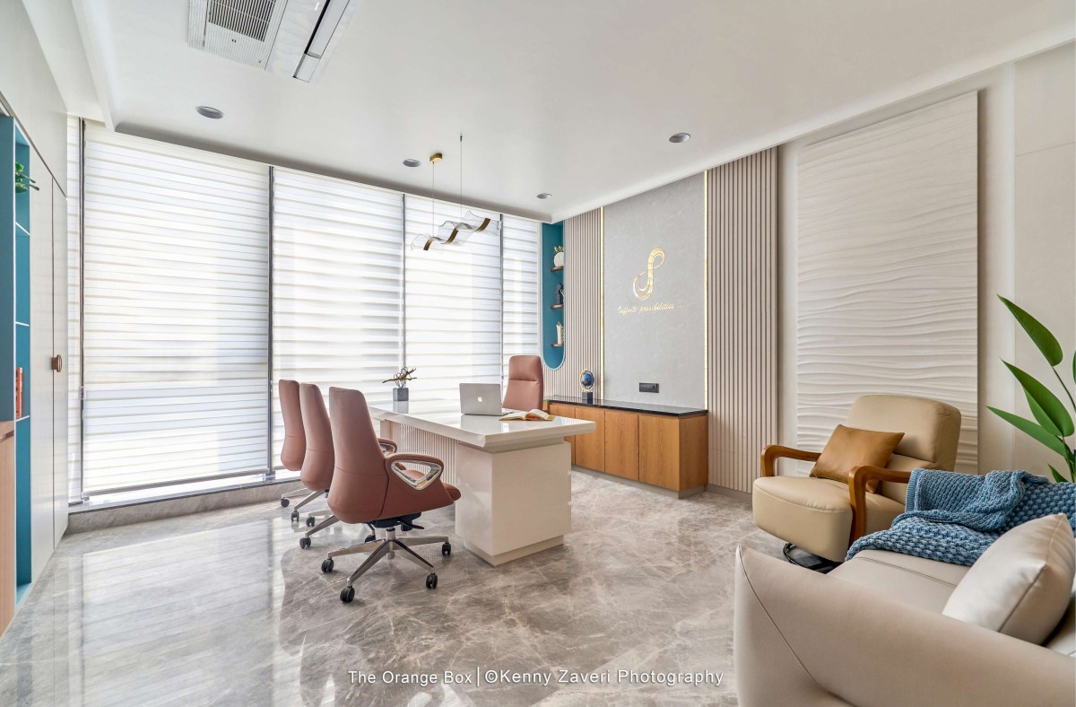 The director’s cabin, also located along the external face of the site, receives ample natural light that can be easily controlled as needed. Soft colors and warm materials are used throughout the space, creating a cozy and inviting atmosphere while maintaining a sense of professionalism and functionality.