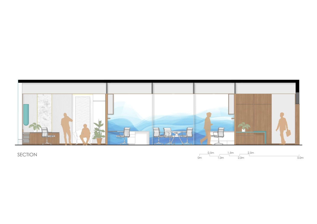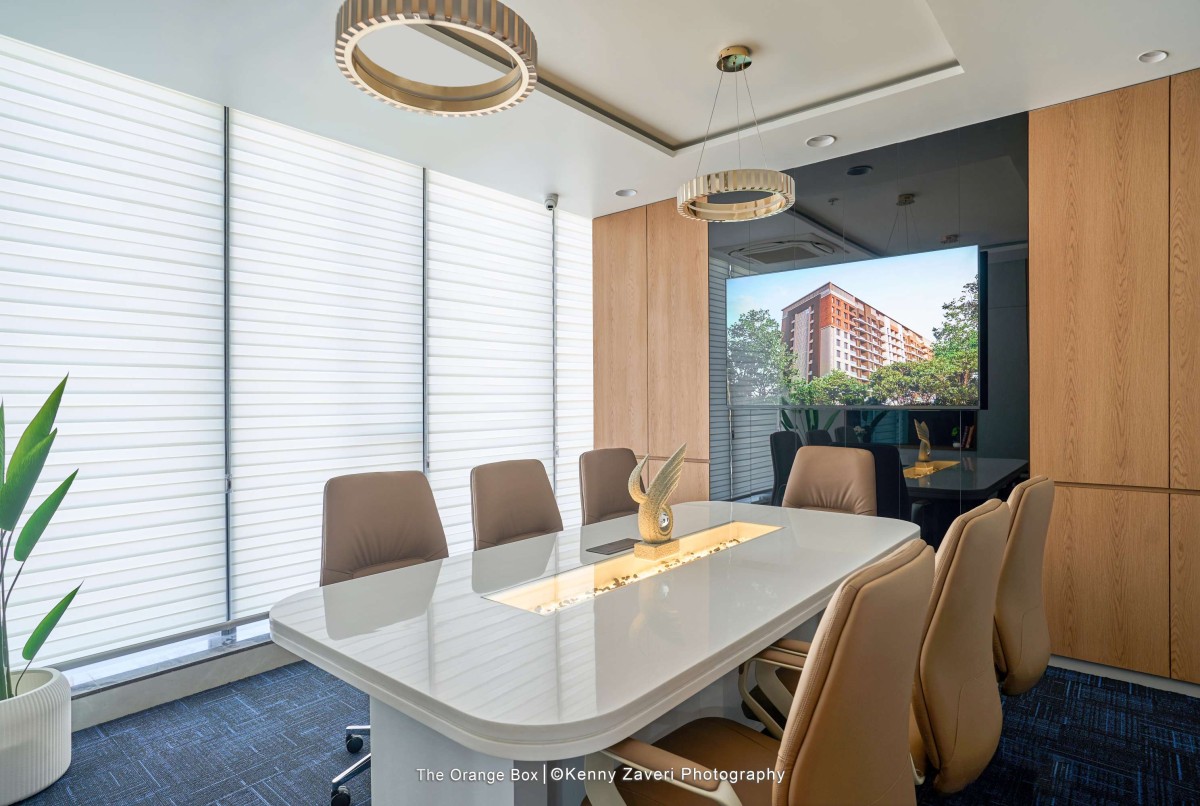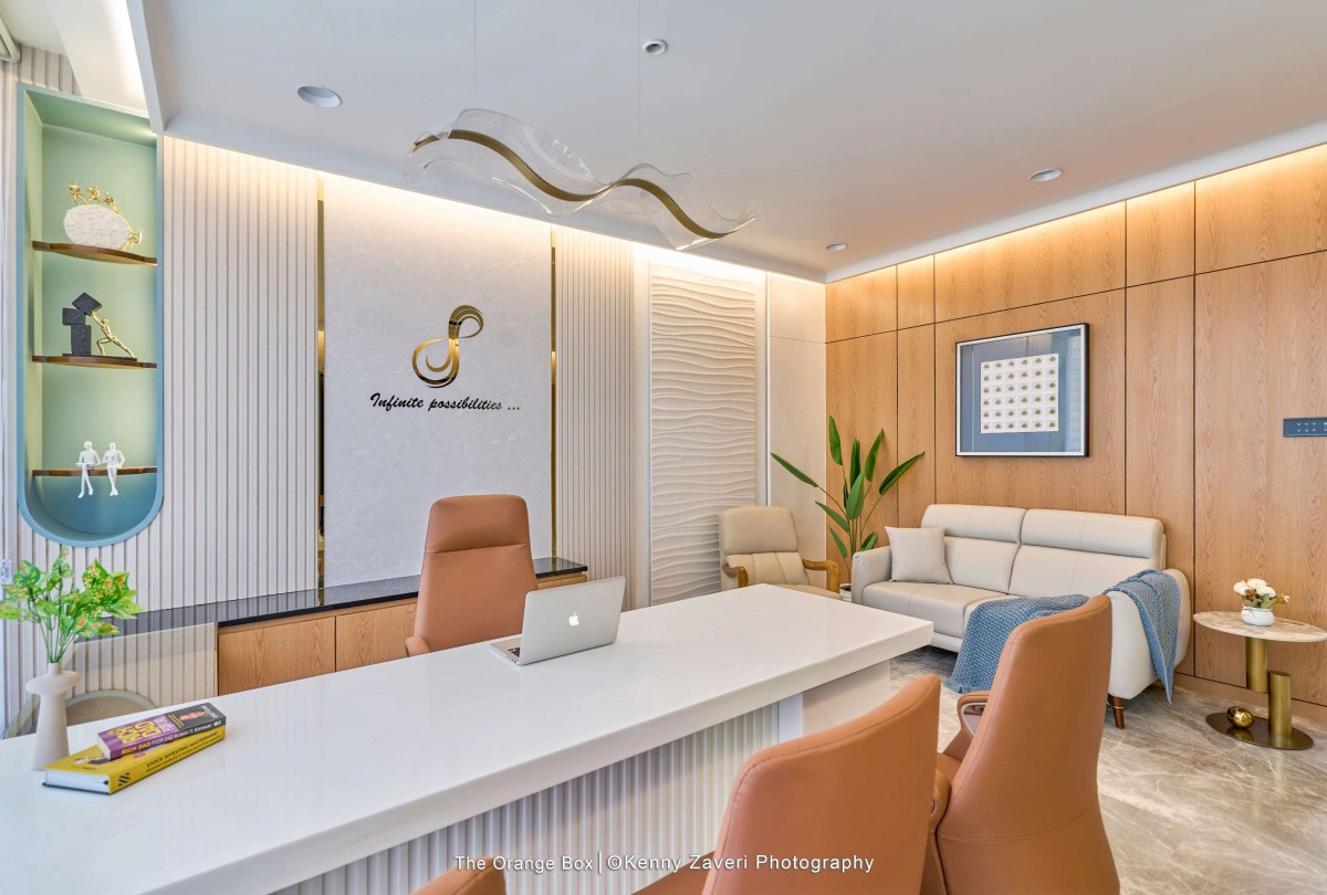The director’s cabin, also located along the external face of the site, receives ample natural light that can be easily controlled as needed. Soft colors and warm materials are used throughout the space, creating a cozy and inviting atmosphere while maintaining a sense of professionalism and functionality.