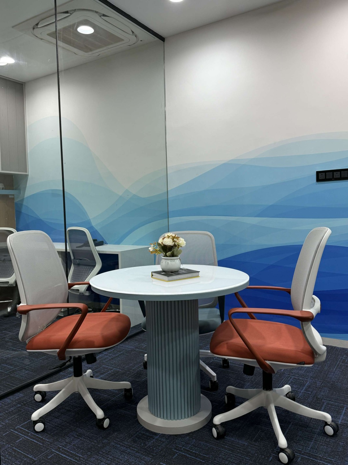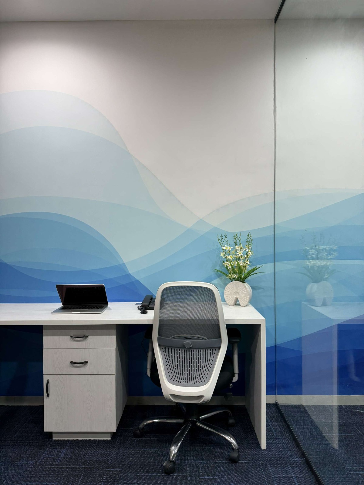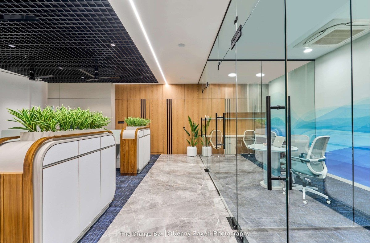 Our design solution focused on transforming the workspace into a bright, inviting, and efficient environment that enhances both productivity and comfort. To overcome the challenge of limited natural light, glass partitions and reflective surfaces were strategically placed to maximize brightness and openness, creating a spacious and energizing atmosphere. Planters integrated into storage cabinets along the passage add a refreshing touch of greenery, softening the overall look and making the environment more pleasant for employees. A bright blue wallpaper framed by three work cabins serves as a vibrant focal point, bringing character and liveliness to the space. Together, these elements of colour, light, and greenery create a balanced and contemporary workspace that supports focus, collaboration, and creativity.