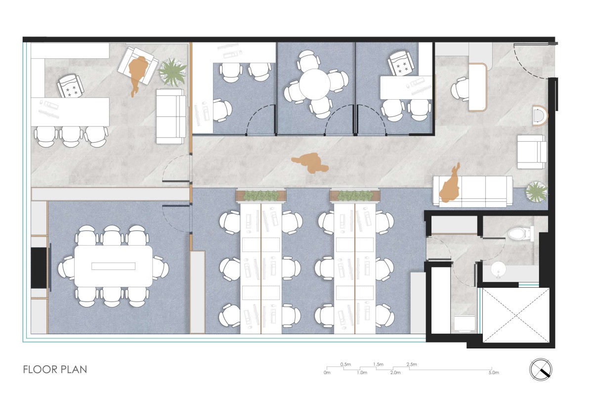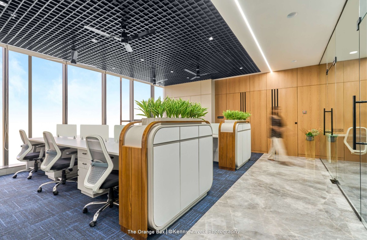 The staff work area, partitioned by the planter-integrated storage units, is situated along the external edge of the office, allowing ample daylight to flood the workspace. The flooring transitions to a blue carpet, enhancing the aesthetics while functionally demarcating the work zone and aiding in acoustic comfort by reducing ambient noise.