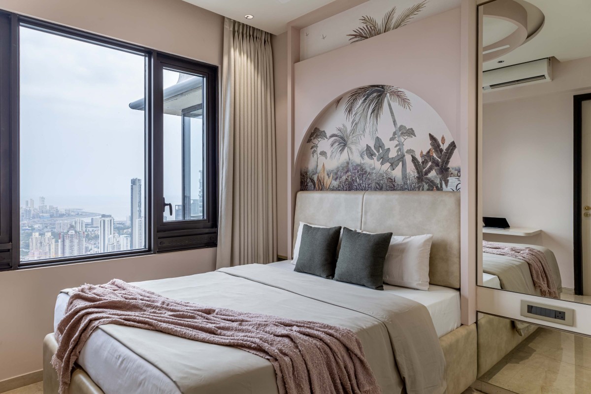 The primary bedroom opens up to expansive views of the city skyline. Bathed in natural light, the calm, neutral palette enhances the tranquillity of the space, offering a quiet retreat for the couple. The simplicity is intentional this room prioritises rest, clarity, and connection to the world outside.