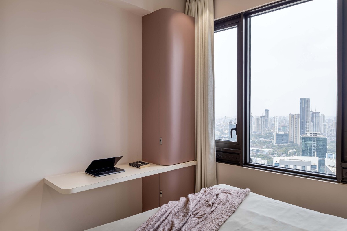 The daughter’s bedroom shifts the narrative to something softer and more whimsical. A circular ceiling detail and arched headboard panel introduce a gentle, cocoon-like geometry. A custom curved cabinet and study table maintain the sense of playfulness while ensuring the room remains highly functional and organised perfectly suited to a teenager’s evolving needs.