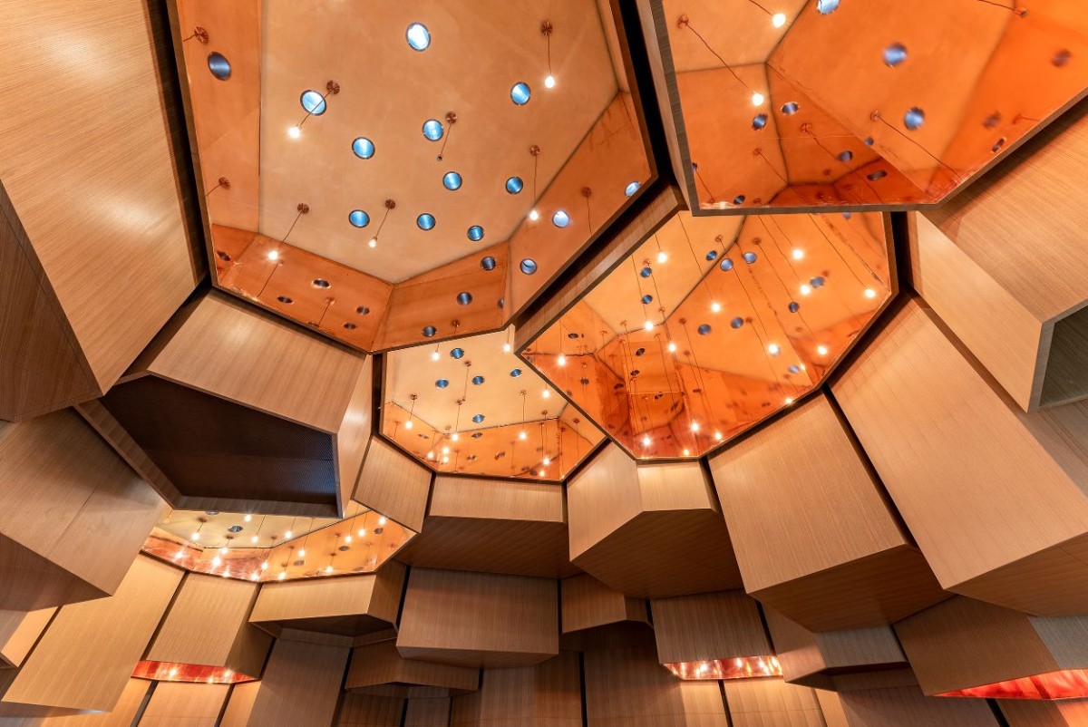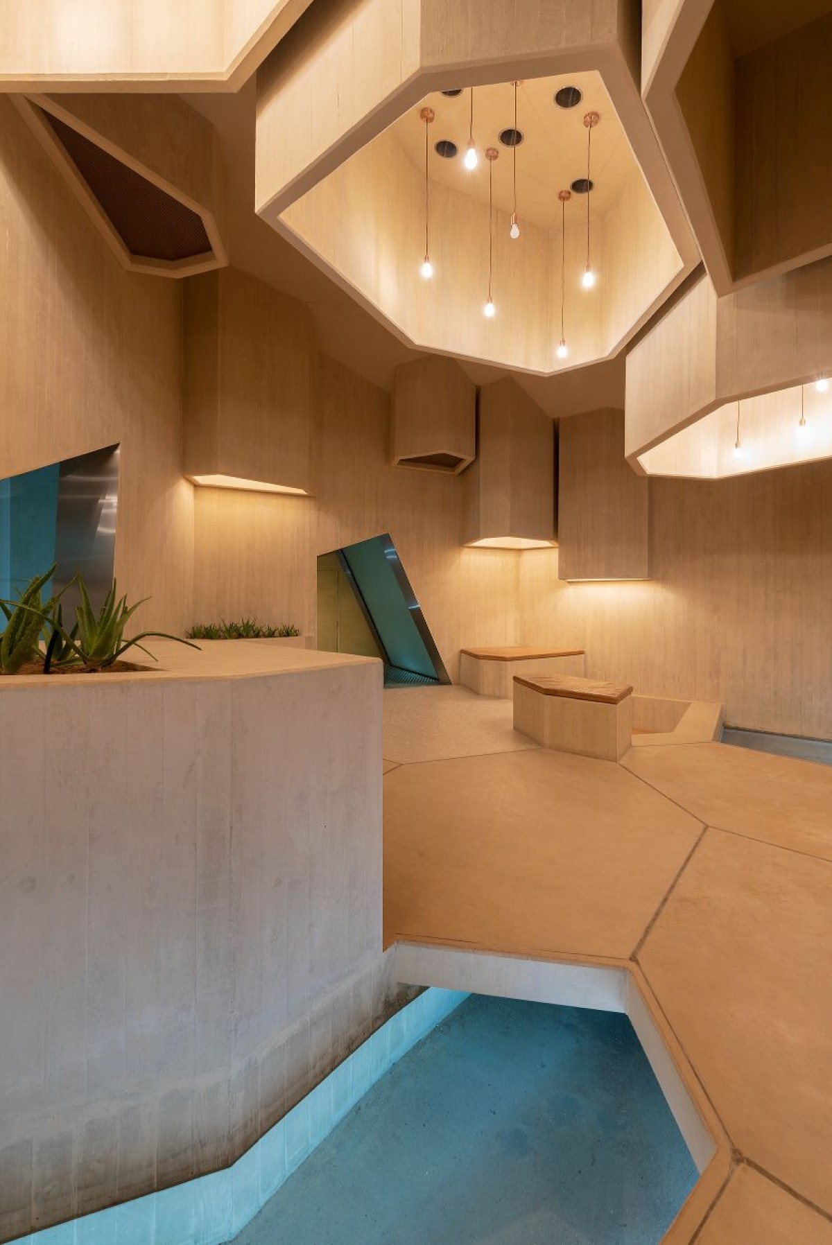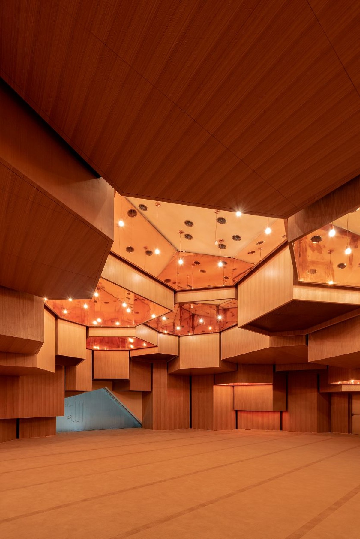 Each volume contains its own function so that the plan layout creates two mirrored flows, where female and male worshippers respectively progress along a sequence of spaces that create an immersive spiritual experience, following the ritual for prayer. Walking from the open landscape of the park along the narrow passages between the “rocks”, the noise and bustling life of the city slowly fades away and visitors enter the cave-like entrance halls, where you can rest and talk before prayers. An experience that refers to the Cave of Hira, where Prophet Muhammed received his first revelation. From here, one proceeds to the ablution spaces for washing and mentally preparing for prayer and finally reaches the large prayer halls. The prayer halls are orientated in the qibla direction, while a concrete relief with inscriptions appears on one of the rock volumes, visible through a window that is concealed from the outside.